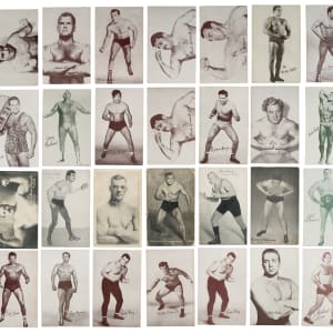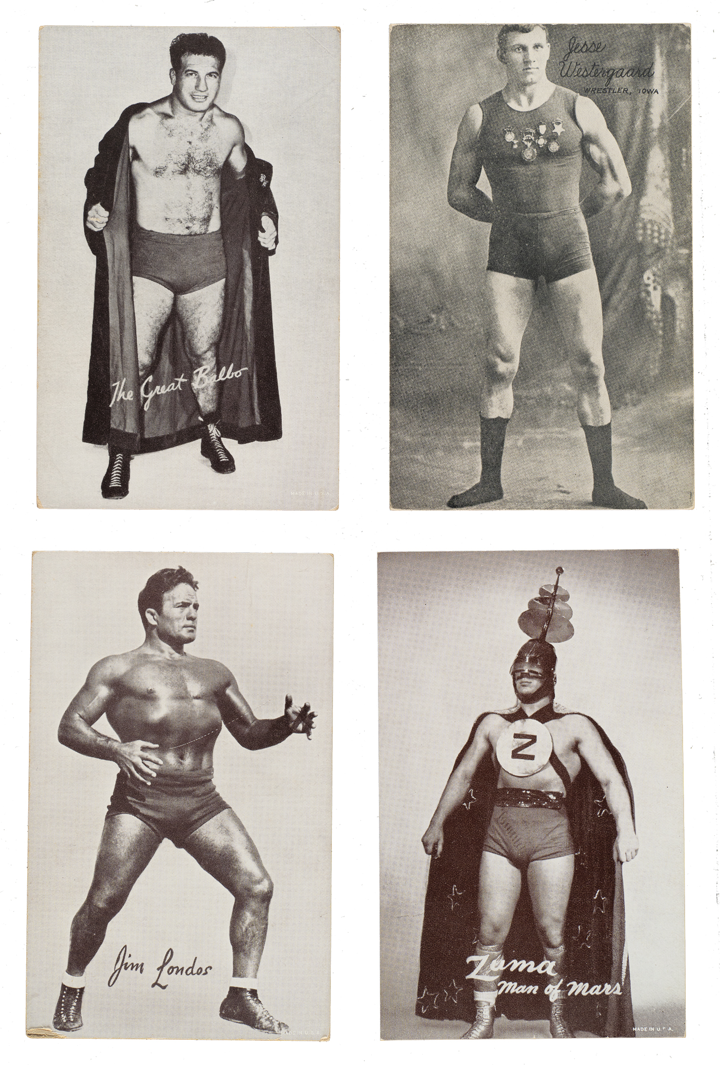 Impressive collection of 62 wrestling cards from various Exhibit-card sets issued during the 1920s through the 1960s. This collection consists of the following: 1) 1921 Boxing Exhibits Complete Wrestling Subset (6 cards): Condition is two Vg-Ex, two Vg, Fr-Gd, and Pr. The 1921 set features 58 boxers and 6 wrestlers. Offered are all six wrestlers (Aberg, Caddock, Silva, Westergaard, S. Zbyszko, and W. Zbysko). 2) 1930s (3 cards): Fr and two Pr. Includes the following: Lutze, O’Mahonney, and Shikat. 3) 1950s Near-Complete Set (32/34) Plus 10 Duplicates: Condition is 25% Ex to Ex-Mt (including a couple Nr/Mt), 50% Vg to Vg-Ex, and 25% lesser. Missing only Checklist and Chief Don Eagle for completion. Includes seven green-tint variations (slightly smaller). Includes: Anaya, The Mighty Atlas, The Great Balbo, Bartu, Brooks, Carnera, Darnell, Don Marlin, Drake, two Gardini, George, Goelz, two Kay, two Leone, Levin, Londos, Mackay, two Millich, three Palmer, two Parks, three Rocca, Rogers (Nature Boy), Savoldi, two F. Schnabel, H. Schnabel, Silverstein, Stanlee, Thesz, Torres, Von Schacht, Williams, and Zuma (Man of Mars). 4) 1960s (7 cards): Two Ex, four Vg-Ex, and Fr due to pencil on reverse. Includes the following: Gagne, Herman, O'Connor, Ortin, Rasputin, Schmidt, and White. 5) 1964 (4 cards): Vg-Ex to Ex+. Includes the following: Drapp, Graham, Jonathan, and O'Connor. An attractive mixed-grade collection of cards from these popular sets with several notable highlights. Total: 62 cards.
