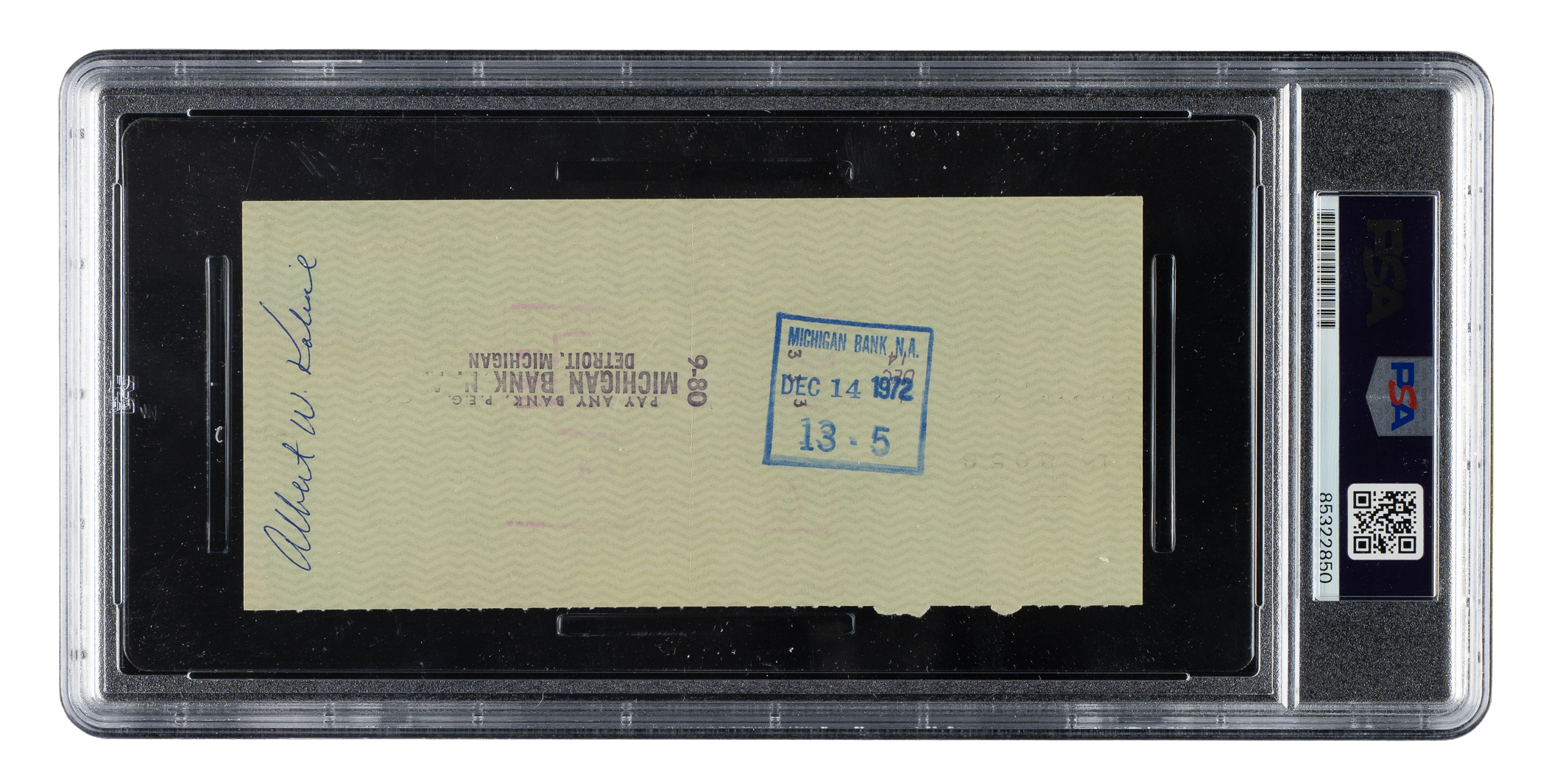 PSA/DNA has encapsulated the check, grading the signature Authentic. Detroit Tigers Hall of Famer Al Kaline.