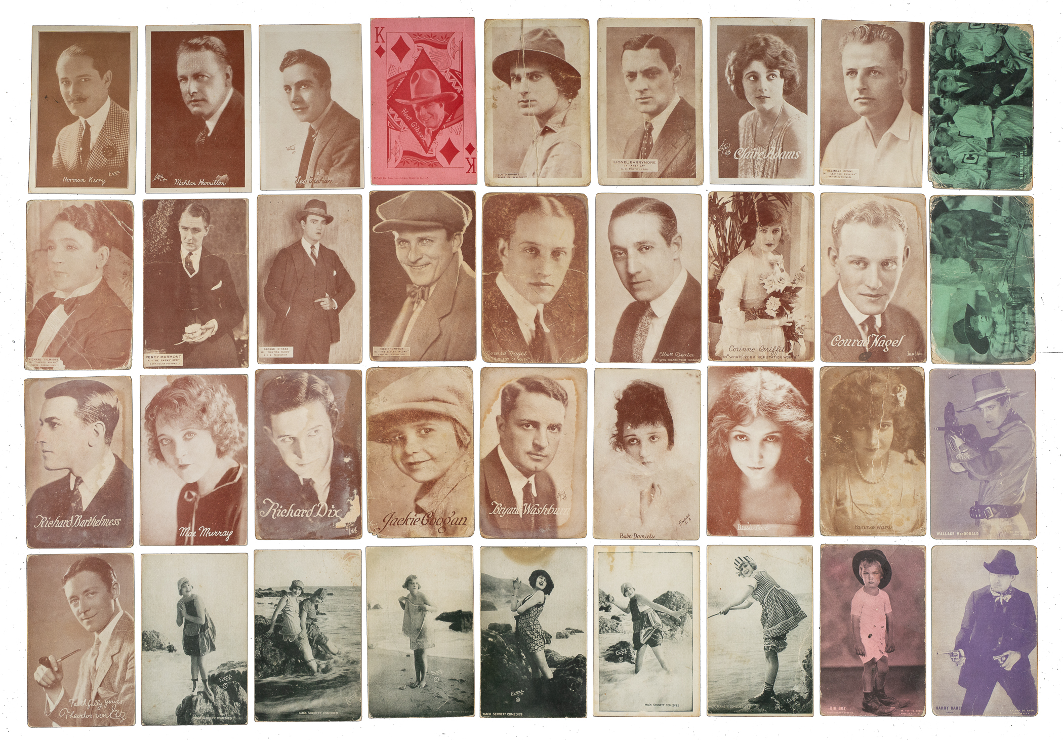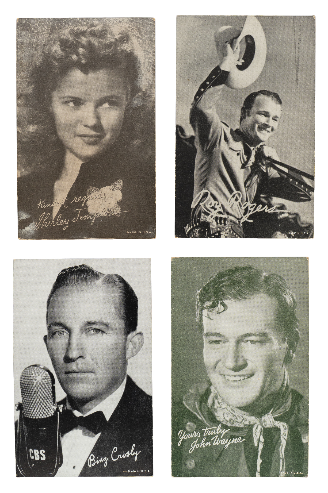 Presented is a collection of 555 Exhibits nonsport cards issued during the 1920s to 1960s. This eclectic grouping consists primarily of movie stars, but also includes some musicians and "pin-up" models. The collection is highlighted by many of the biggest stars in movie history, including Humphrey Bogart, Joan Crawford, Bette Davis, Roy Rogers, and John Wayne, This collection consists of the following: 1) 1920s to 1960s Assorted Series (395): 35% Ex to Ex-Mt (including some Nr/Mt), 45% Vg to Vg-Ex, and 20% lesser (including a couple trimmed). Includes approximately twenty-five exhibits from the 1920s to 1930s (mostly lower grade), with the balance falling in the 1940s to 1960s time frame. Also includes thirty "Pinups" Exhibits from various series, including two Mutoscopes. 2) C. 1940 "Mutoscope Brown Postcards" (34, including 15 different): Ranging from Pr-Fr to Ex (averaging Vg). Includes two blank backs and two black & white tints. 3) 1940s-1950s "Brown 4-in-1" Complete Set (32) Plus Three Duplicates: Ranging from Vg to Ex (averaging Vg-Ex). 4) 1950s "Popular Cowgirls" Near-Complete Set (31/32) Plus Two Duplicates: Vg-Ex to Ex overall. Missing only Dale Evans/arms crossed for completion. 5) 1950s "Then and Now" Complete Set (32) Plus Nine Duplicates: Ranging from Vg to Ex (averaging Vg-Ex), with a couple Gd. 6) 1960s "Billboard Artists" (17 different): 35% Ex to Ex-Mt, 51% Vg to Vg-Ex, and 24% lesser. Total: 555 cards.