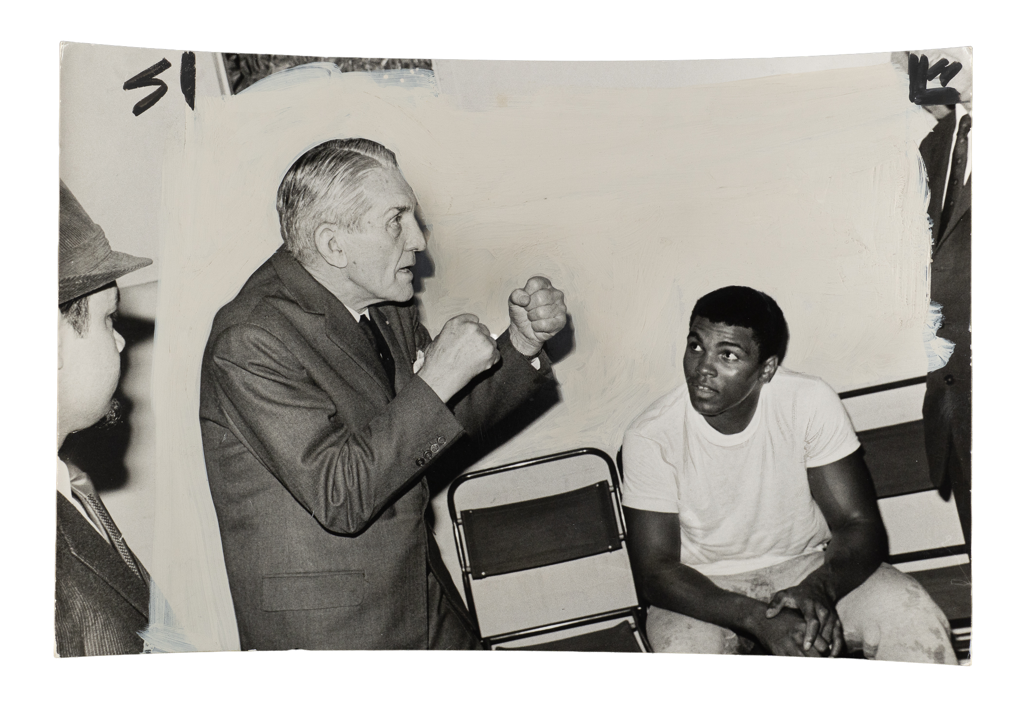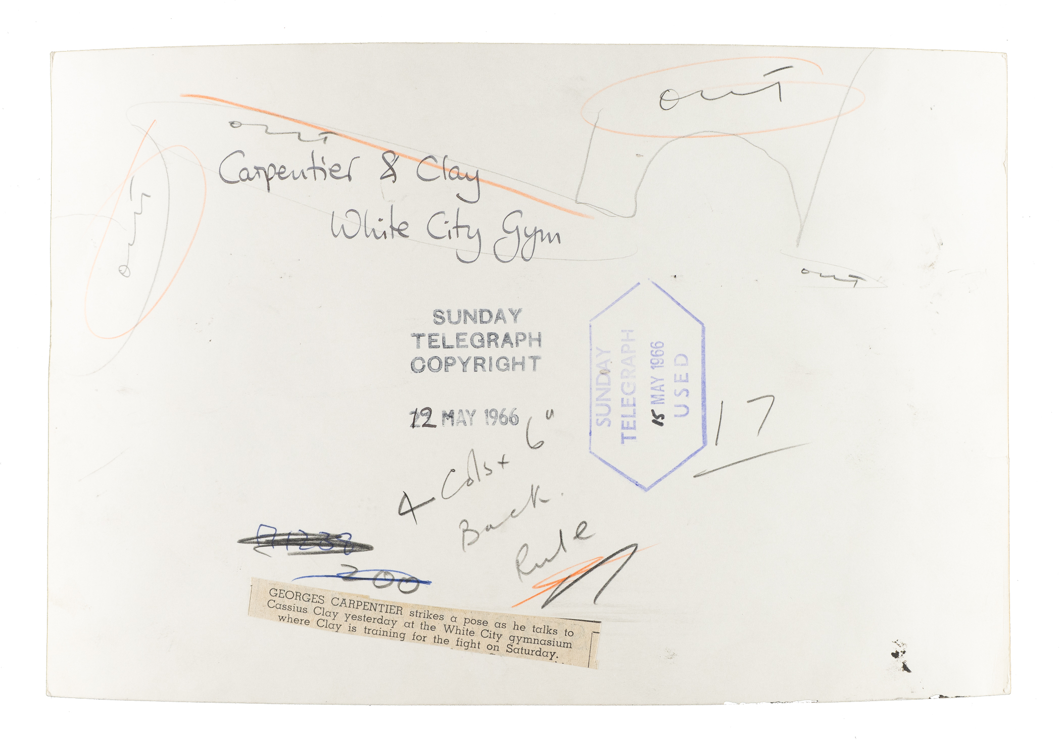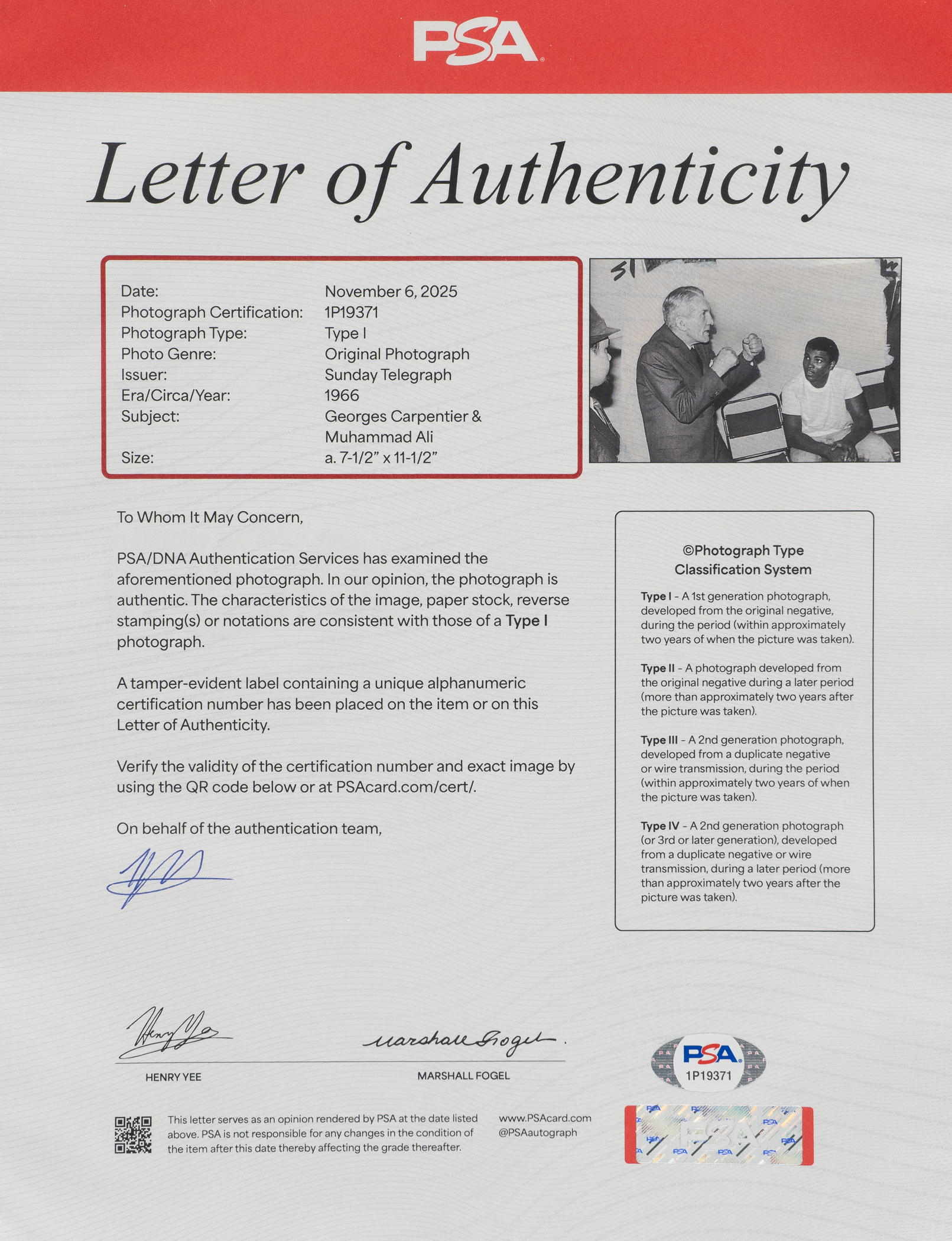 Original news photo of Cassius Clay (Muhammad Ali) with former European Boxing Union Heavyweight champion, Georges Carpentier in 1966. Certified as an original Type I photo by PSA/DNA. A pair of "Sunday Telegraph" credit stamps appear on the reverse, along with several editorial notations. The photo, which has been trimmed to its current dimensions of 11.5 x 7.5 inches, exhibits white editorial background paint and a pair of crop marks. Very Good condition overall. Full LOA from PSA/DNA.