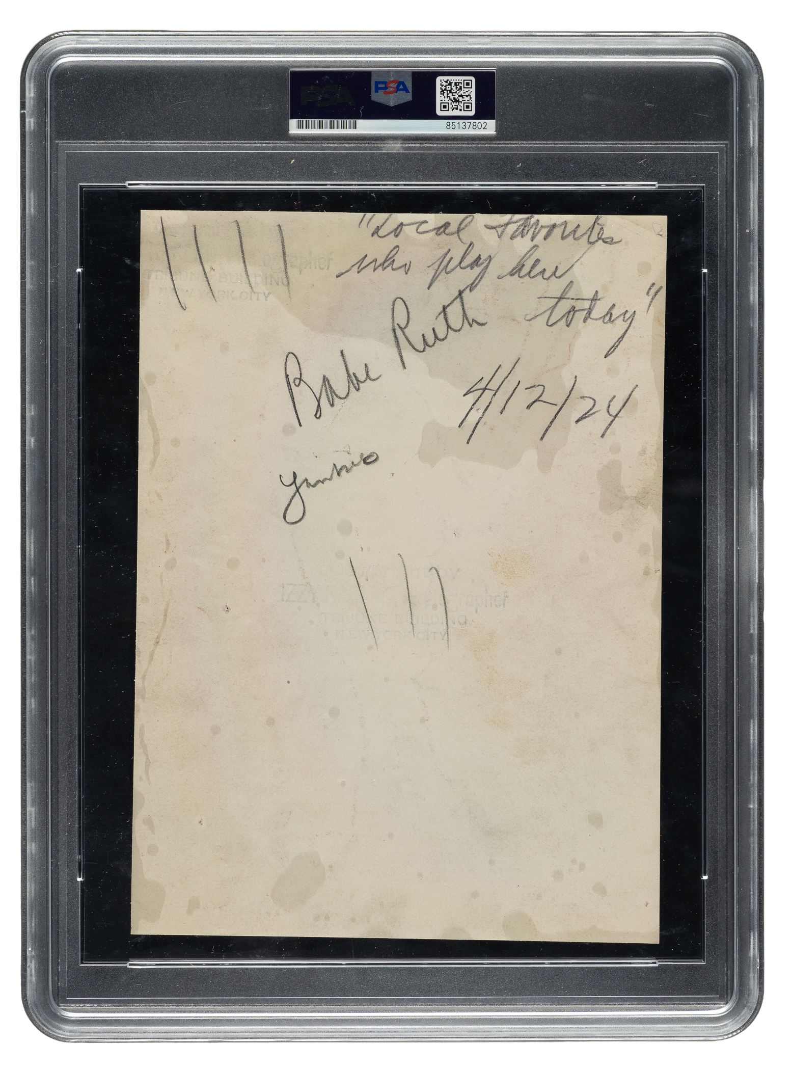 Original photo of Babe Ruth as a member of the New York Yankees, circa 1920s. Encapsulated and certified as an original Type I photograph by PSA/DNA. A smiling Ruth is captured during a practice session. The reverse displays a pair of "Kaplan Photo Service" credit stamps and several editorial notations. The photo, which has been trimmed to its current dimensions of 7 x 9.5 inches, displays a small spot of white editorial background paint above Ruth's head and a few small creases. Very Good condition overall.
