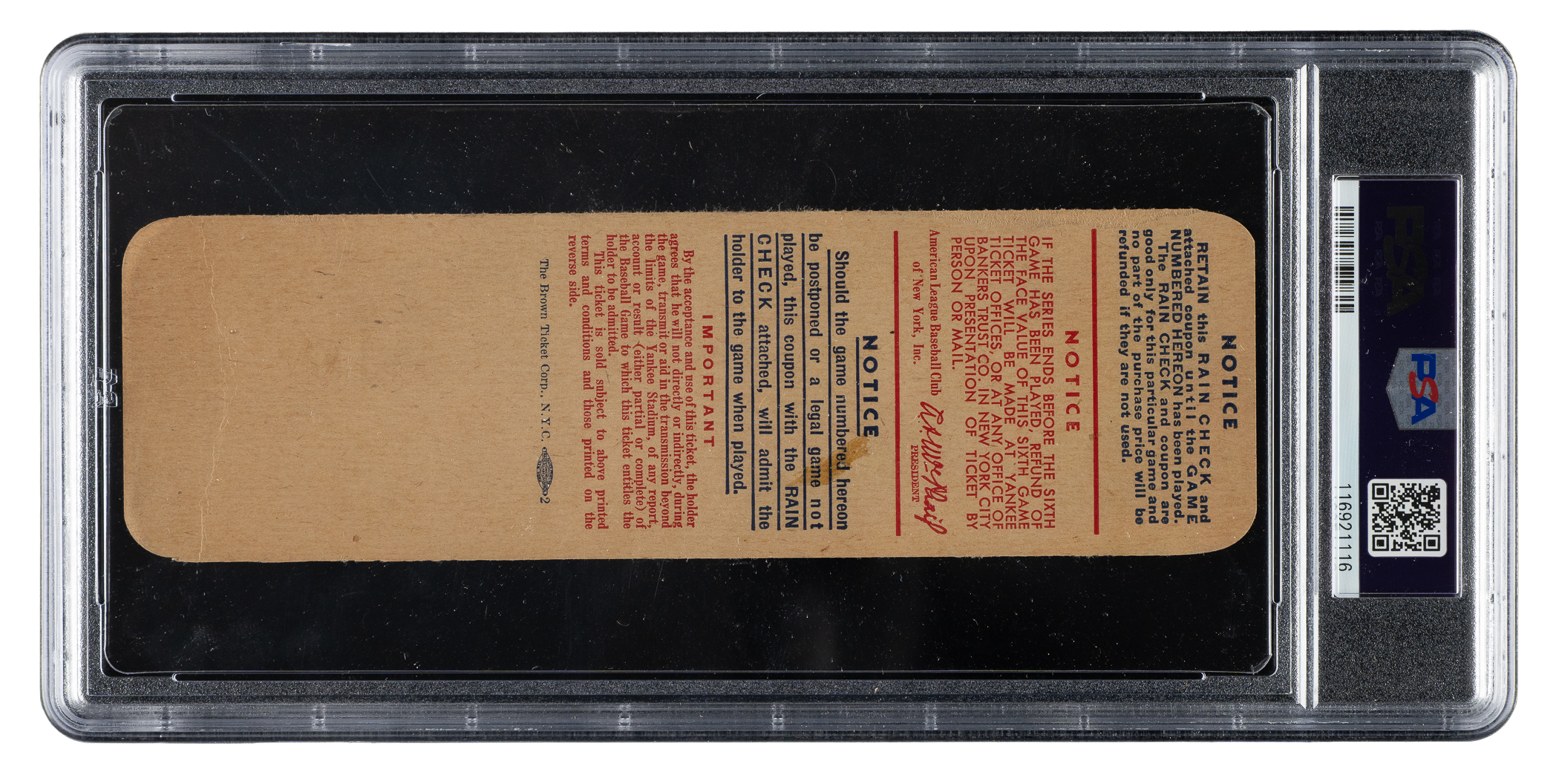 Graded FAIR 1.5 by PSA. Full ticket (7.25 x 2.25 inches) issued for Game 6 of the 1947 World Series between the New York Yankees and Brooklyn Dodgers, held at Yankee Stadium on October 5th. Game 6 of the 1947 World Series featured one of the greatest plays in Series history and forever linked the names of Joe DiMaggio, one of the greatest players of all time, and Al Gionfriddo, a reserve outfielder who played only four years in the Major Leagues. The Dodgers were leading the Yankees 8-5 in the bottom of the sixth inning in Game 6 when DiMaggio came to the plate with two out and men on first and second. On the first pitch, DiMaggio lined the ball to deep left field, and it appeared to be headed over the fence, but Gionfriddo, who had just entered the game that inning as a defensive replacement, ran and made a spectacular leaping catch of the ball just as it was clearing the wall. In a rare show of emotion, DiMaggio, who was nearing second when Gionfriddo made the catch, kicked the dirt in disgust. That catch helped preserve the Dodgers' eventual 8-6 win. Unfortunately for the Dodgers, the Yankees won Game 7, which prompted yet another promise of "wait 'til next year" by the Flatbush faithful.