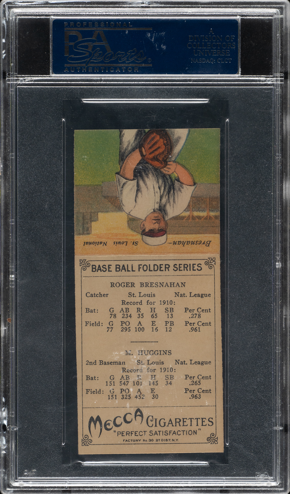 Graded NM-MT 8 by PSA. St. Louis Cardinals Hall of Famers Miller Huggins and Roger Bresnahan. Only one example has been graded higher by PSA to date.