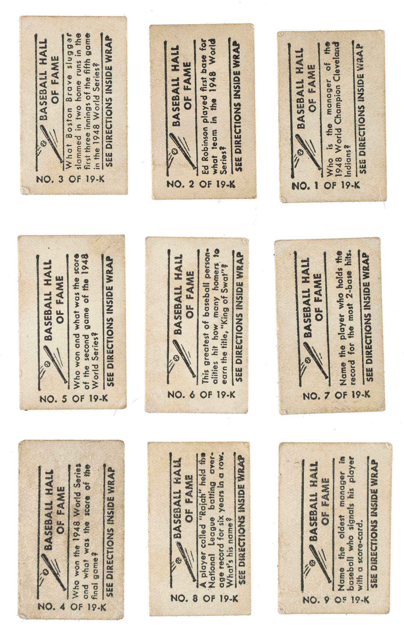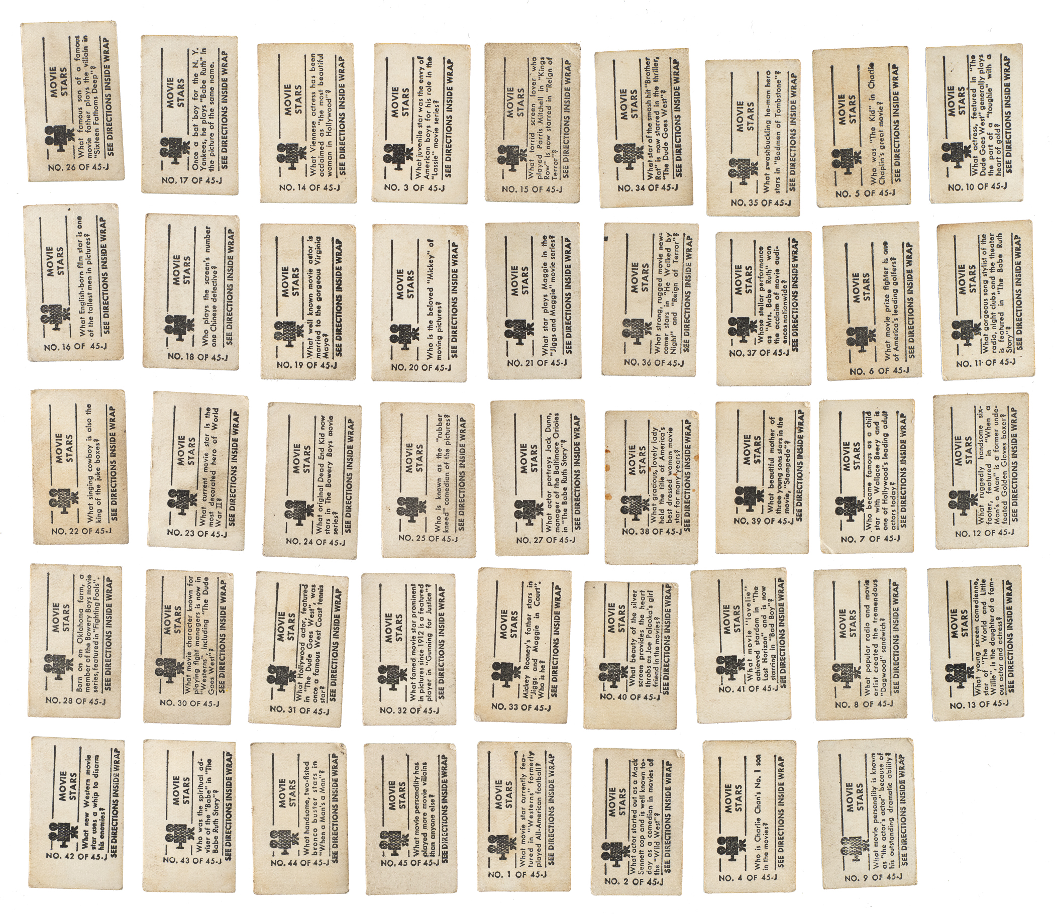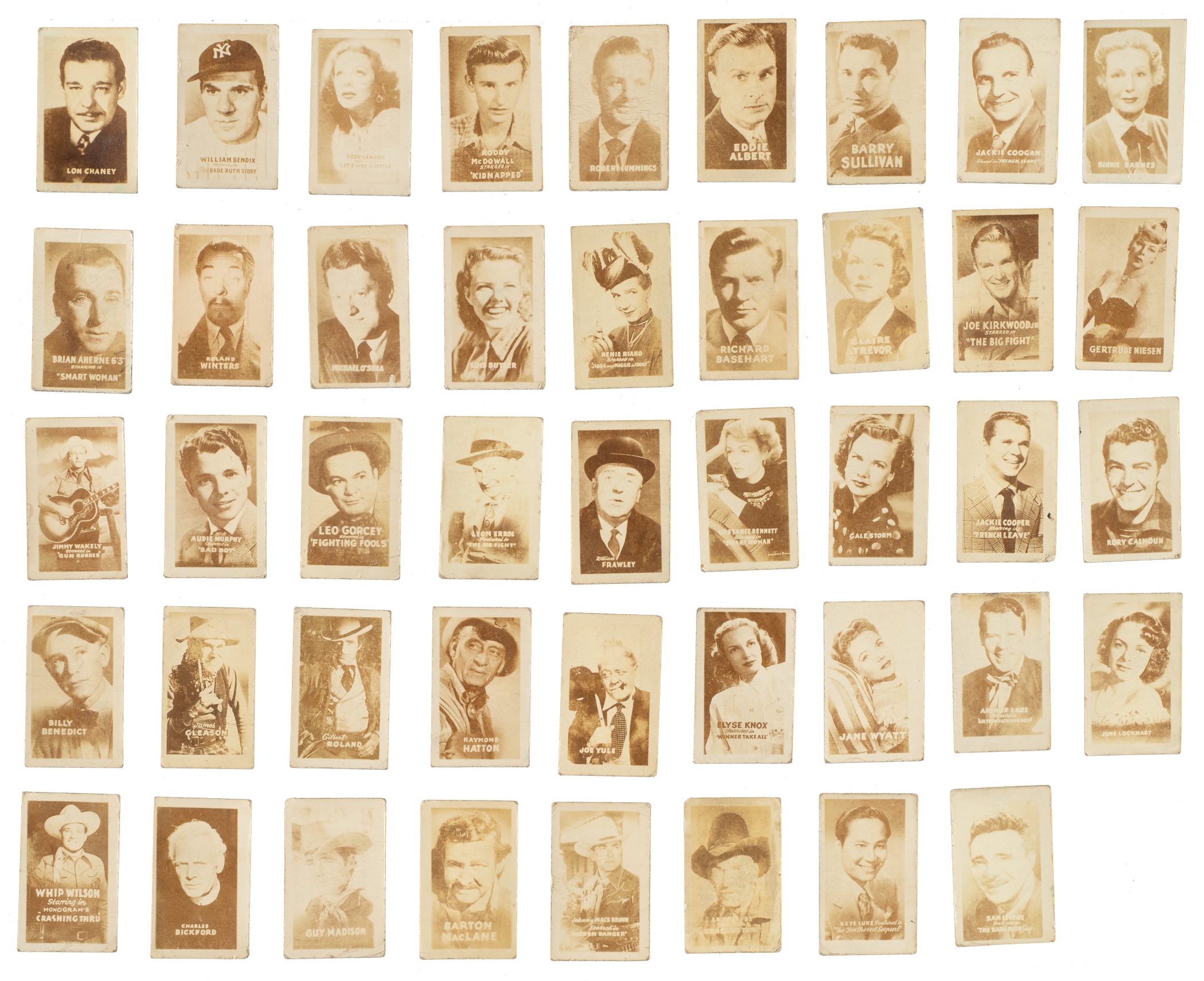 Presented is an outstanding collection of 1948 Topps "Magic Photos" cards, consisting of 53 different of the 252 subjects in the set. Most assume that the first Topps card issues were in 1951. In fact, the very first Topps card issue was the unusual "Magic Photos" set of 1948. This was also Topps' first baseball-card set. The "Magic Photos" set consists of nineteen subsets, with this collection highlighted by nine of the nineteen players in the baseball subset, including Babe Ruth, Rogers Hornsby, Connie Mack, and Tris Speaker. The 44-card balance represents a near-complete "Movie Stars" subset (44/45), missing only #29-J Rod Cameron for completion. The movie stars are highlighted by Lon Chaney, Heddy Lamarr, Eddie Albert, Roddy McDowell, and William Bendix (as Babe Ruth). These "self-developing" cards (7/8 x 1-7/16 inches) were called "Magic Photos" because when issued they had blank fronts, and the sepia photos on the fronts could be developed by youngsters by exposing them to the sun. This set has always been very popular among nonsport collectors, but its great significance as Topps' first baseball card set has never fully been appreciated by baseball-card collectors. This may be due, in part, to the fact that the self-developing process produced very inconsistent results, and many cards that have survived have photos that are very poorly developed. In terms of overall condition and photo quality, this group is better than the norm, with the majority having pleasing contrast and detail. Included is an original album which was designed to house half of the set. The album is in Very Good condition overall, with scattered creases on the covers. This collection was consigned to us with the cards displayed in the "tuck in the corners"-style album pages. We carefully removed the cards in order to properly grade them. Includes the following nine baseball players: #1-K Boudreau (Gd+), 2-K Cleveland Indians (Gd), 3-K Elliott (Vg-Ex), 4-K Cleveland Indians 4-3 (Fr), 5-K Boudreau Scoring (Vg-Ex), 6-K Ruth (0/100 L/R, otherwise Vg-Ex), 7-K Speaker (Vg), 8-K Hornsby (Vg-Ex), and 9-K Mack (Fr). The condition of the near-complete "Movie Stars" subset ranges from Gd to Vg-Ex (averaging Vg), with a few lesser. This is a very significant and scarce early Topps issue, which has always been somewhat overlooked by collectors, perhaps because of its unusual design and dimensions. Total: 53 cards and one album.