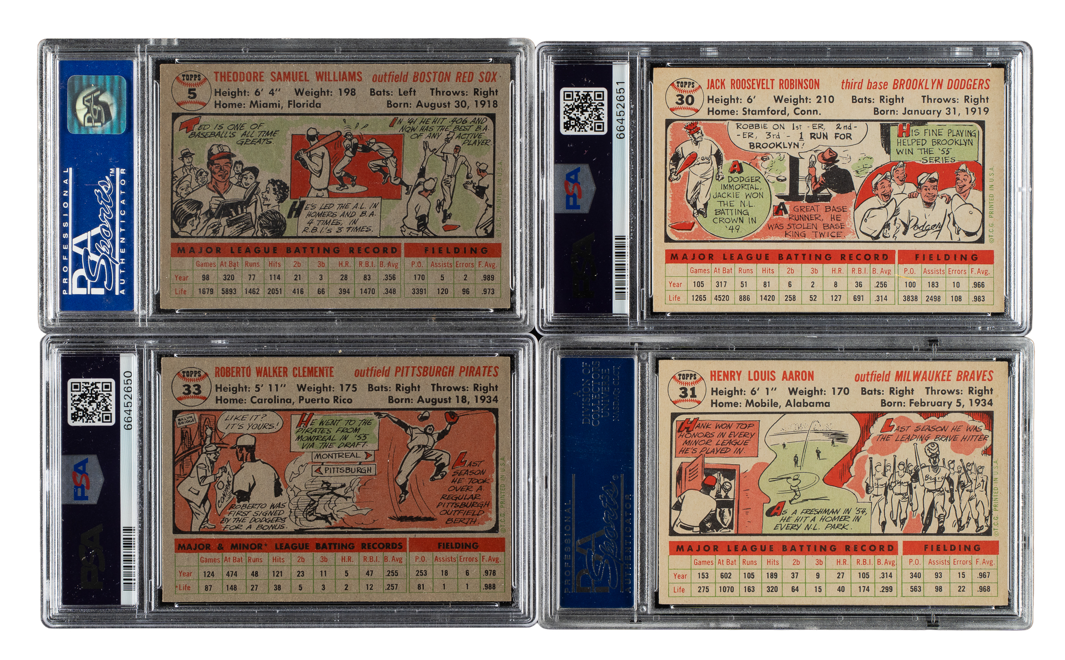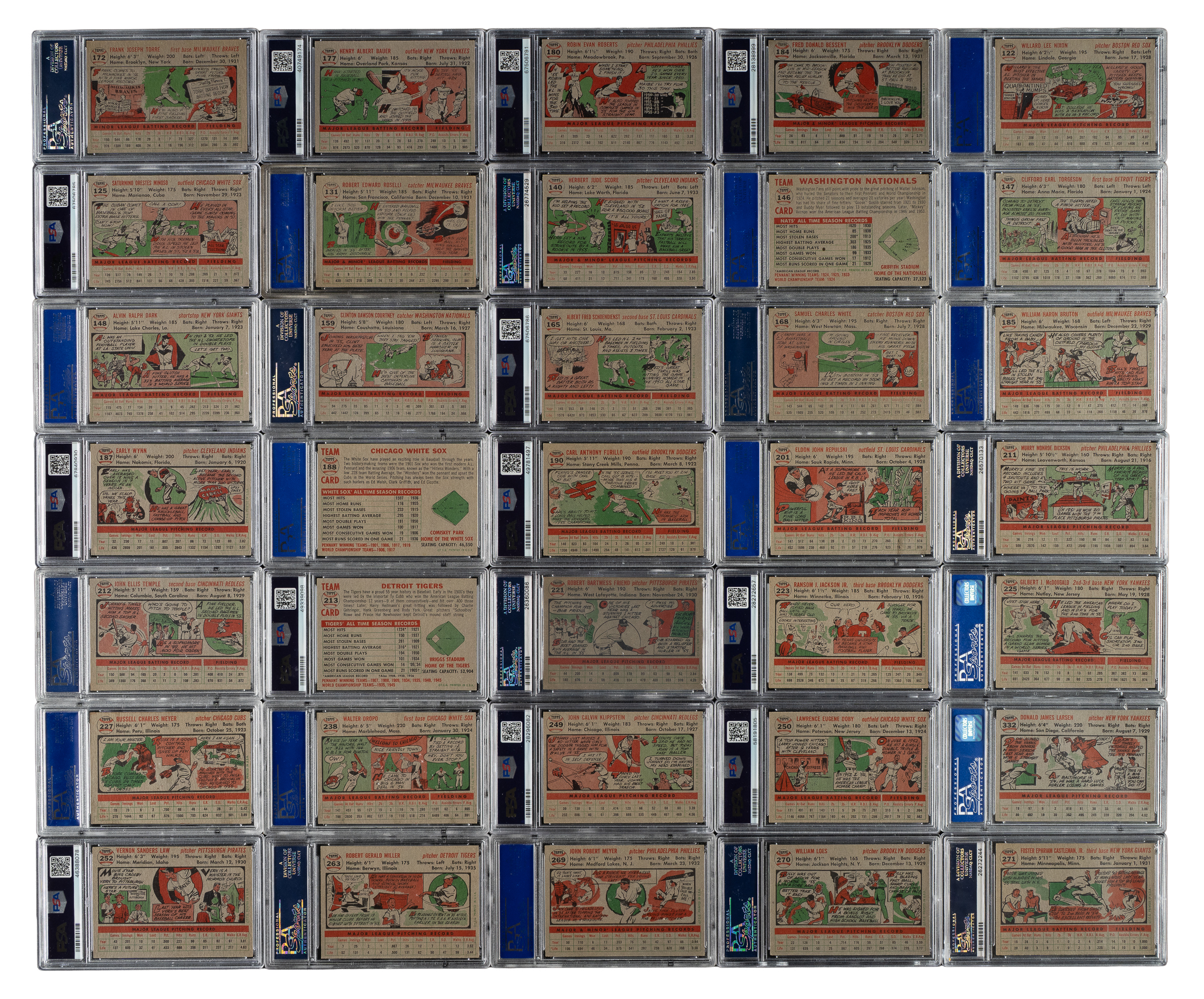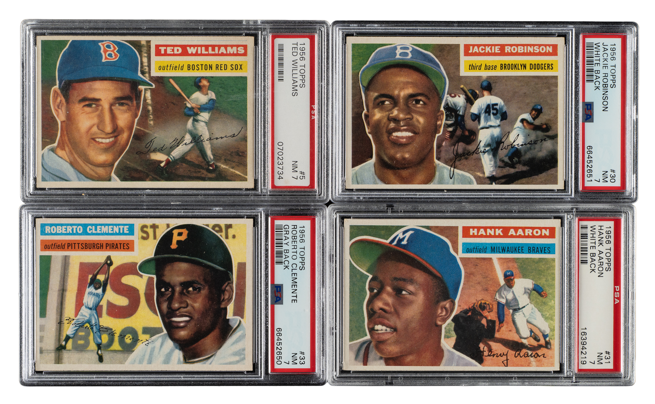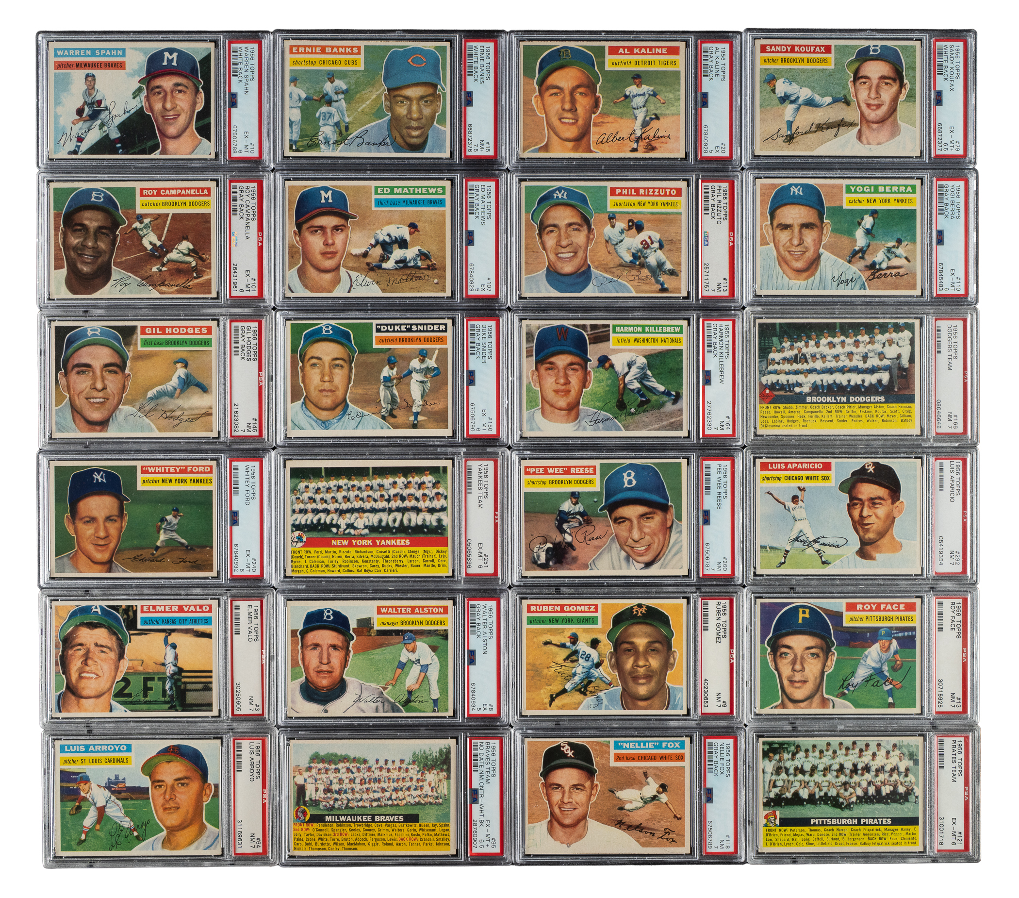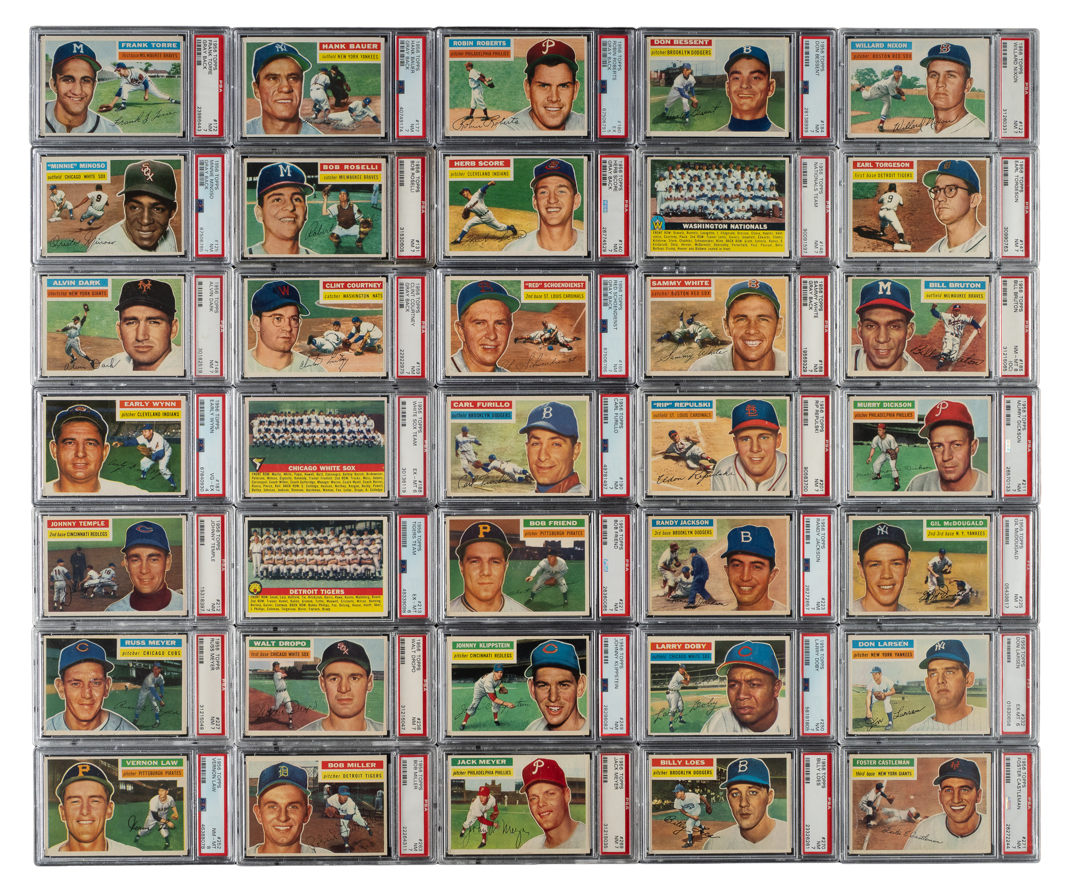 Presented is an outstanding mid- to high-grade near-complete set of 1956 Topps, consisting of 338 different cards (out of 340 in the set). Missing only #130 Mays and 135 Mantle for completion. Includes both back variations of #81 and two duplicates (#314 and 323). This near set features dozens of Hall of Famers and stars of the era, highlighted by Hank Aaron, Ted Williams, Roberto Clemente, Jackie Robinson, and the rookie card of Luis Aparicio! Forty-four cards have significant gray backs (#1-100). Seventy-nine cards have been professionally graded and encapsulated by PSA (one by GAI). PSA Grading Composite: NM-MT 8 (3 cards): #120 Ashburn (GAI, gray back), 185 (OC), and 252. NM+ 7.5 (1 card): #15 Banks (white back). NM 7 (54 cards): #3, 5 Williams (gray back), 9, 13, 30 Robinson (white back), 31 Aaron (white back), 33 Clemente (gray back), 64, 113 Rizzuto (gray back), 118 Fox (gray back), 122, 125 Minoso (gray back), 131, 140, 145 Hodges (gray back), 146, 147, 148, 159, 164 Killebrew (gray back), 165 Schoendienst (gray back), 166 Dodgers Team (gray back), 168, 172 Torre (gray back), 177, 184, 190, 201, 211, 212, 221, 223, 225, 227, 238, 249, 250 Doby, 260 Reese, 263, 269, 270, 271, 275, 276, 280 Gilliam, 283, 288, 292 Aparicio RC, 295, 299, 302, 311, 324, and 340. EX-MT+ 6.5 (2 cards): #79 Koufax (white back) and 95. EX-MT 6 (11 cards): #10 Spahn (white back), 101 Campanella (gray back), 110 Berra (gray back), 121, 150 Snider (gray back), 188, 213, 240 Ford, 251 Yankees Team, 332 Larsen, and 334. EX 5 (6 cards): #1 Harridge (white back), 2, 8 Alston, 20 Kaline (gray back), 107 Mathews (gray back), and 180 Roberts (gray back). VG-EX 4 (2 cards): #187 and 307. The condition of the 262-card unencapsulated balance is 22% Nr/Mt or slightly better, 25% Ex-Mt, and 53% Vg-Ex to Ex (including a few lesser and one altered). Unencapsulated Keys: #181 Martin (Ex-Mt), 200 Feller (Gd-Vg due to small scrape of paper loss on surface), and Checklist 2/4 (Ex+). This is a superb mid- to high-grade near-complete set (minus two) of this classic 1950s Topps issue. The SMR value for just 75 of the graded cards (factoring in the two EX-MT+ half grades at the lower whole-grade level and not including the GAI-graded card, the PSA-qualified card, and the two cards graded VG-EX 4) is $10,345. Total: 342 cards (near set of 338 plus one checklist, one variation, and two duplicates). The size/weight of this item requires that there will be an additional shipping charge for this lot.