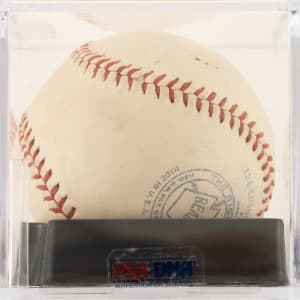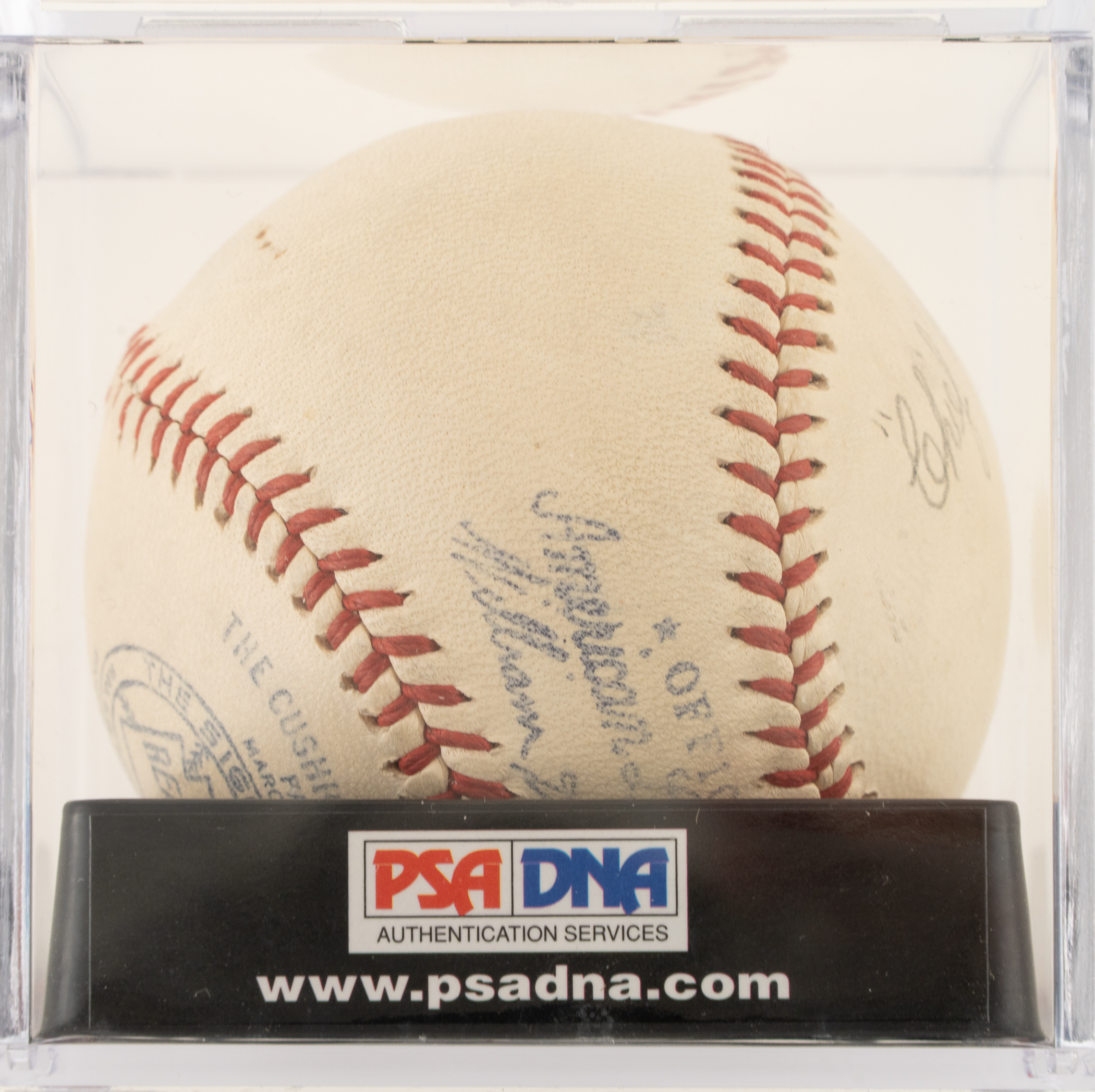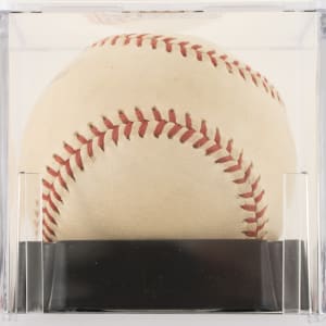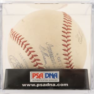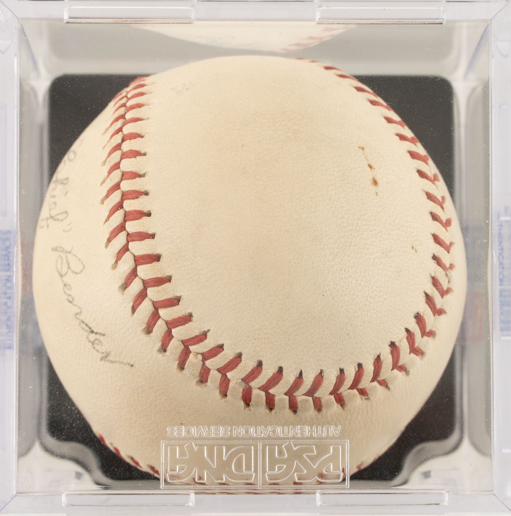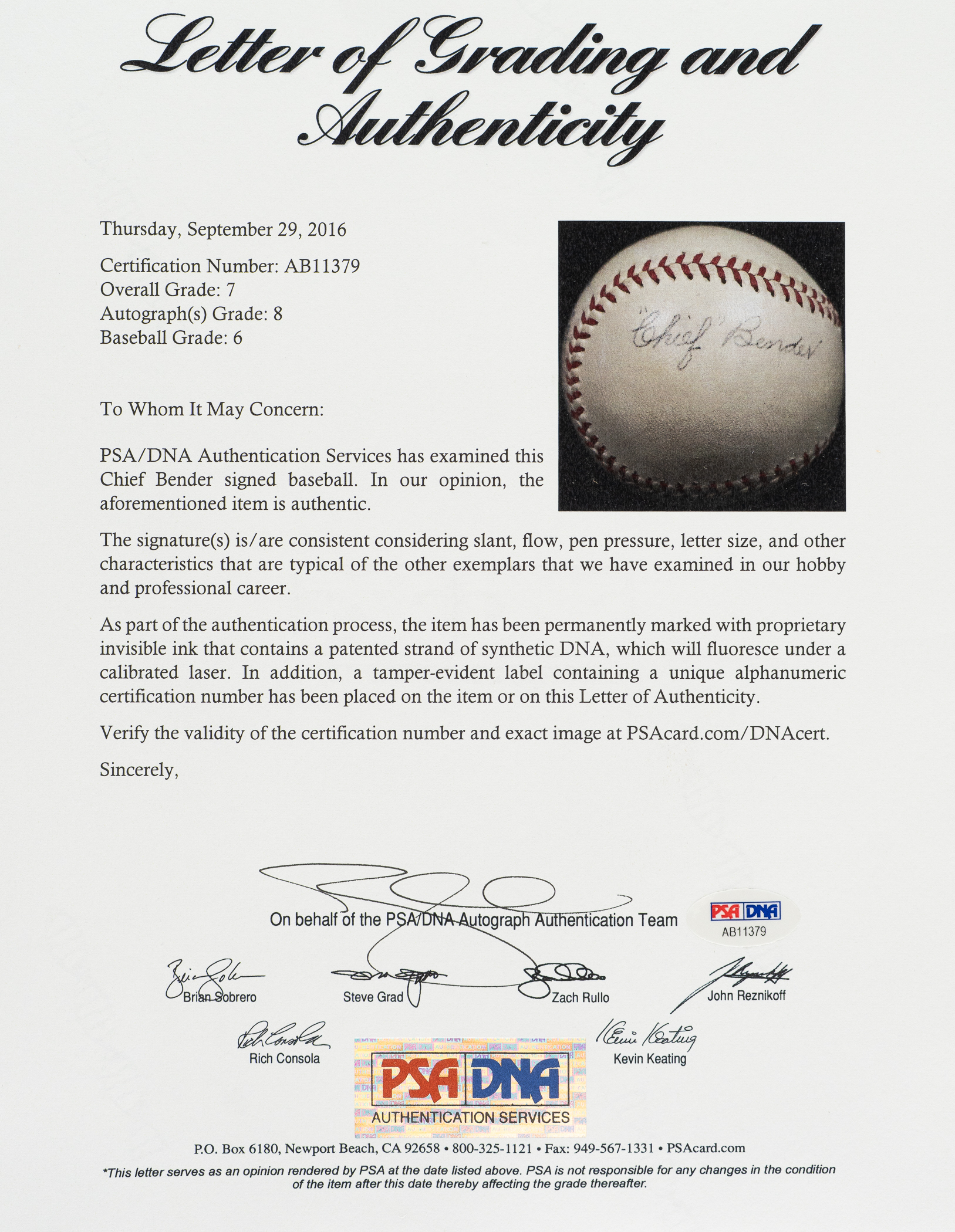 Official American League baseball (Harridge) signed by Philadelphia Athletics Hall of Fame pitcher Charles "Chief" Bender on a side panel. Bender has written his name, "Chief Bender" in black fountain pen. Graded NM 7 by PSA/DNA (signature graded 8, ball graded 6, for a final grade of 7). The signature of Chief Bender, who died on May 22, 1954, is scarce in any form, let alone by itself on a baseball. Bender was elected to the Hall of Fame in 1953 and died just nine months later. As a result, Hall of Fame autograph collectors had a very short window in which to obtain his signature. This is only the fifth Bender single-signed ball we have ever offered, and we have seen probably fewer than 10 at auction in the past 22 years. This is an exceptional Chief Bender single-signed ball in all respects and one would be hard pressed to find a finer example. Full LOA from PSA/DNA.