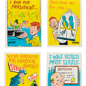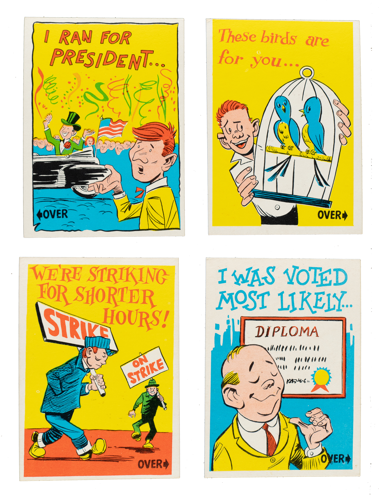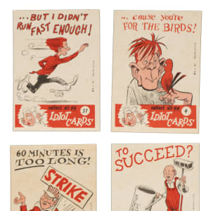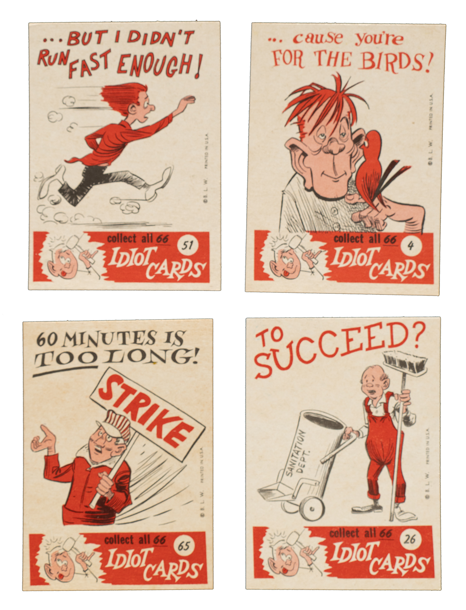 Complete set of 1961 Donruss "Idiot Cards" trading cards. Condition ranges from Vg to Nr/Mt (averaging Ex). Total: 66 cards. The size/weight of this item requires that there will be an additional shipping charge for this lot.