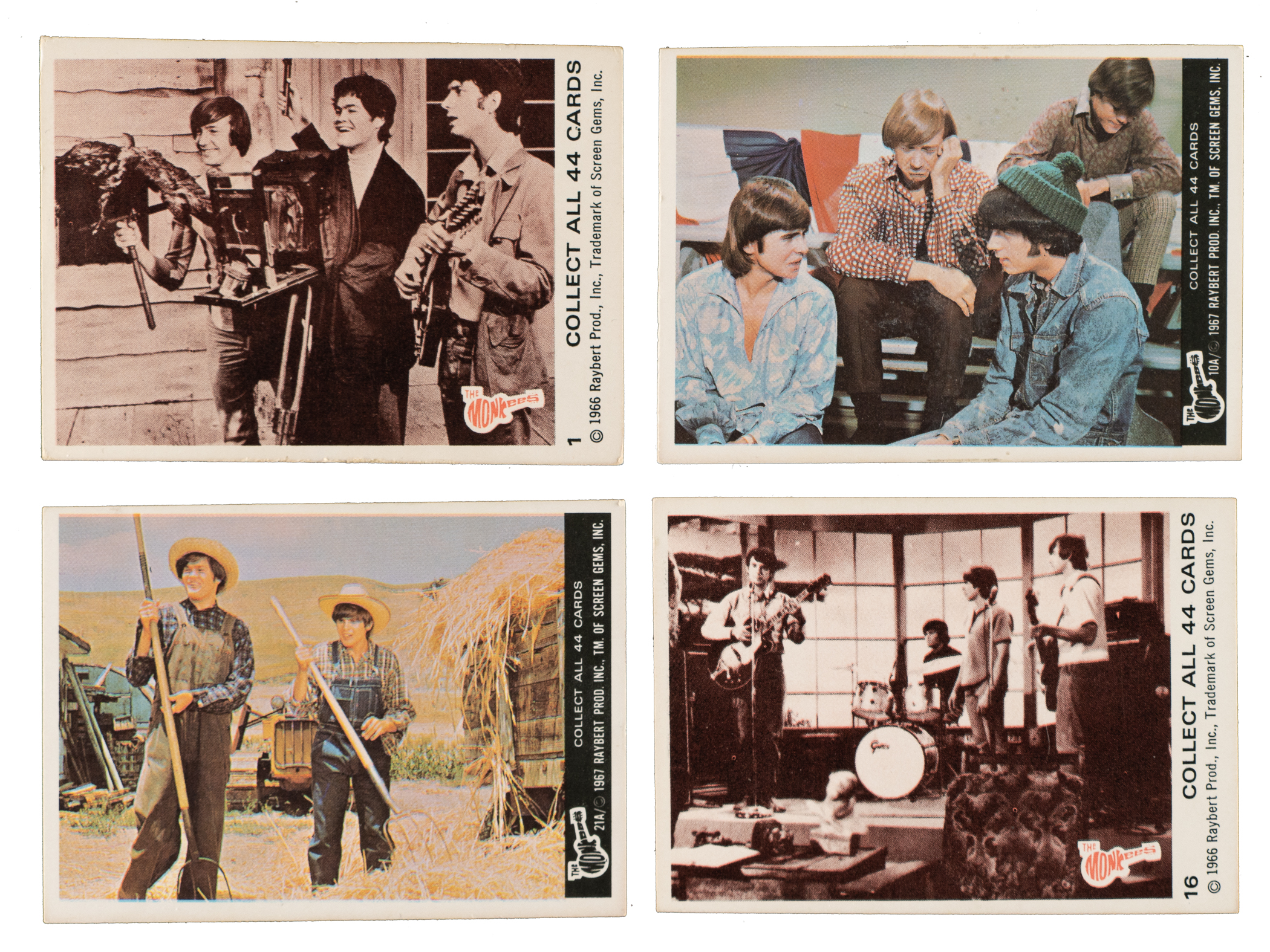 Pair of complete sets of 1966 Donruss "The Monkees" cards. This collection consists of the following: 1) 1966 Donruss "The Monkees - Series A" Complete Set (44): Condition ranges from Vg to Ex-Mt (averaging Vg-Ex+), with a couple Nr/Mt. 2) 1966 Donruss "The Monkees - Sepia Tone" Complete Set (44): Condition ranges from Vg-Ex to Ex-Mt (averaging Ex), with a couple slightly higher and lower. Total: 2 sets, 88 cards. The size/weight of this item requires that there will be an additional shipping charge for this lot.