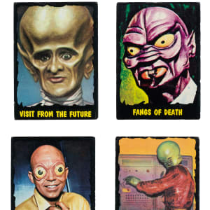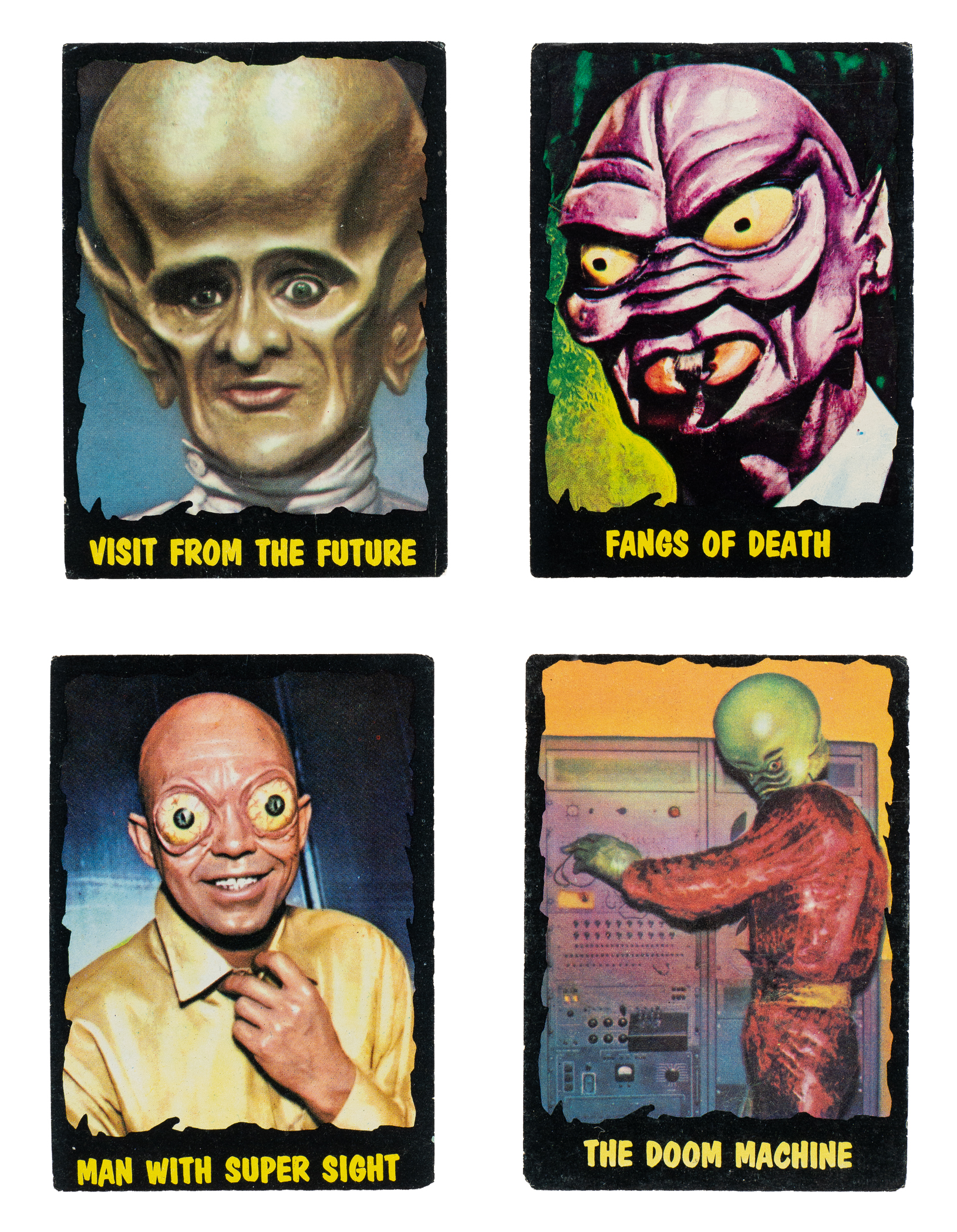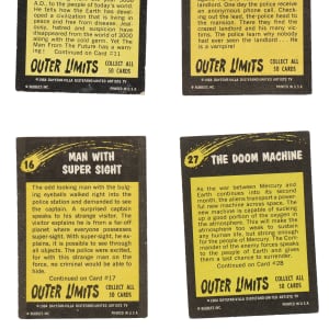 Complete set of 1964 Topps "Outer Limits" trading cards. Condition is 42% Vg-Ex to Ex (including one Ex-Mt), 48% Gd to Vg, and 10% Pr to Fr (including three with color added). Total: 50 cards. The size/weight of this item requires that there will be an additional shipping charge for this lot.