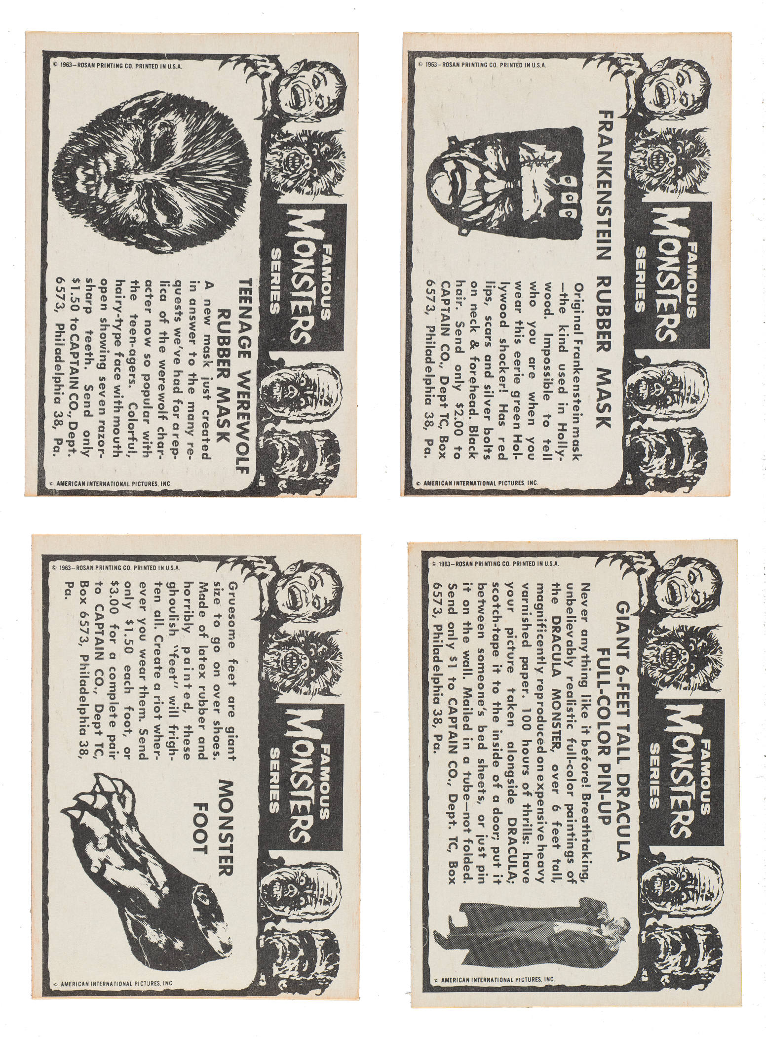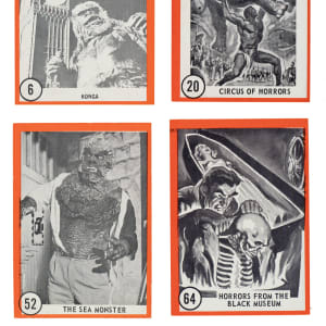 Complete 64-card set of 1963 Rosan "Famous Monsters" trading cards. Condition ranges from Ex to Nr/Mt (averaging Ex-Mt), with a few slightly lesser. The size/weight of this item requires that there will be an additional shipping charge for this lot.