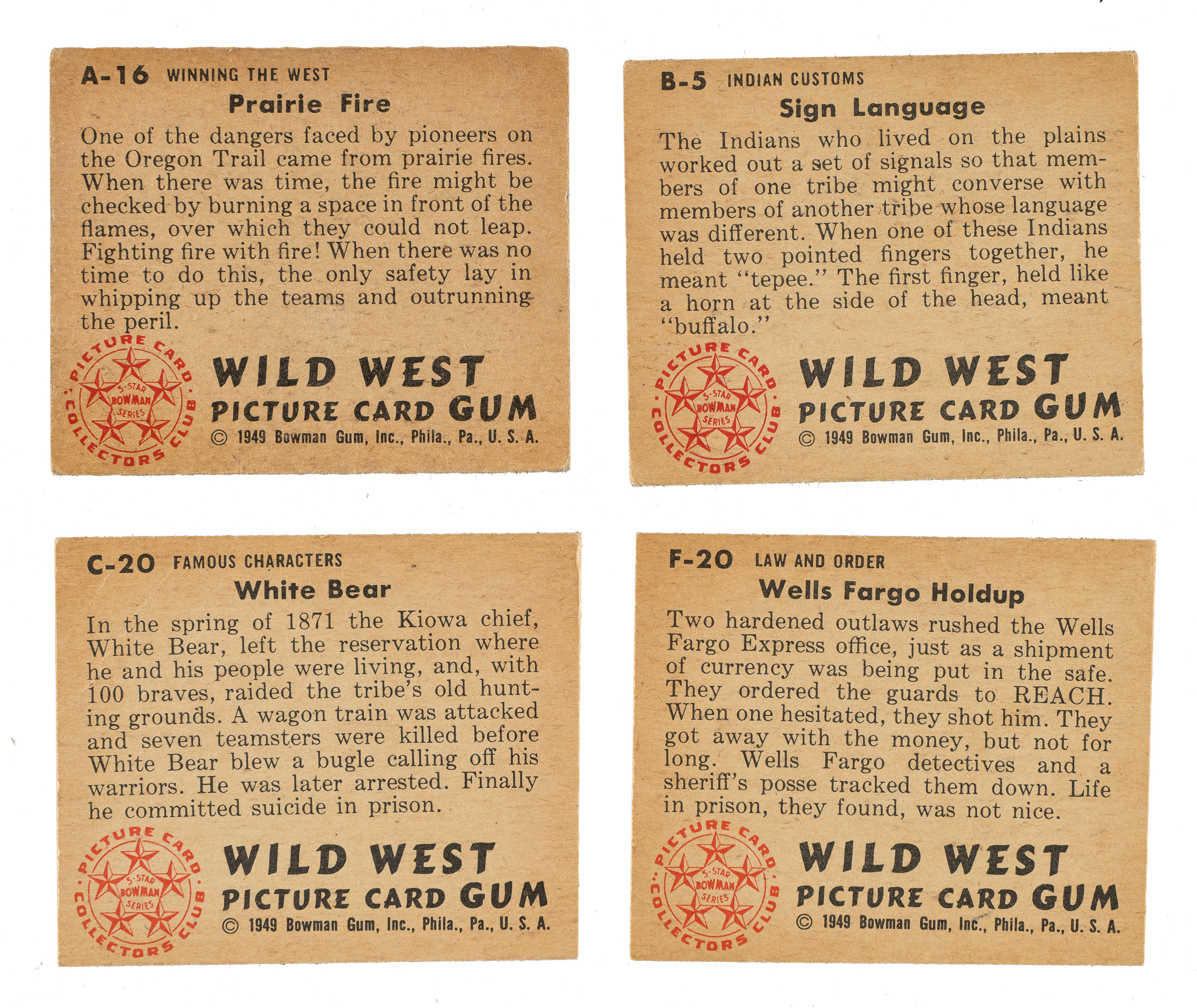 Copyrighted in 1949 and released to the public in 1950, this complete set of "Wild West" cards features some of the finest artwork of any Bowman production. The set is organized into eight separate series (A through H), each with a different theme relating to the Old West: "Winning the West," "Indian Costumes," "Famous Characters," "Indian Warfare," "Cowboy Life," "Law and Order," "River Days," and "Western Stars." Condition is 7% Nr/Mt or better, 10% Ex to Ex-Mt, 39% Vg to Vg-Ex, and 44% lesser (including one trimmed). A desirable mixed-grade complete set of this scarce and extremely popular nonsport issue. Total: 180 cards.