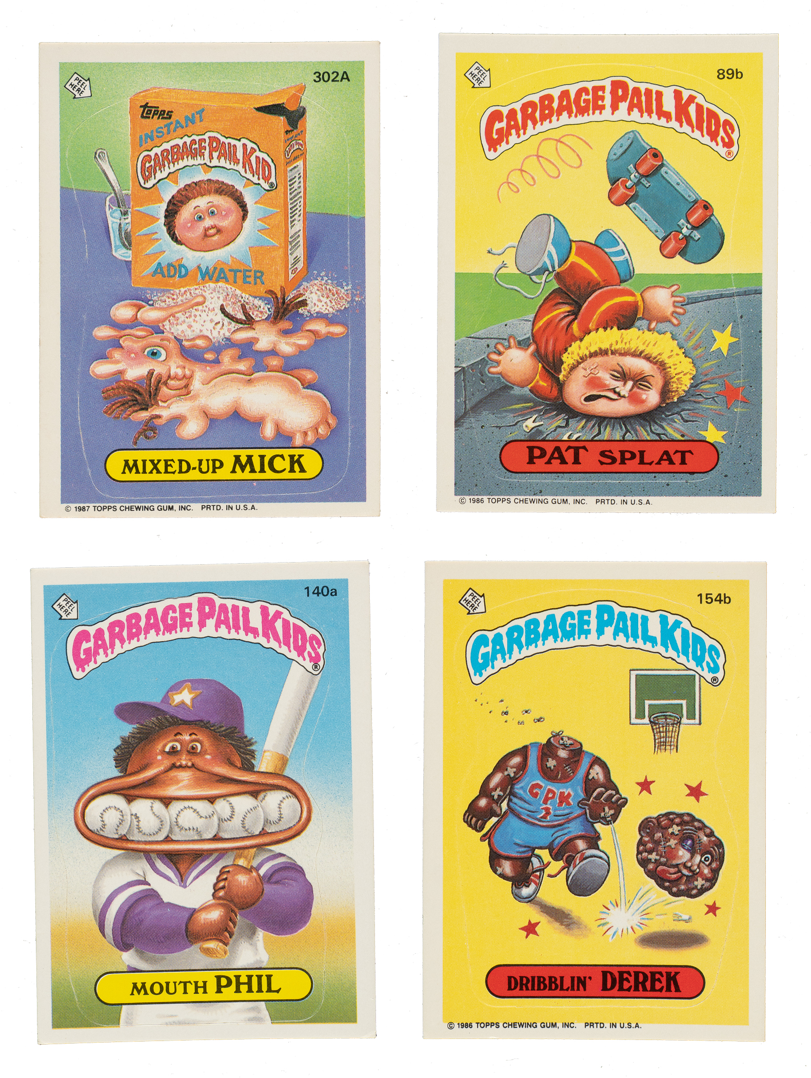 Presented is a substantial collection of mid-1980s Topps Garbage Pail Kids stickers consisting of a near-complete set of Series 9 (missing two cards) and complete sets of Series 3, 4, and 8. Clearly a parody of Coleco's popular Cabbage Patch Kids dolls (which ultimately led to a trademark infringement lawsuit), Topps Garbage Pail Kids cards were the brainchild of Pulitzer Prize-winning cartoonist Art Spiegelman (of Maus graphic novel fame), who was also the main creator of Topps Wacky Packages. Each sticker features a humorously drawn cartoon kid with a rhyming, alliterative, or word play nickname. Topps Garbage Pail Kids stickers were an instant hit with youngsters, with many schools banning them because of their edgy content and the distractions they caused. This collection consists of the following: 1) Series 3 Complete Set (82): Condition is 20% Nr/Mt to Nr/Mt-Mt, 40% Ex to Ex-Mt, and 40% Vg to Vg-Ex (including a couple lesser). 2) Series 4 Complete Set (84): Condition is 17% Nr/Mt to Nr/Mt-Mt, 37% Ex to Ex-Mt, and 46% Vg to Vg-Ex (including a couple lesser). 3) Series 8 Complete Set (84) Plus One Duplicate: Condition is 21% Nr/Mt to Nr/Mt-Mt, 59% Ex to Ex-Mt, and 20% Vg to Vg-Ex (including one lesser). Includes a duplicate of #324a. 4) Series 9 Near-Complete Set (86/88): Condition is 34% Nr/Mt to Nr/Mt-Mt, 58% Ex to Ex-Mt, and 8% Vg to Vg-Ex (including a couple lesser). Missing #345a and 345b for completion. Total: 4 sets, 336 cards.