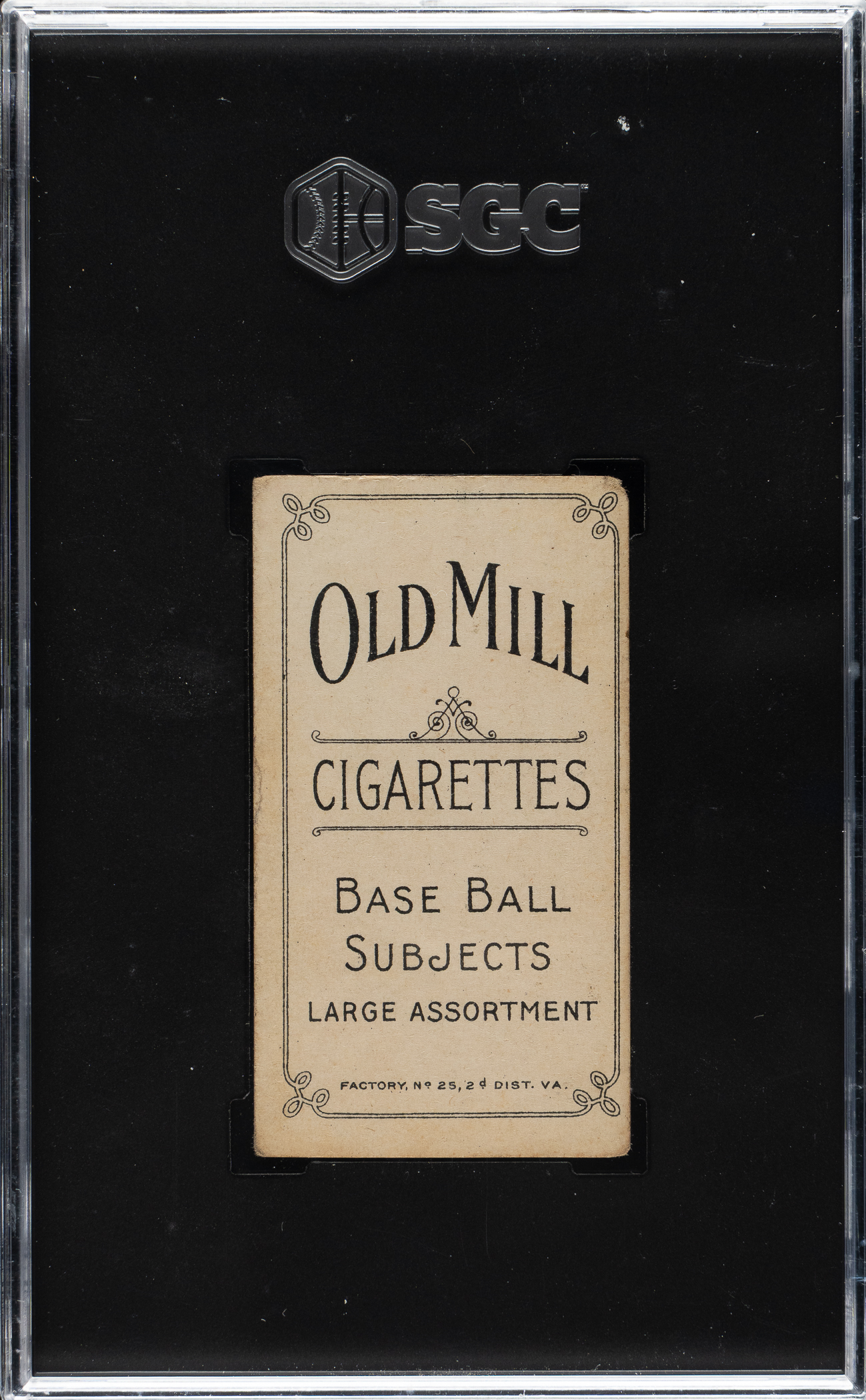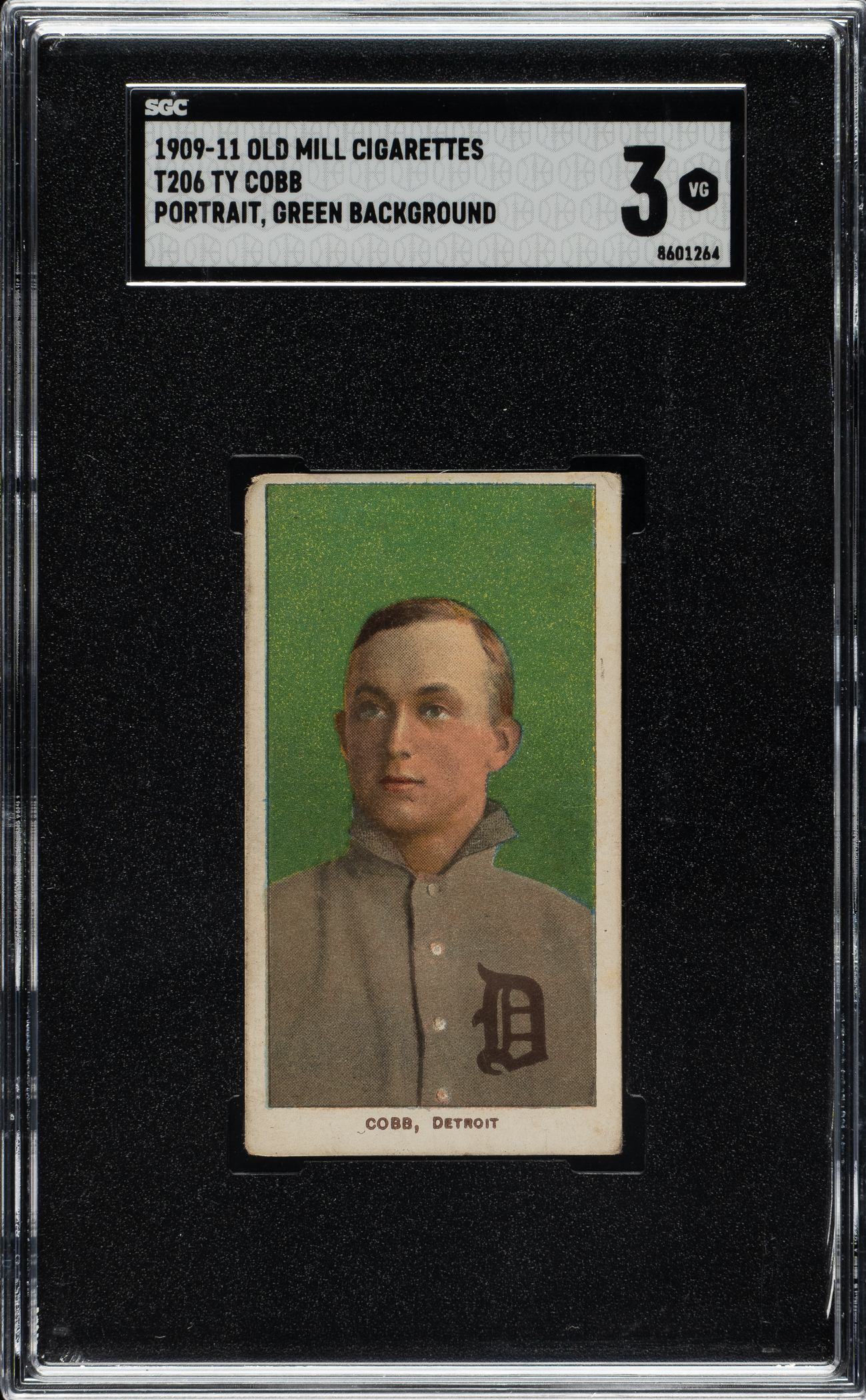 Graded VG 3 by SGC. Outstanding T206 White Border of Detroit Tigers Hall of Famer Ty Cobb with a desirable Old Mill advertising reverse. The green background pose has long been considered the rarest of the four poses of Cobb in the T206 set. The fact this example features an uncommon Old Mill advertising reverse makes it of particularly special note. To date, SGC has only graded eight examples of the green background Cobb featuring this back, with only one graded higher than the offered card. The offered example exhibits a beautiful green background, excellent registration, and honest corner wear (weaker top left). The important advertising reverse is boldly printed and clean. This is a superb scarce-back example of this classic Ty Cobb tobacco card, worthy of even the most advanced Ty Cobb, Hall of Fame, or T206-back collection
