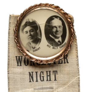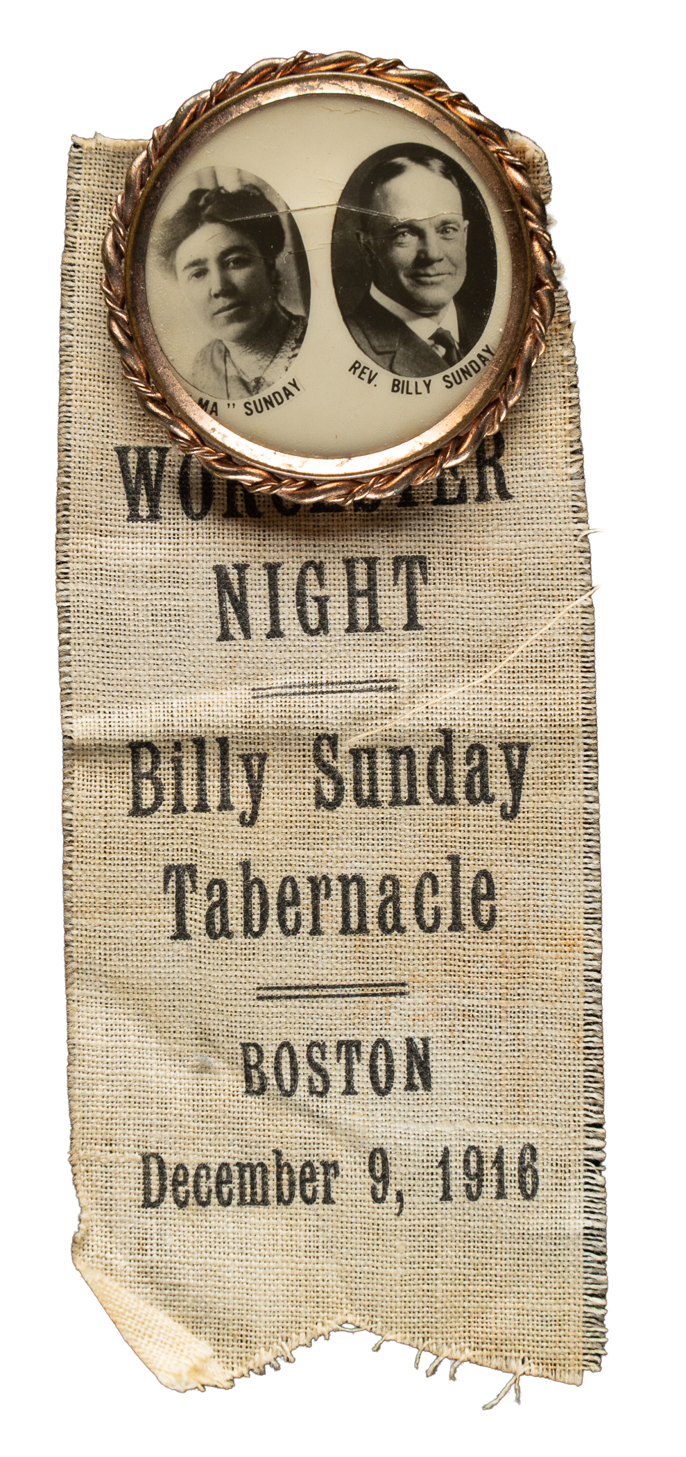 Scarce ribbon pin capturing former Major League outfielder turned evangelist Billy Sunday. The pin (1.5 inches in diameter) features portrait images of Sunday and his wife, while the white silk ribbon reads "Worcester Night - Billy Sunday Tabernacle - Boston - December 9, 1916." Billy Sunday is one of the great nineteenth-century baseball figures whose fame transcends the sport. Sunday was a star with Anson's Chicago Nationals in 1886 when he met a group of evangelists from the Pacific Garden Mission in Chicago. The evangelists invited Billy to attend services, and soon after he became famous in the baseball community for his strong faith and moral lifestyle in a sport characterized by a culture of drinking, gambling, and hard living. He soon earned the nickname "The Evangelist." Following the 1890 season, Sunday left the game to pursue his true calling, earning less than twenty-five percent of the salary he could command on the baseball diamond. He soon became the most popular evangelist in America, and a great ambassador for the game of baseball. The pin displays a crack across the front, and the ribbon is lightly toned. In Fair to Good condition overall.