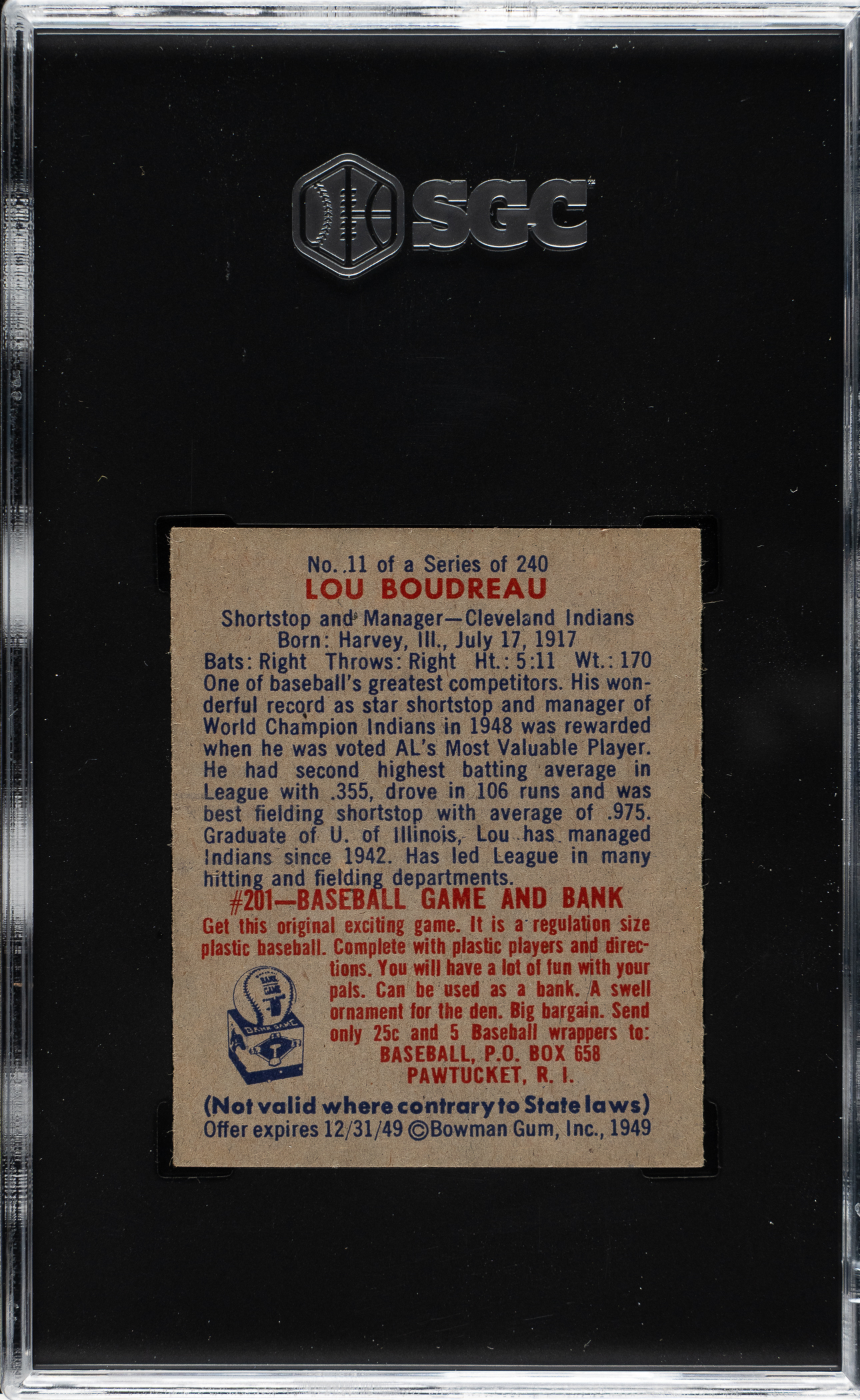 Graded EX/NM 6 by SGC. Cleveland Indians Hall of Famer Lou Boudreau.