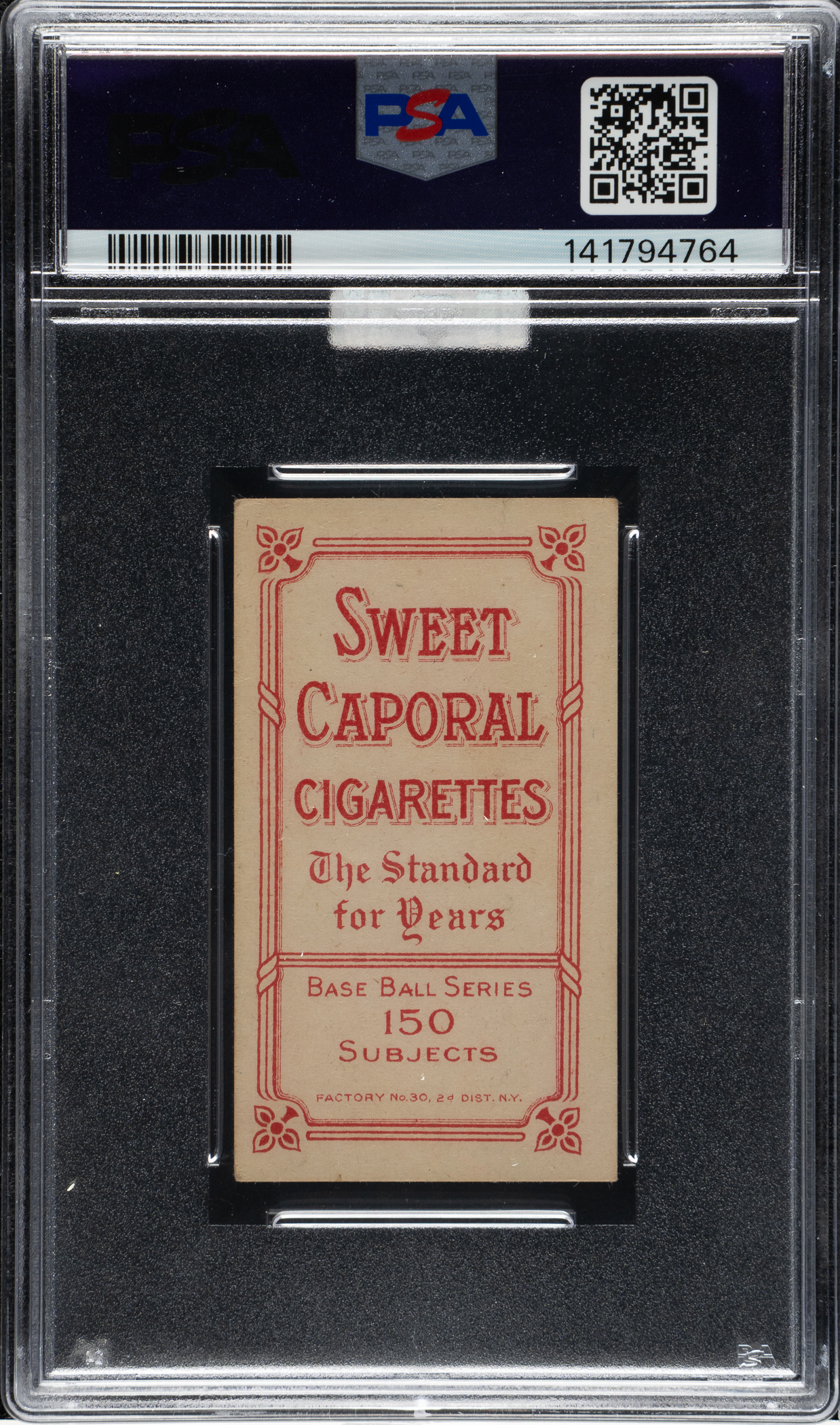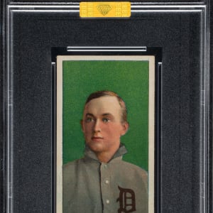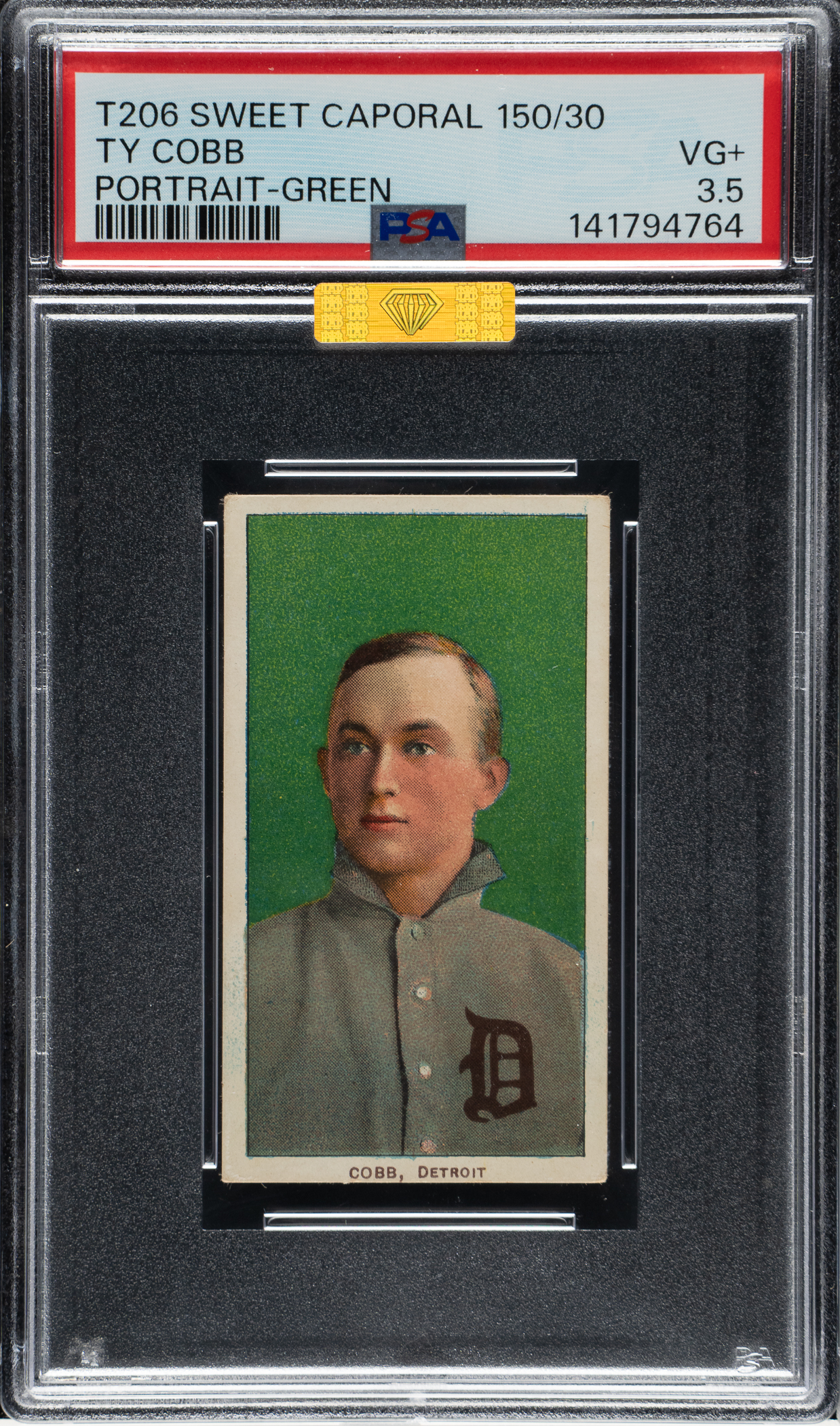 Graded VG+ 3.5 by PSA (submitted by REA). Beautiful example of this classic tobacco card of Hall of Famer Ty Cobb. The green background pose is considered the rarest of the four poses of Cobb in the T206 set. The offered example features a brilliant green background, outstanding registration, and light corner wear. Boldly printed Sweet Caporal 150/30 advertising reverse. A strong mid-grade example of one of Cobb's most popular cards. Awarded an MBA Gold Diamond by Mike Baker Authenticated for high-end eye appeal. A corresponding MBA sticker is affixed to the front of the holder.