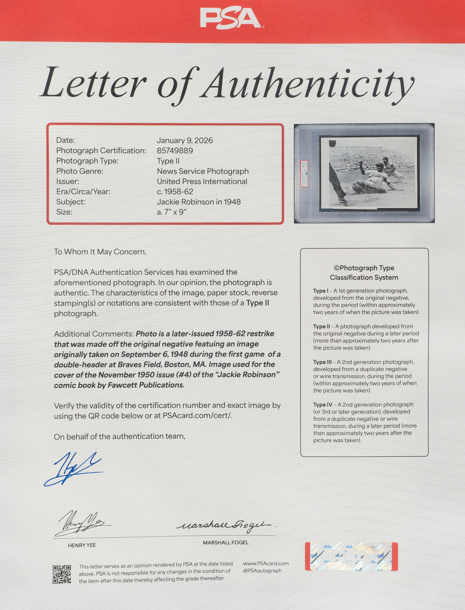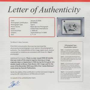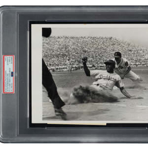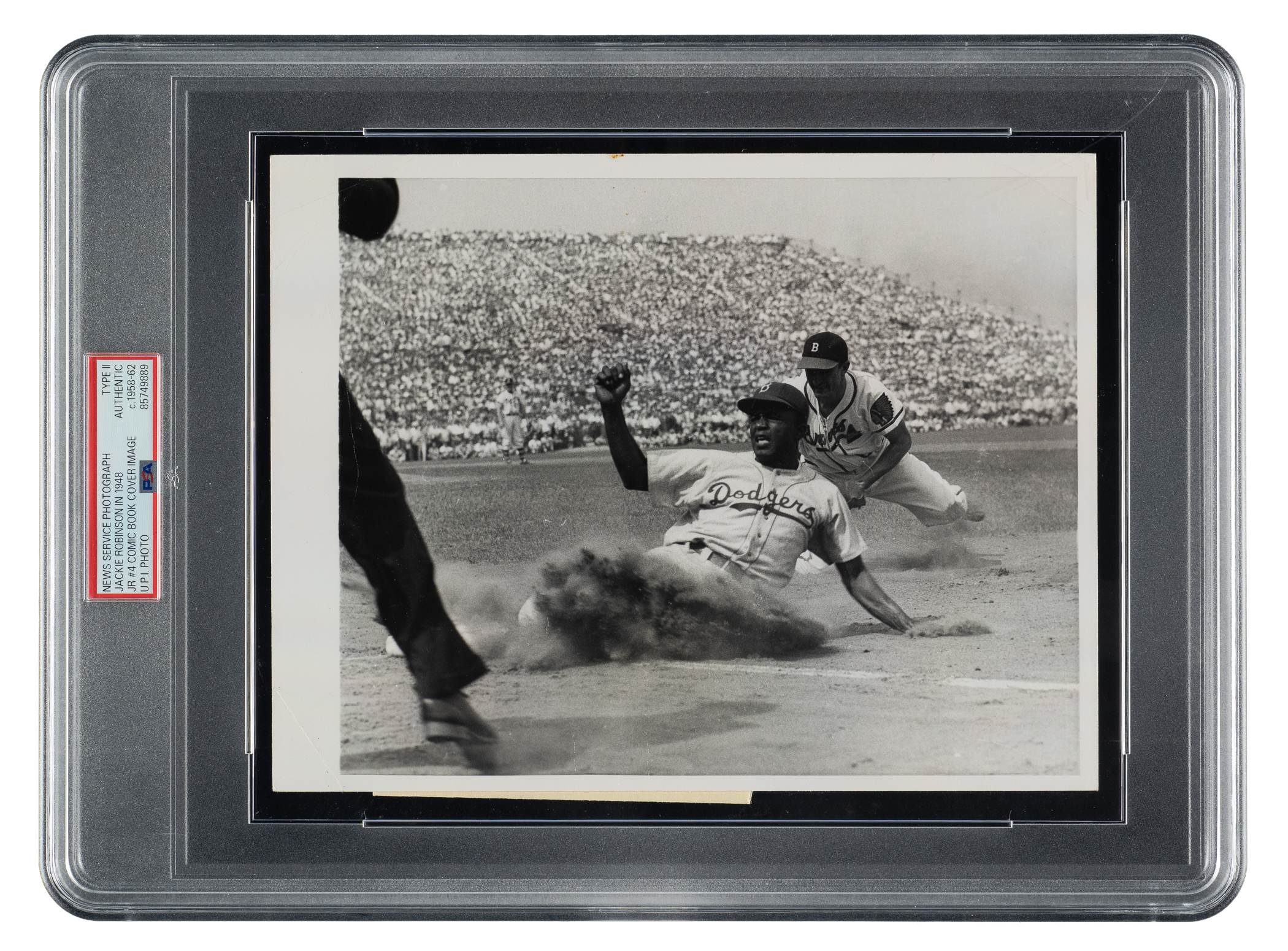 Vintage photo of Jackie Robinson sliding back into first base during a game against the Boston Braves. Encapsulated and certified as an original Type II photograph by PSA/DNA. Per PSA/DNA, this photo is a later-issued 1958-1962 restrike that was made off the original negative featuring an image taken on September 6, 1948, during the first game of a doubleheader at Braves Field, Boston, MA. Image used for the cover of the November 1950 issue (#4) of the 'Jackie Robinson' comic book by Fawcett Publications." The reverse bears a "United Press International Photo" credit stamp and a portion of the paper news caption. The photo (7 x 9 inches) exhibits scattered creasing and is in Very Good condition overall. Full LOA from PSA/DNA.