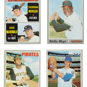 Offered is a very attractive complete 1970 Topps Baseball set, plus complete 24-item insert sets of 1970 Topps Posters, Story Booklets, and Scratch-Offs. At 720 cards, the 1970 Topps set was the largest set of Topps cards issued to that date. Condition of the set is 16% Ex-Mt to Nr/Mt (including a few Nr/Mt-Mt), 67% Vg-Ex to Ex, and 17% Gd to Vg (including a couple with a slight miscut). Two cards have been professionally graded by PSA and SGC. Keys: #1 Mets Team (Vg), 10 Yastrzemski (Ex+), 140 Jackson (Vg-Ex), 150 Killebrew (Vg-Ex), 189 Munson RC (Vg-Ex), 195 NL Playoff Gm. 1 - Seaver (SGC EX/NM 6), 290 Carew (Vg-Ex), 300 Seaver (Vg-Ex), 350 Clemente (Vg+), 449 Palmer (trimmed right edge, otherwise Ex+), 459 Jackson AS (PSA EX 5), 462 Aaron AS (95/5 T/B, otherwise Vg-Ex+), 500 Aaron (Vg-Ex), 530 Gibson (Gd+), 580 Rose (Vg), 600 Mays (Vg+), 630 Banks (Ex), 640 Kaline (Ex-Mt), 660 Bench (Vg+), 700 F. Robinson (Ex), and 712 Ryan (Vg-Ex). Condition of the posters is 62% ranging from Vg to Ex and 38% ranging from Pr-Fr to Gd (including Fr examples of Bench and Clemente). Condition of the story booklets ranges from Vg to Ex-Mt (averaging Vg-Ex). Condition of the scratch-offs is 33% Ex, 37% Vg to Vg-Ex (including Aaron), and 30% lesser (with six scratched off, including Kaline Killebrew, and Seaver). Dating from when sets could not be purchased all at once, and had to be assembled by series as they were released throughout the season, this 1970 Topps set collection includes a countless array of stars and Hall of Famers. Total: 792 items (complete set of 720 cards plus 24 posters, 24 booklets, and 24 scratch-offs).