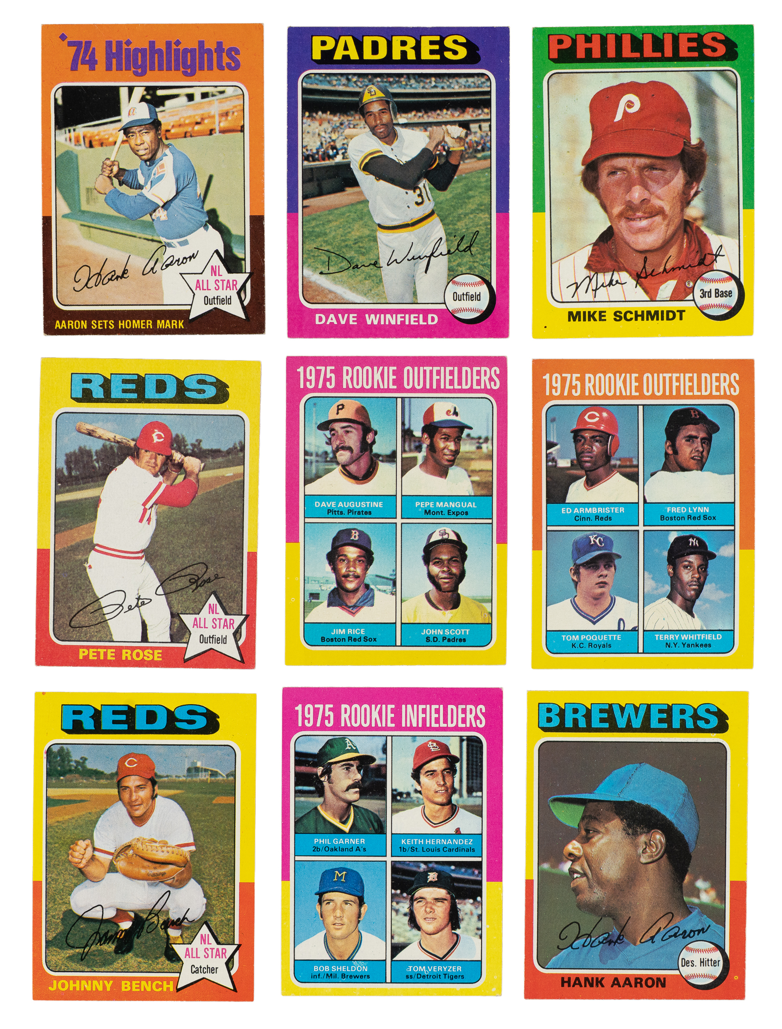 The rookie cards of Hall of Famers George Brett, Robin Yount, Gary Carter, and Jim Rice highlight the 1975 Topps issue, one of the most popular and unusual sets of the 1970s. The colored flush-to-the-border design of the 1975 Topps set makes this issue particularly challenging to collect in extremely high grade. Condition is 23% Nr/Mt or better, 63% Ex to Ex-Mt, and 14% Vg to Vg-Ex (mostly Vg-Ex and including ten trimmed). Keys: #1 Aaron HL (Ex-Mt), 61 Winfield (Ex), 70 Schmidt (Ex), 223 Yount RC (Ex), 228 Brett RC (Ex-Mt), 260 Bench (Ex-Mt), 320 Rose (slight trim to top edge, otherwise Nr/Mt), 500 Ryan (Ex), 616 Rice RC (Nr/Mt), 620 Carter RC (Ex), 622 Lynn RC (Nr/Mt), 623 Hernandez RC (Ex+), and 660 Aaron (30/70 L/R, otherwise Nr/Mt+). This is a very attractive mid- to high-grade complete set loaded with Hall of Famers and stars from the 1970s. Total: 660 cards.