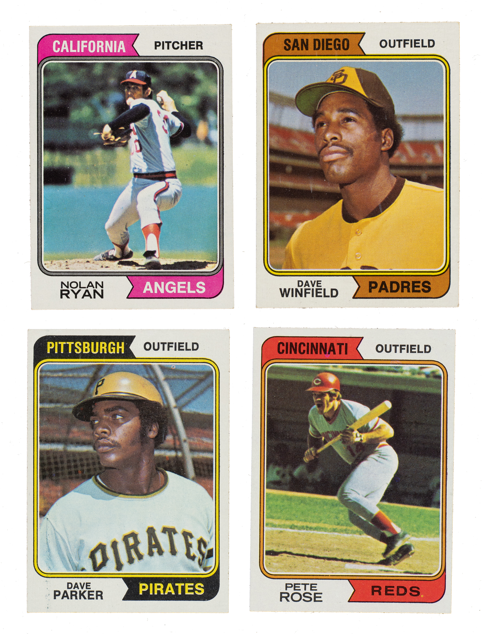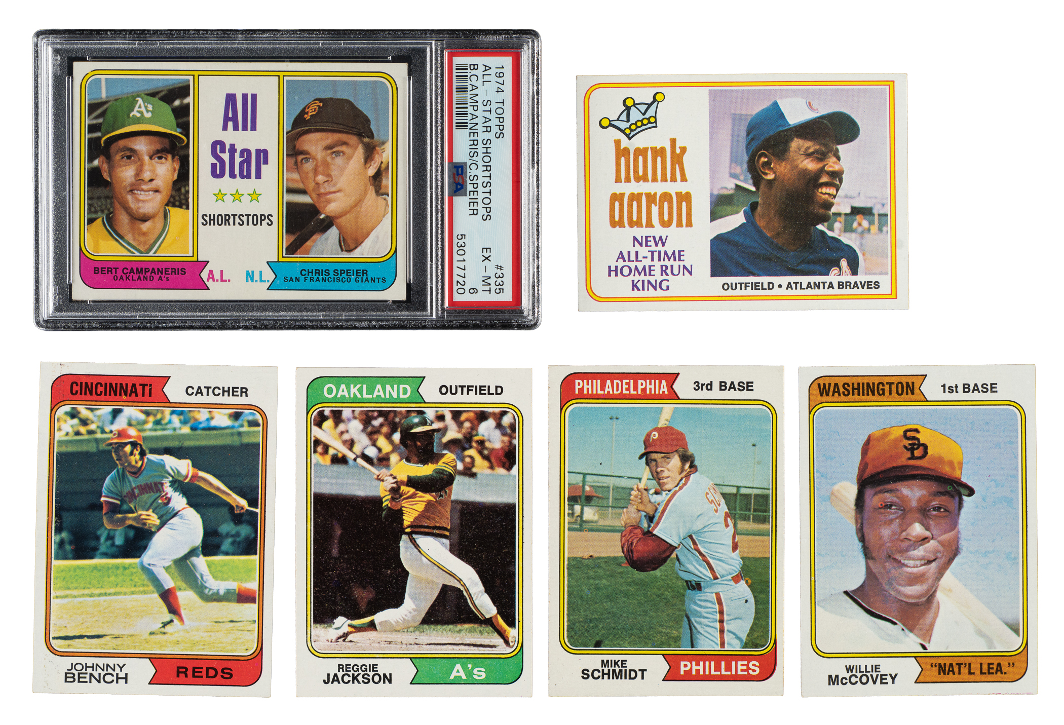 Presented is a very attractive near-complete master set (minus two) of 1974 Topps baseball cards consisting of the following: complete 660-card basic set, 44-card Traded series, 24-card Team Checklists set, all fifteen "Washington, Nat'l" variations, and a variation for #654 Alou. Missing only two variations (#599c Rookie Pitchers/San Diego, small print and 608a Apodaco RC) for completion. Condition is 27% Nr/Mt or better, 51% Ex to Ex-Mt, and 22% Vg to Vg-Ex (including a few lesser and a couple with a slight miscut). Keys: #1 Aaron (Ex-Mt), 10 Bench (Nr/Mt), 20 Ryan (Nr/Mt), 130 Jackson (Ex), 250a McCovey/Washington (Vg-Ex), 252 Parker RC (Vg-Ex+), 283 Schmidt (Ex-Mt), 300 Rose (Nr/Mt+), 335 AS Shortstops (PSA EX-MT 6), and 456 Winfield RC (Vg-Ex). Condition of the Traded set ranges from Vg-Ex to Nr/Mt (averaging Ex/Ex-Mt). Condition of the team checklists ranges from Vg-Ex to Nr/Mt (averaging Ex/Ex-Mt), with a couple lesser and one trimmed). This is a strong mid- to high-grade 1974 Topps master set (minus two cards) with numerous highlights. Total: 744 cards.