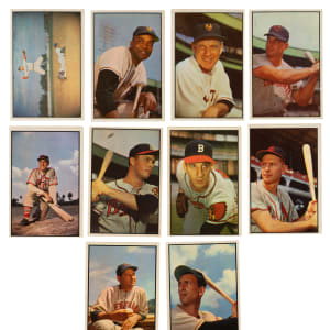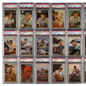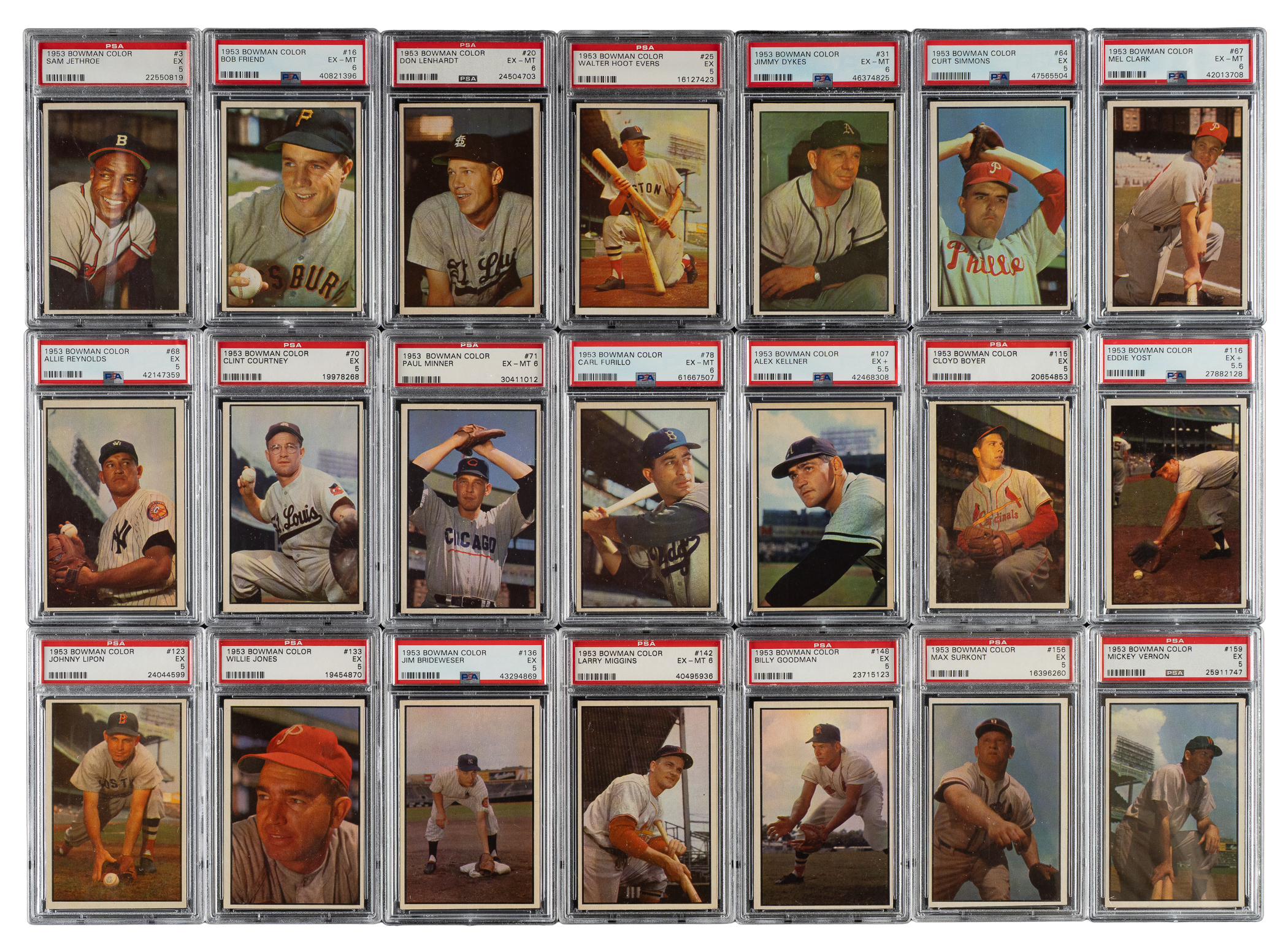 Presented is a very pleasing mid-grade complete set of 1953 Bowman Color baseball cards. Includes a duplicate of #107. Fifty-six cards have been professionally graded and encapsulated by PSA (30), SGC (14), BVG (9), and GAI (3). PSA Grading Composite: NM 7 (2 cards): #53 (SGC) and 109 (SGC 84). EX-MT+ 6.5 (1 card): #129 (GAI). EX-MT 6 (19 cards): #6 (SGC), 9 Rizzuto, 16, 20, 27 (BVG), 31, 40 Doby (SGC 80), 44 Bauer/Berra/Mantle (GAI), 47 (BVG), 63 (BVG), 67, 71, 78, 86 (BVG), 92 Hodges (SGC 80), 95 (BVG), 102 (BVG), 138 (BVG 6), and 142. EX+ 5.5 (4 cards): #18 Fox (SGC 70), 42 (SGC 70), 107, and 116. EX 5 (25 cards): #1 Williams, 2 (SGC 60), 3, 10 Ashburn, 17 (SGC), 25, 46 Campanella, 64, 65 Roberts, 68, 70, 73 (SGC), 80 Kiner (BVG), 93 Rizzuto/Martin (SGC 60), 96 (SGC), 114 Feller, 115, 121 Berra (SGC 60), 123, 133, 136, 148, 153 Ford, 156, and 159. VG-EX+ 4.5 (3 cards): #32 Musial (SGC), 118 Martin (BVG), and 120 (GAI). VG-EX 4 (2 cards): #59 Mantle and 117 Snider. The condition of the 105-card unencapsulated balance is 15% Ex-Mt to Nr/Mt, 72% Vg-Ex to Ex, and 13% Gd to Vg (including a few that measure a bit small and one with a slight trim). Unencapsulated Keys: #33 Reese (Vg), 51 Irvin (Ex), 55 Durocher (Vg-Ex+), 62 Kluszewski (Vg-Ex+), 81 Slaughter (80/20 T/B, otherwise Ex), 97 Mathews (measures a bit small, otherwise Vg-Ex), 99 Spahn (Vg+), 101 Schoendienst (Ex), 146 Wynn (Vg+), and 160 Abrams (Ex). This is a very crisp and clean complete set of this classic 1950s gum-card issue. The equivalent SMR value for just 53 of the graded cards (not including the three GAI-graded cards and factoring in the six half grades at the lower whole-grade level) is $7,155. Total 161 cards (set of 160 plus one duplicate). The size/weight of this item requires that there will be an additional shipping charge for this lot.