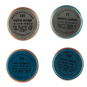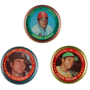 Presented is a complete set of 1971 Topps metal coins. These coins were issued as a special insert in baseball-card wax packs. The set features all the major stars of the era, including Mays, Clemente, Aaron, Rose, and many more. Condition ranges from Vg-Ex to Nr/Mt (most show varying degrees of rust spots along the rims, which is characteristic of this set), with a few slightly higher and lower. Keys: #58 Yastrzemski (Vg-Ex+), 71 Clemente (Ex), 101 Rose (Ex+), 108 Jackson (Ex), 137 Aaron (Ex+), 149 Bench (Ex-Mt), and 153 Mays (Ex-Mt). This is a very attractive mid- to high-grade insert coin set. Total: 153 coins.