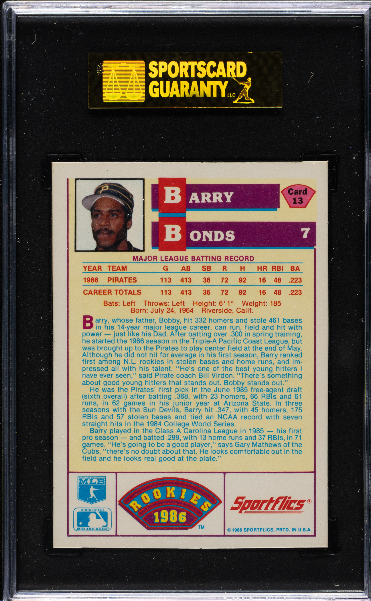 1988 Score Glossy #265 Barry Bonds SGC MINT 96