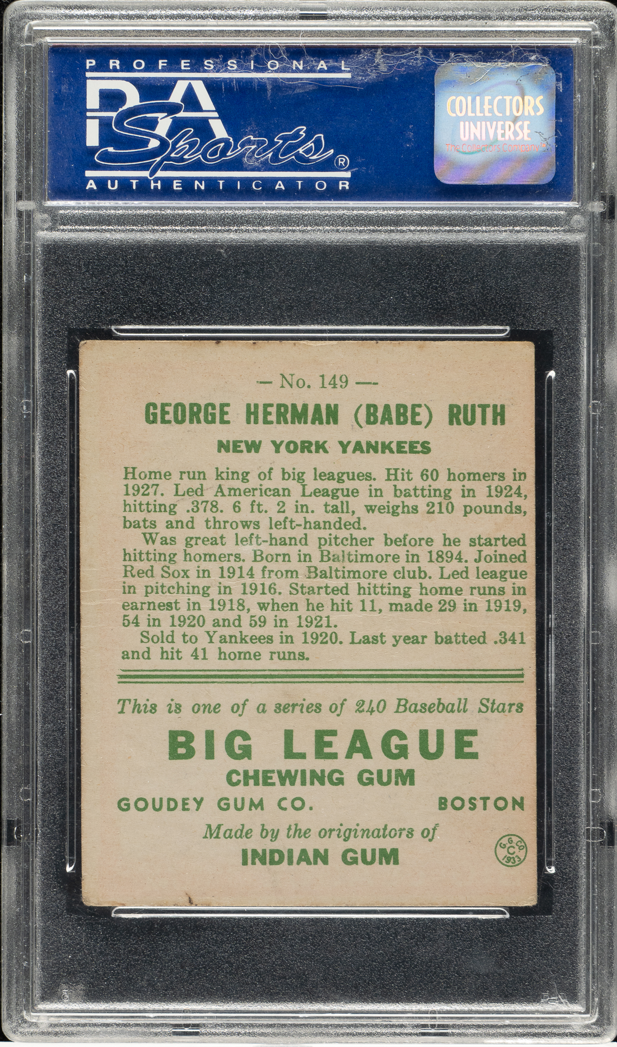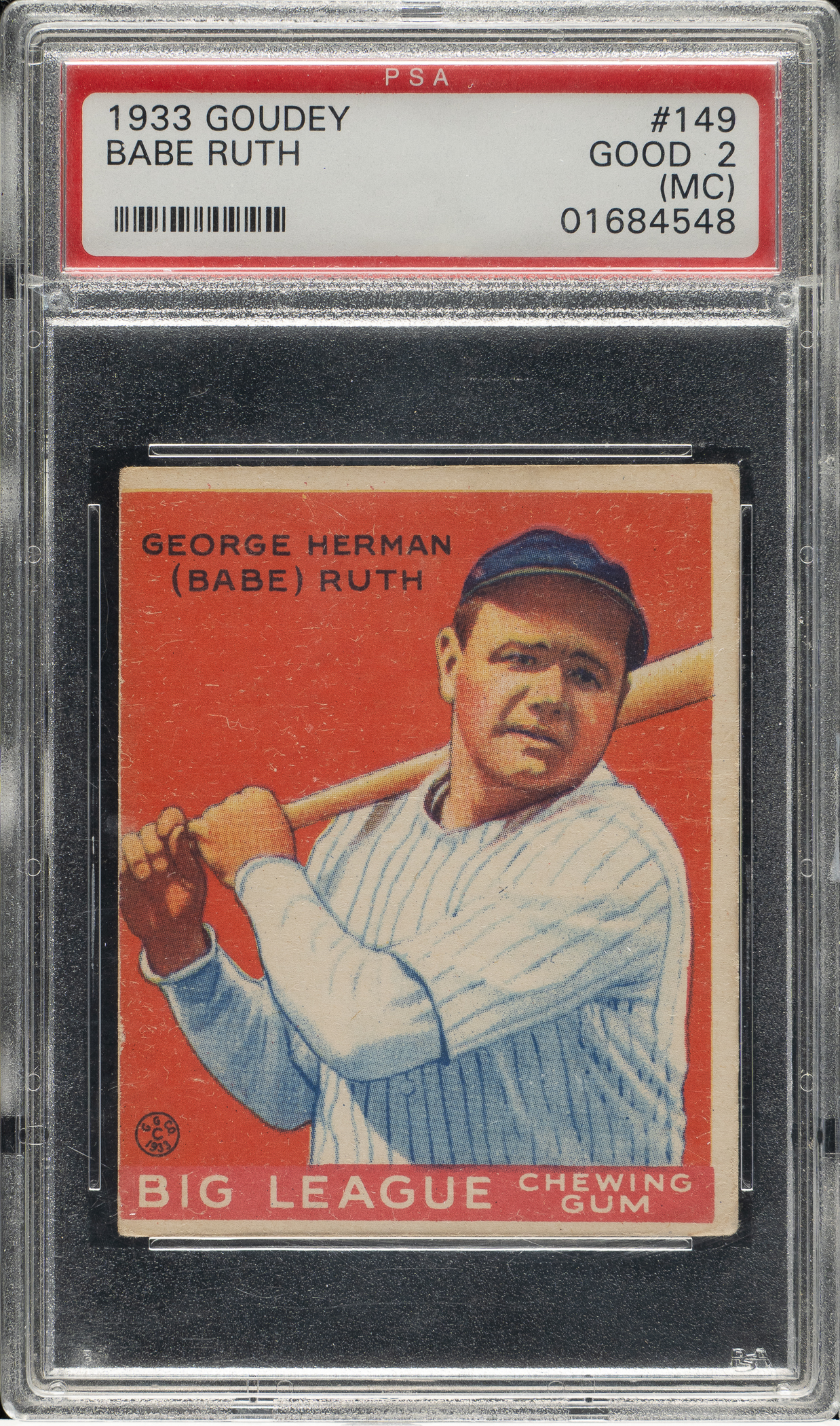 Graded GOOD 2 (MC) by PSA. Modestly graded example of one of Babe Ruth's classic cards: #149, red background, from the 1933 Goudey series. This example has a brilliant red background, outstanding registration, honest corner wear, and centering toward the extreme left (hence the qualifier). Clean reverse with bold green text. Moderate creasing (more prevalent along the reverse) contributes to the assigned grade.