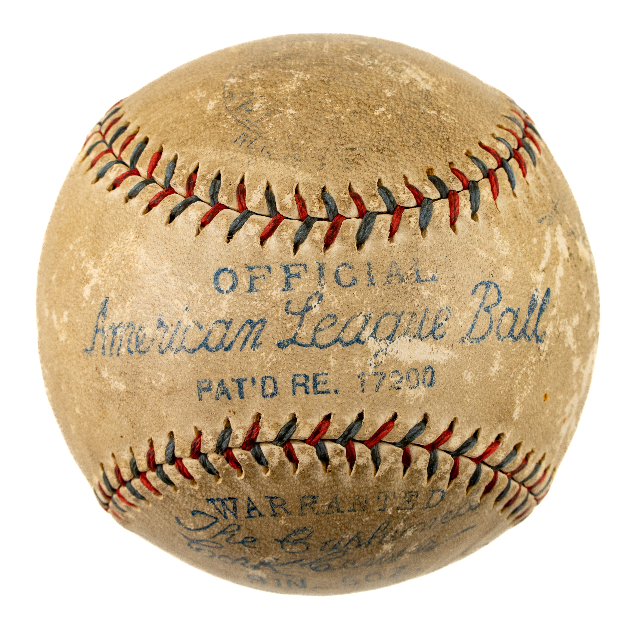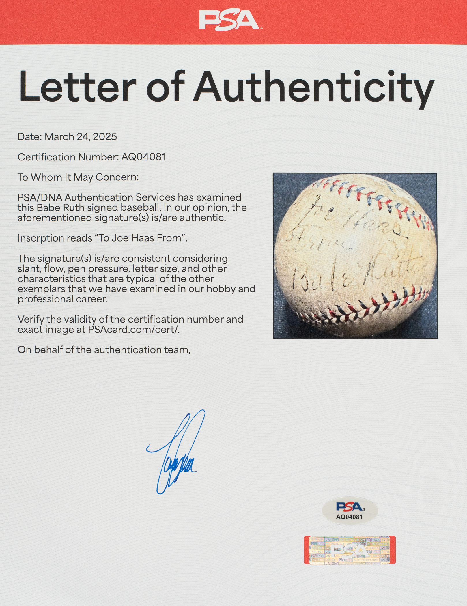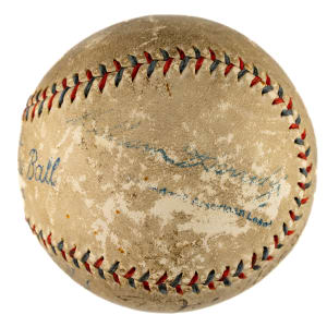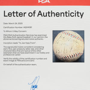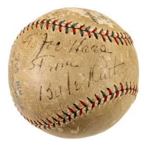 Official American League baseball (Harridge) signed in black fountain pen by Babe Ruth on a side panel. Ruth has inscribed the ball "To Joe Haas / From / Babe Ruth," with a portion of his signature extending into the sweet spot. Based upon the manufacturer's stampings, this ball was produced in 1932-1933. Ruth's inscription and signature are fairly uniform in their execution. The ball has toning throughout and several scattered abrasions. The manufacturer's stampings remain bold and legible. In Good condition overall. Full LOA from PSA/DNA.