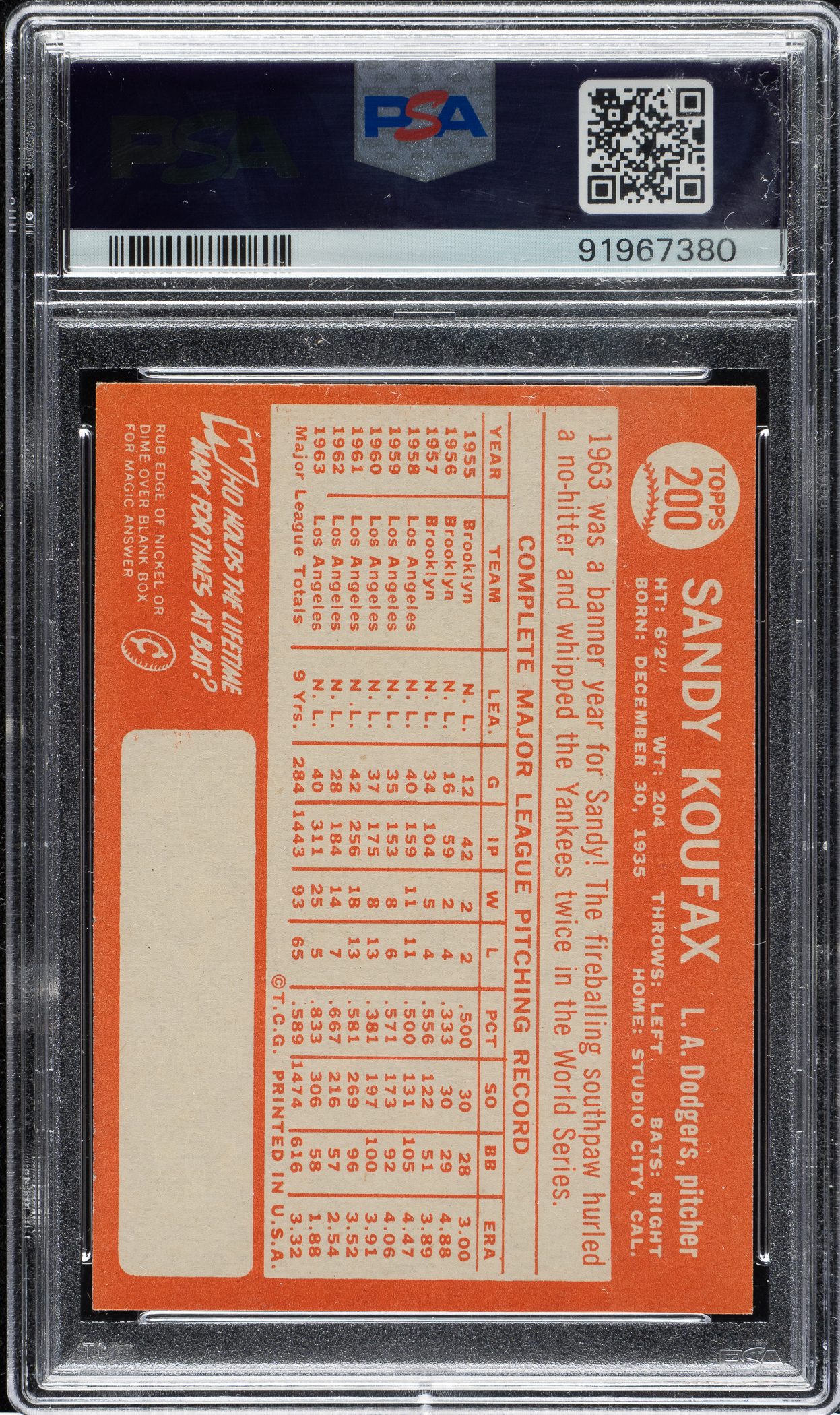 Lot # 2040: 1964 Topps #200 Sandy Koufax PSA EX-MT 6