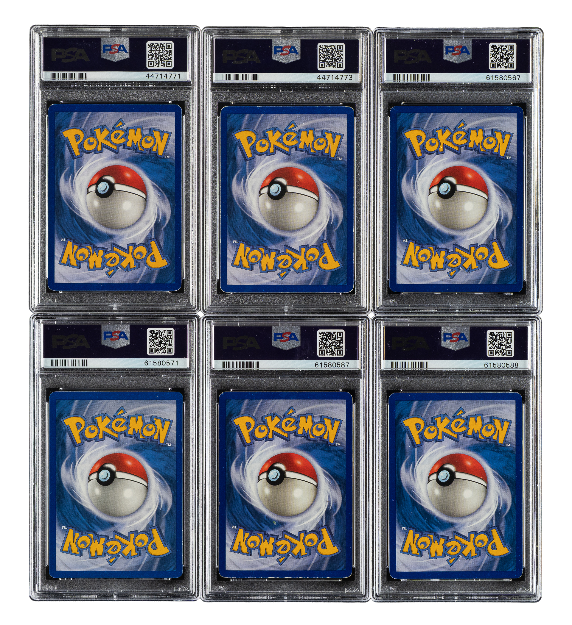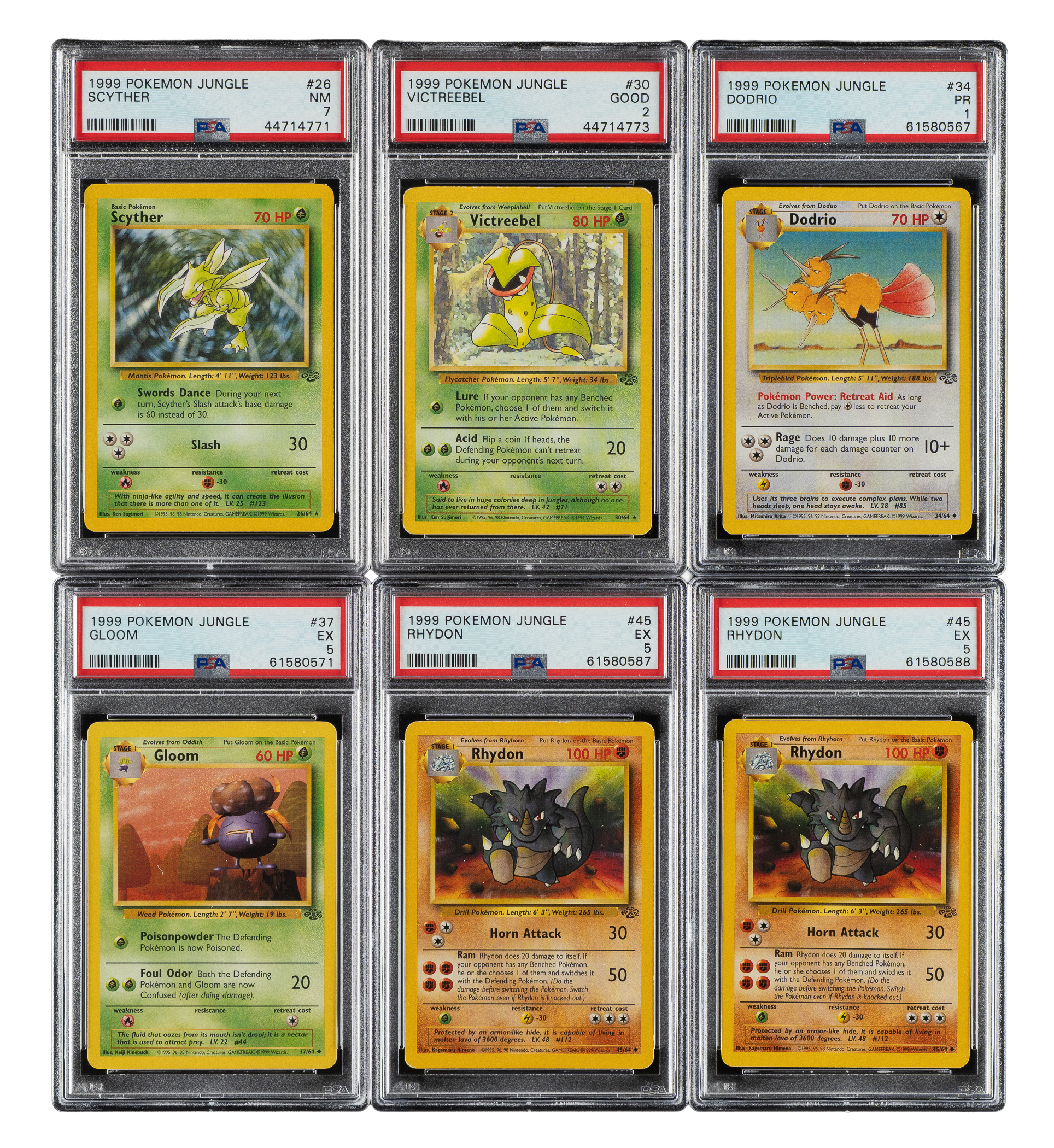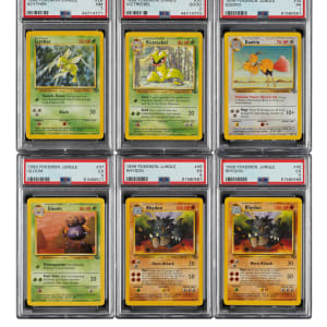 Collection of six 1999 Pokemon Jungle cards, each graded and encapsulated by PSA. This collection consists of the following: 1) #26 (NM 7). 2) #30 (GOOD 2). 3) #34 (POOR 1). 4) #37 (EX 5). 5-6) two #45 (EX 5). Total 6 cards.