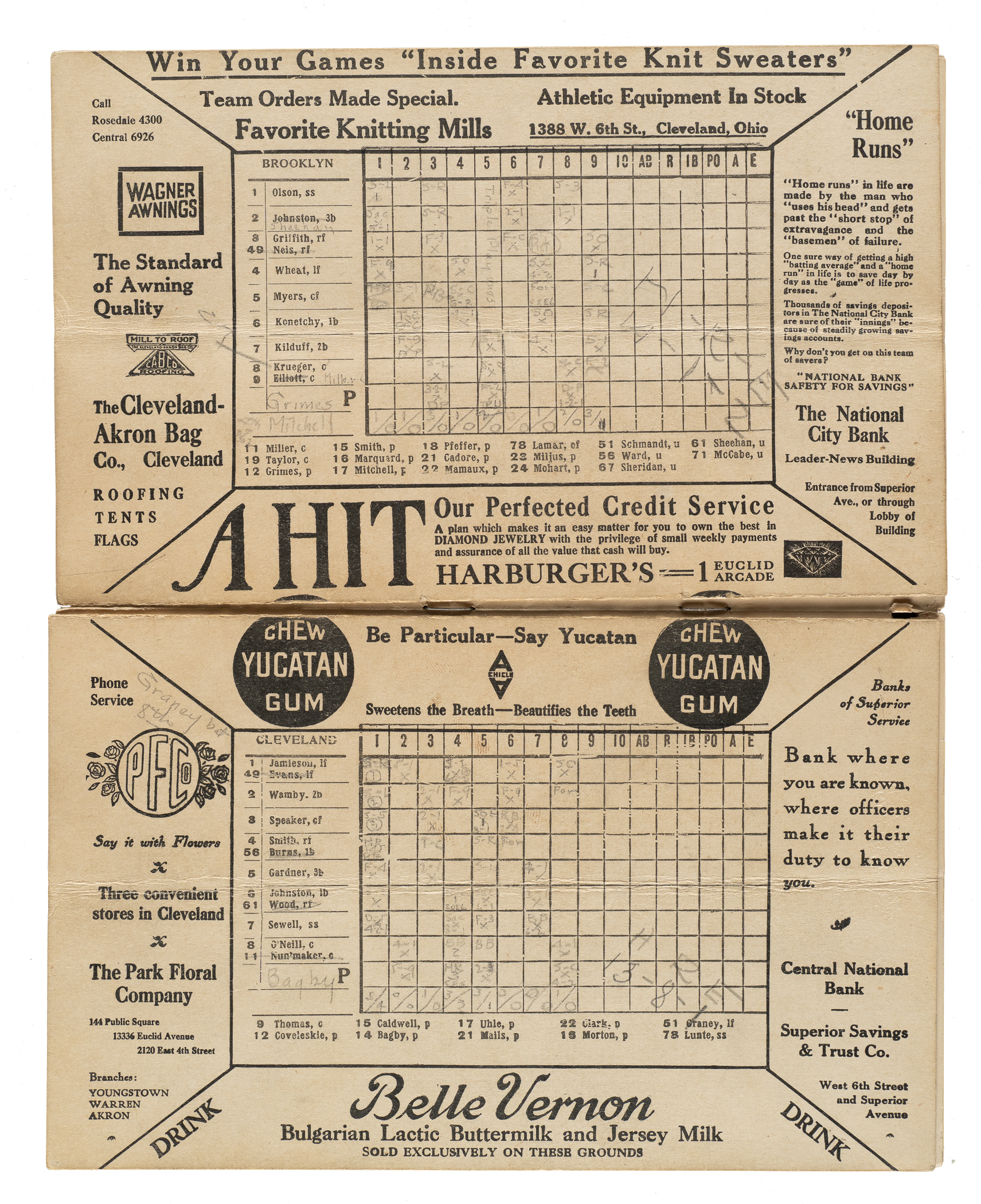 Exceedingly rare Cleveland Indians program issued for the 1920 World Series against the Brooklyn Robins. The preprinted lineups include Wambsganss, Speaker, Smith, and Sewell for Cleveland, and Wheat, Olson, Myers, and Konetchy for Brooklyn. In addition to being far rarer than its Brooklyn Robins counterpart, this program is especially notable because it is neatly scored in pencil for Game 5, in which three historic World Series "firsts" occurred: unassisted triple play (made by Bill Wambsganss, still the only one ever in a World Series game); grand slam (by Cleveland's Elmer Smith); and home run by a pitcher (by Cleveland's Jim Bagby). While both Smith's and Bagby's home runs were significant "firsts," it is Wambsganss who is best remembered today. An unassisted triple play is the rarest feat in all of baseball, less likely than even a perfect game. In the history of Major League Baseball, only 15 players have ever accomplished the trick. Because the play is more the result of luck rather than of individual skill, few fans can recall the names of even one or two players who have made an unassisted triple play, with the exception of one: Bill Wambsganss. Unlike those other 14 players, Wambsganss had the good fortune to record his triple play in the World Series, thereby ensuring that his name would forever remain prominently etched in the annals of baseball history. Wambsganss, who was playing second base for Cleveland, accomplished the feat in the fifth inning. The play helped Cleveland earn an 8-1 victory en route to winning the Series in seven games (the World Series was a best of nine in 1920). The program (5.5 x 8.75 inches) displays a vertical fold and creasing. The interior scoring pages have detached from the staples. In Fair condition overall.