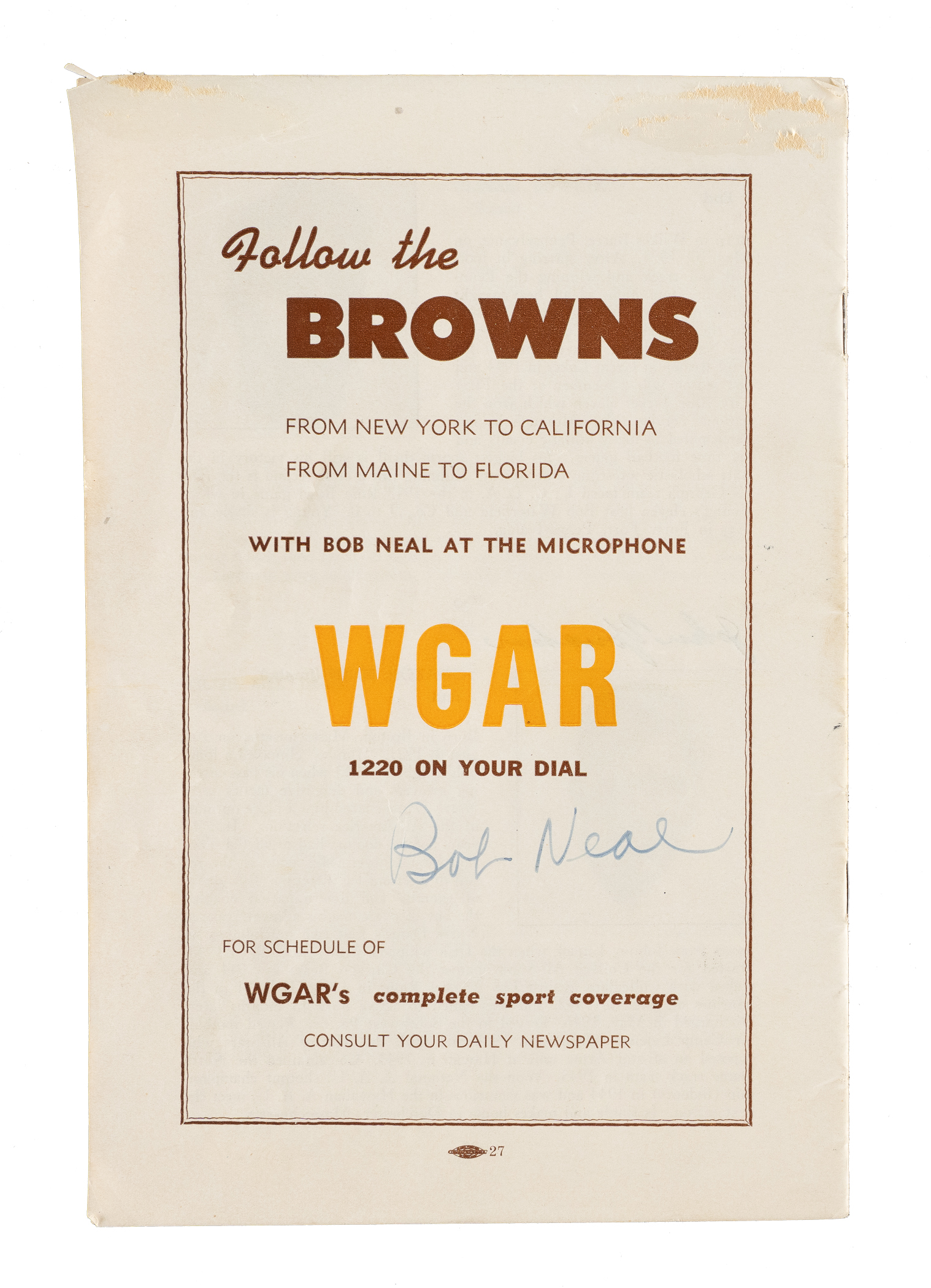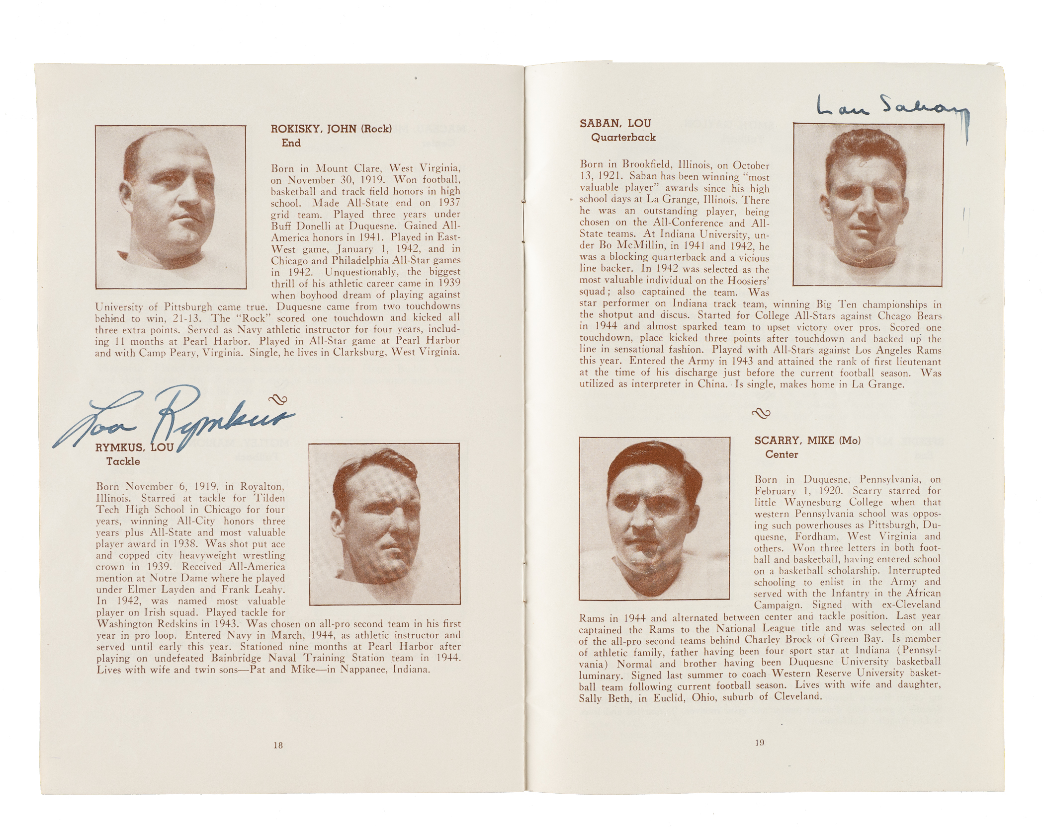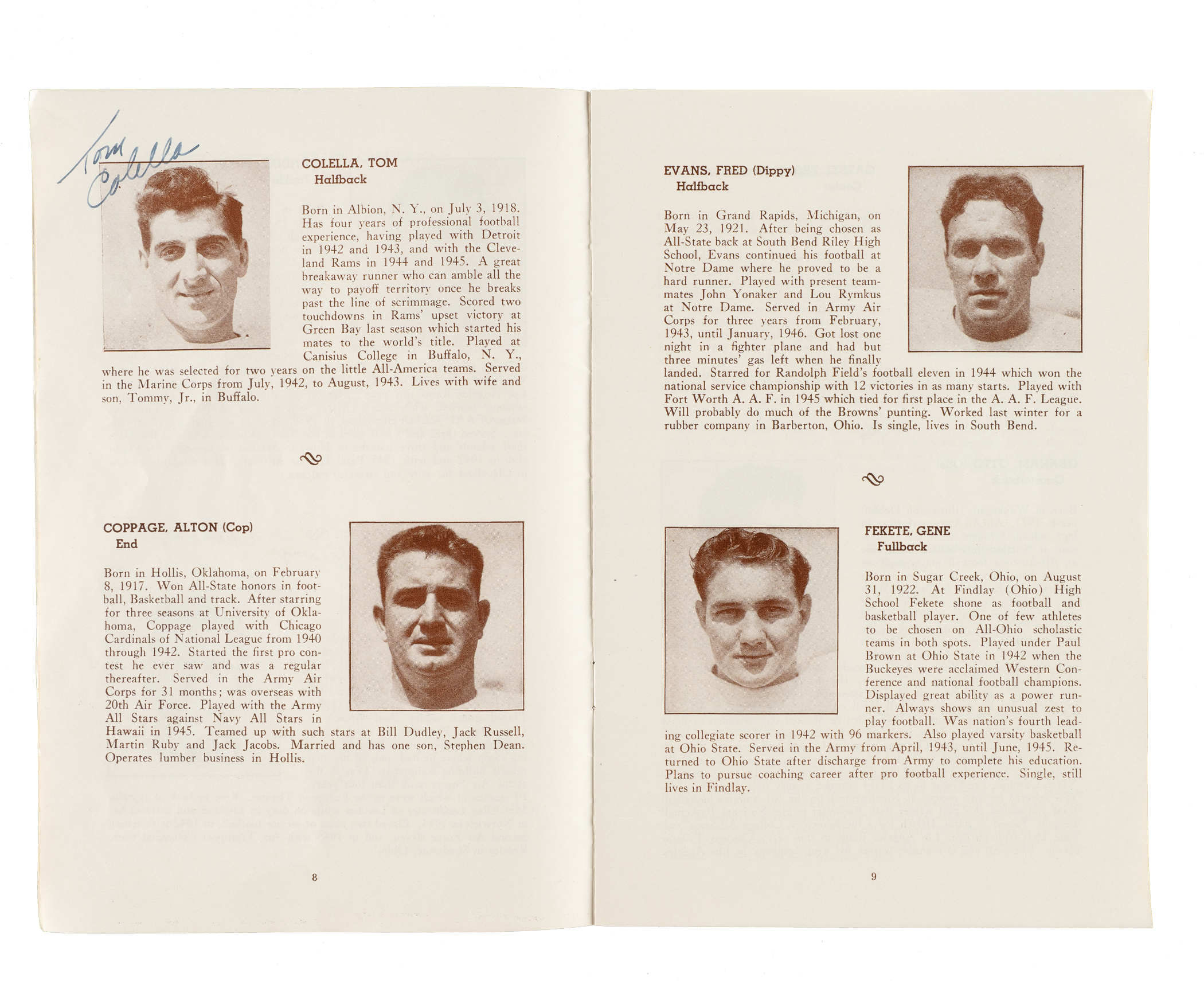1946 Cleveland Browns AAFC guide book signed along the interior pages in blue and black ink by six members of the team. The book is signed by Cheroke, Colella, Rymkus, Saban, Yonakor, and Neal (broadcaster, back cover). The AAFC was only in existence from 1946 to 1949. As such, any and all material relating to the league is scarce. The guide book (6 x 9 inches) exhibits scattered creasing. The back cover displays a chipped corner and a few spots of paper residue. Good condition overall. Auction LOA from James Spence/JSA.