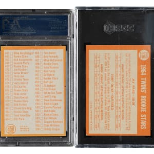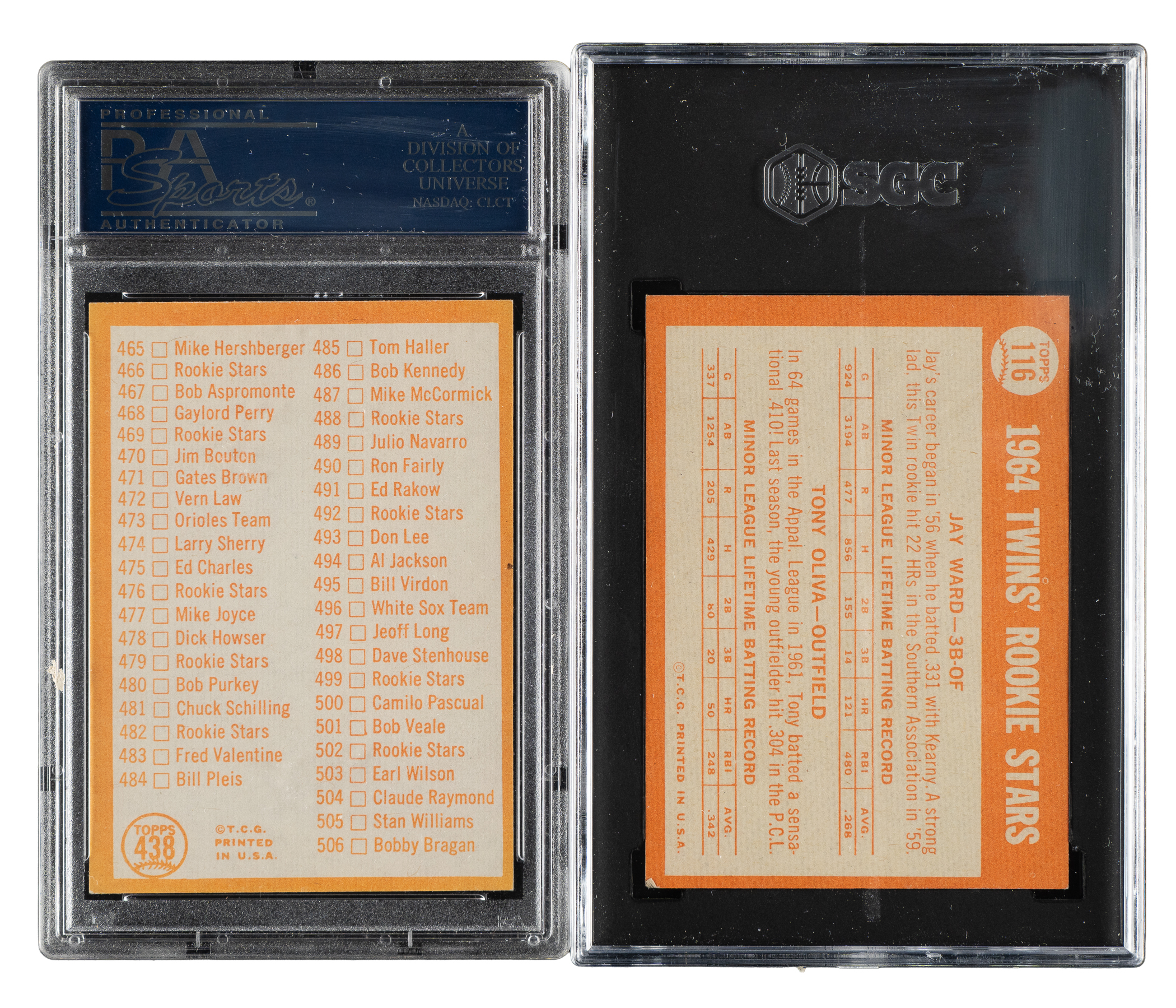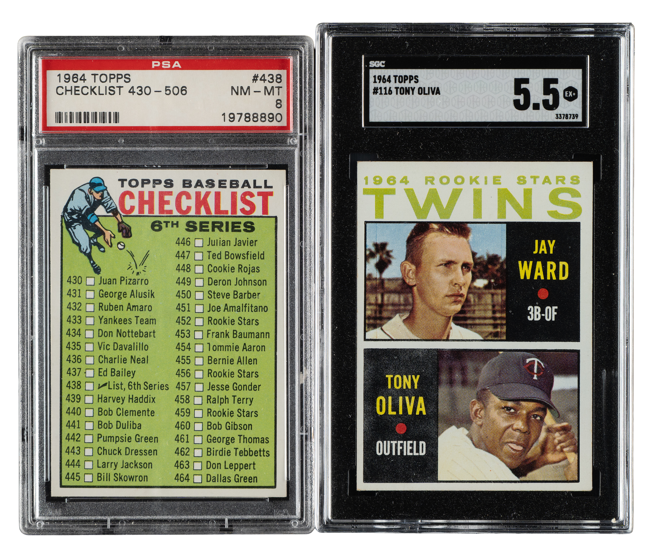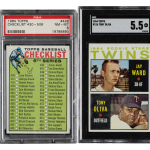 Pair of 1964 Topps cards, featuring Minnesota Twins Hall of Famer Tony Oliva. Both cards have been graded and encapsulated by PSA or SGC. This pair consists of the following: #116 Oliva (SGC EX+ 5.5) and 438 Checklist (NM-MT 8). Total: 2 cards.