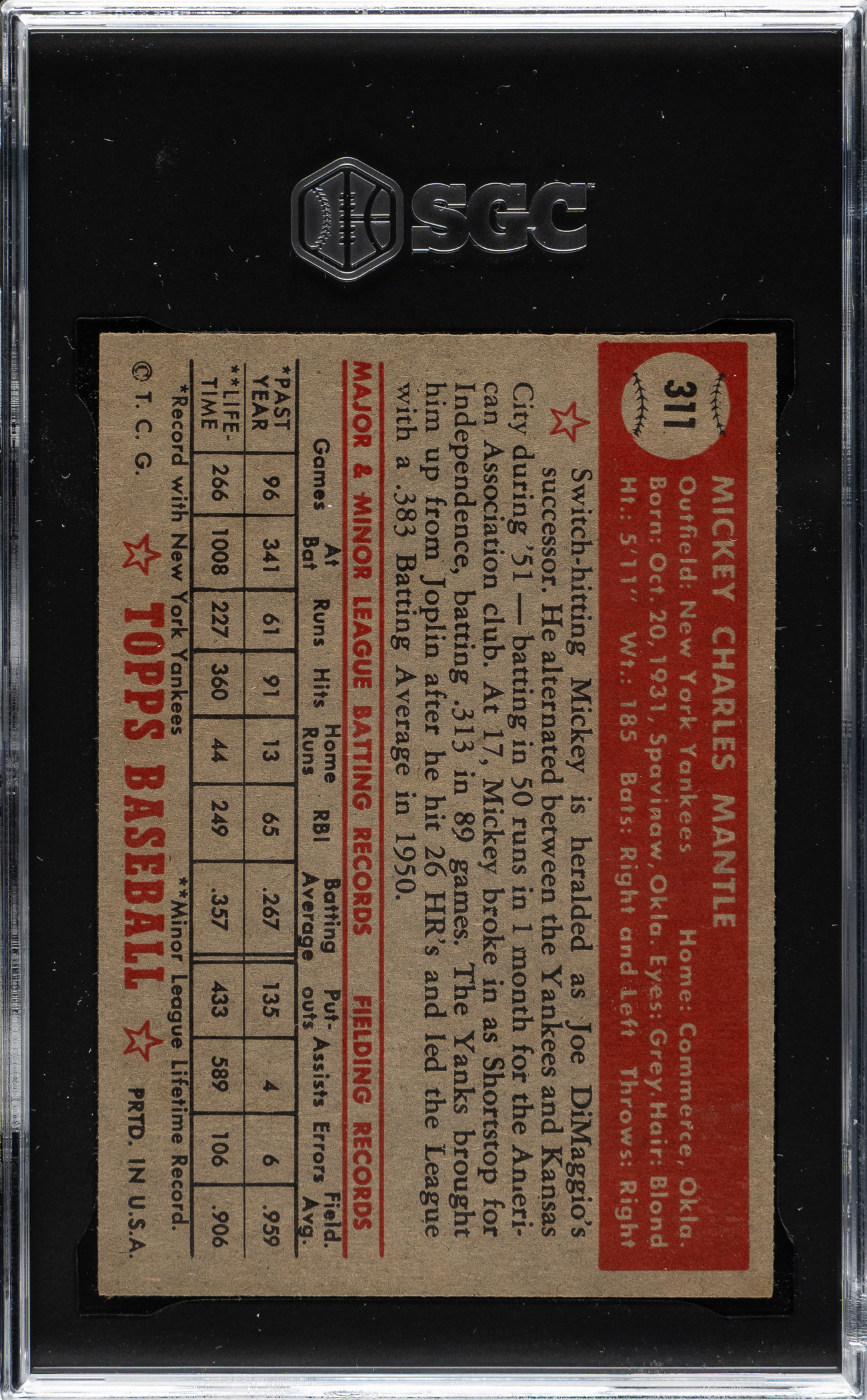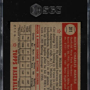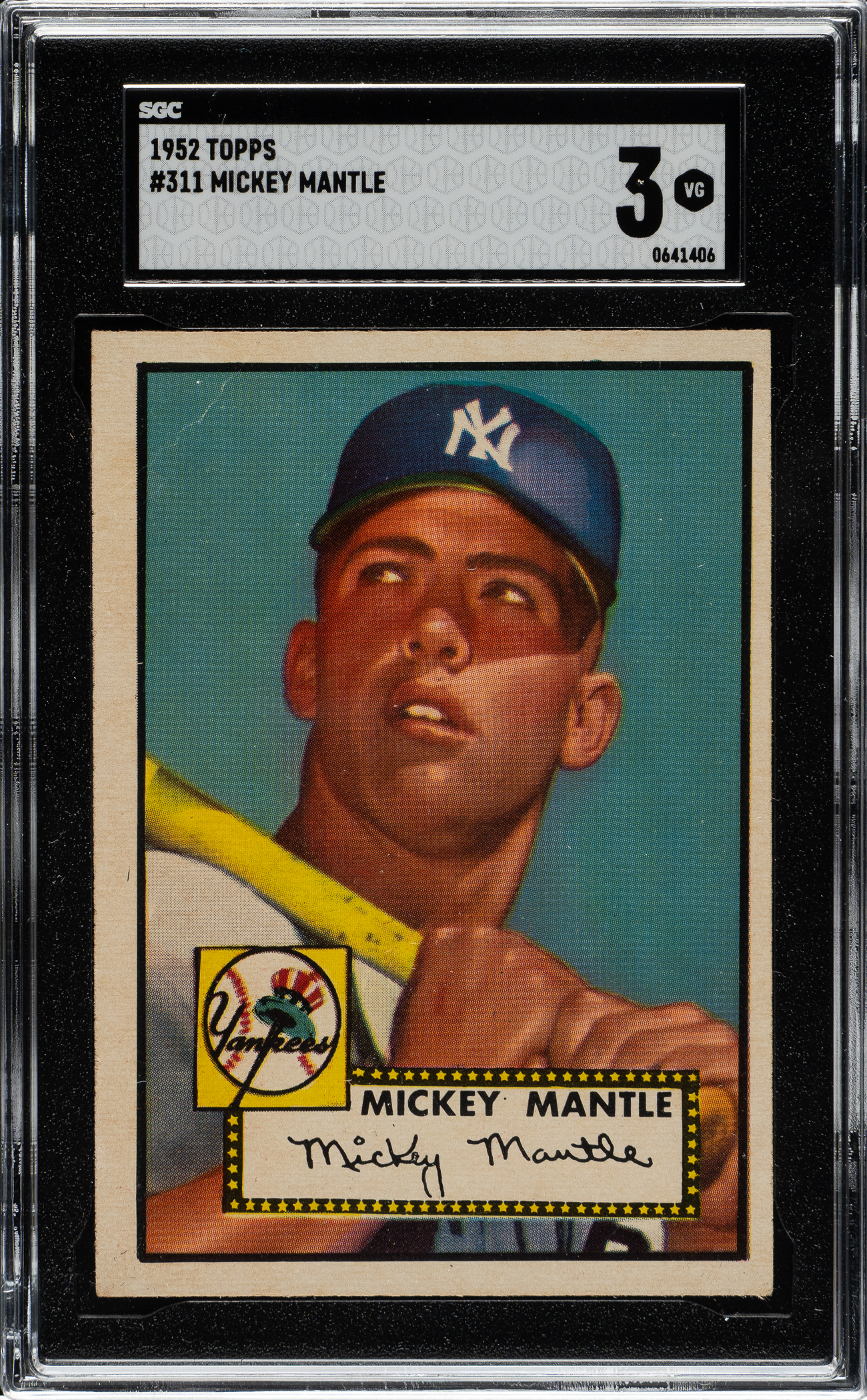 Graded VG 3 by SGC (submitted by REA). Very attractive 1952 Topps #311 Mickey Mantle. One of card collecting's classics, Mantle's card is the key to the 1952 Topps set, one of the most famous of all cards, and the single most popular and valuable postwar baseball card. The offered example has beautiful colors, a crisp image, and light wear at the corners (weaker lower right). The reverse is clean with bold printing. A diagonal crease near the upper-left corner factors into the assigned grade. The 1952 Topps Mantle has long been recognized as one of the most iconic "blue chips" of all vintage baseball cards, and a glance at sales records shows that, over the years, it has consistently risen in value in all grades. In August 2022, an SGC MINT+ 9.5 example sold at public auction for $12.6 million, a record at that time for any sports card. This 1952 Topps Mantle presents a particularly significant collecting and investing opportunity as it is a strong mid-grade example.