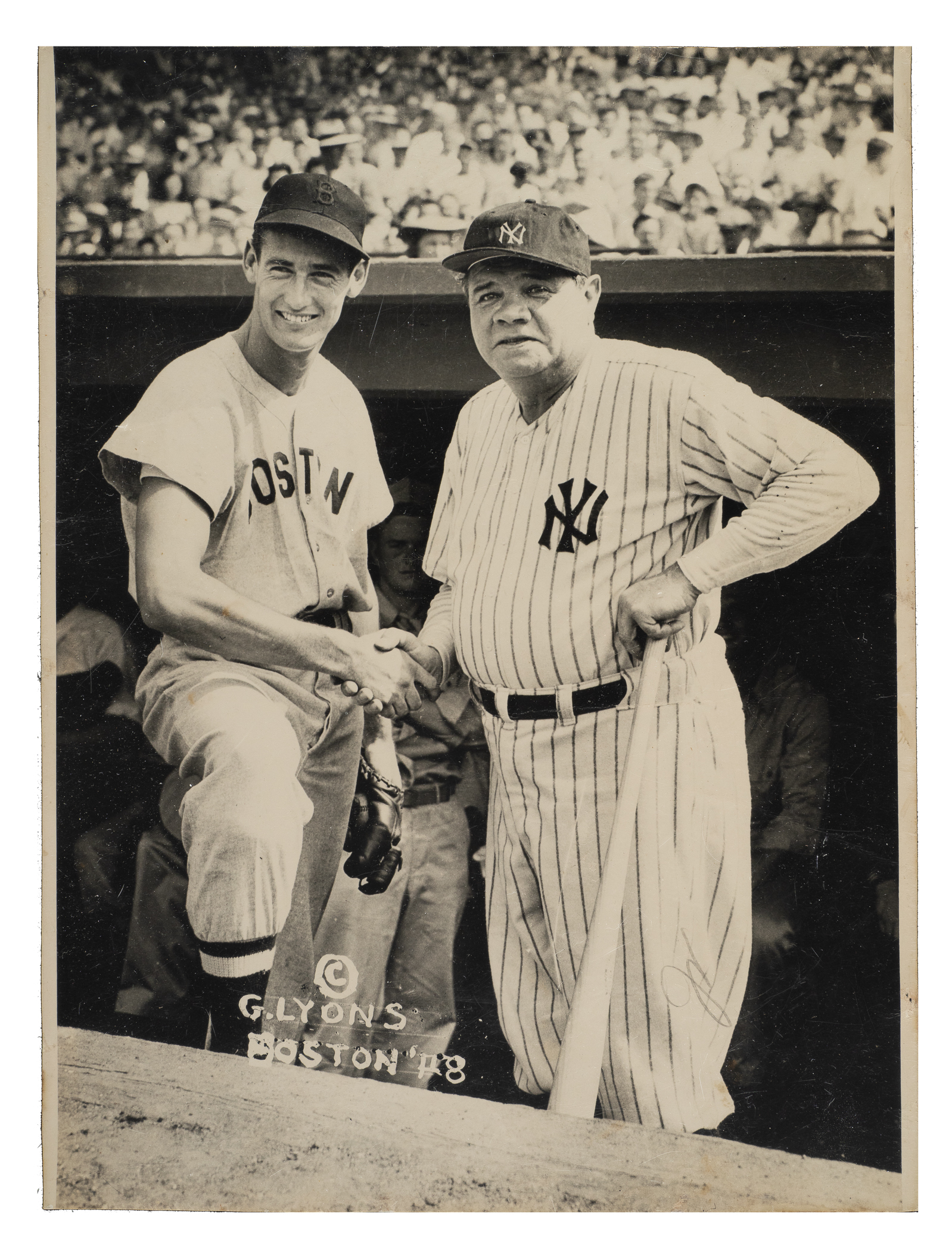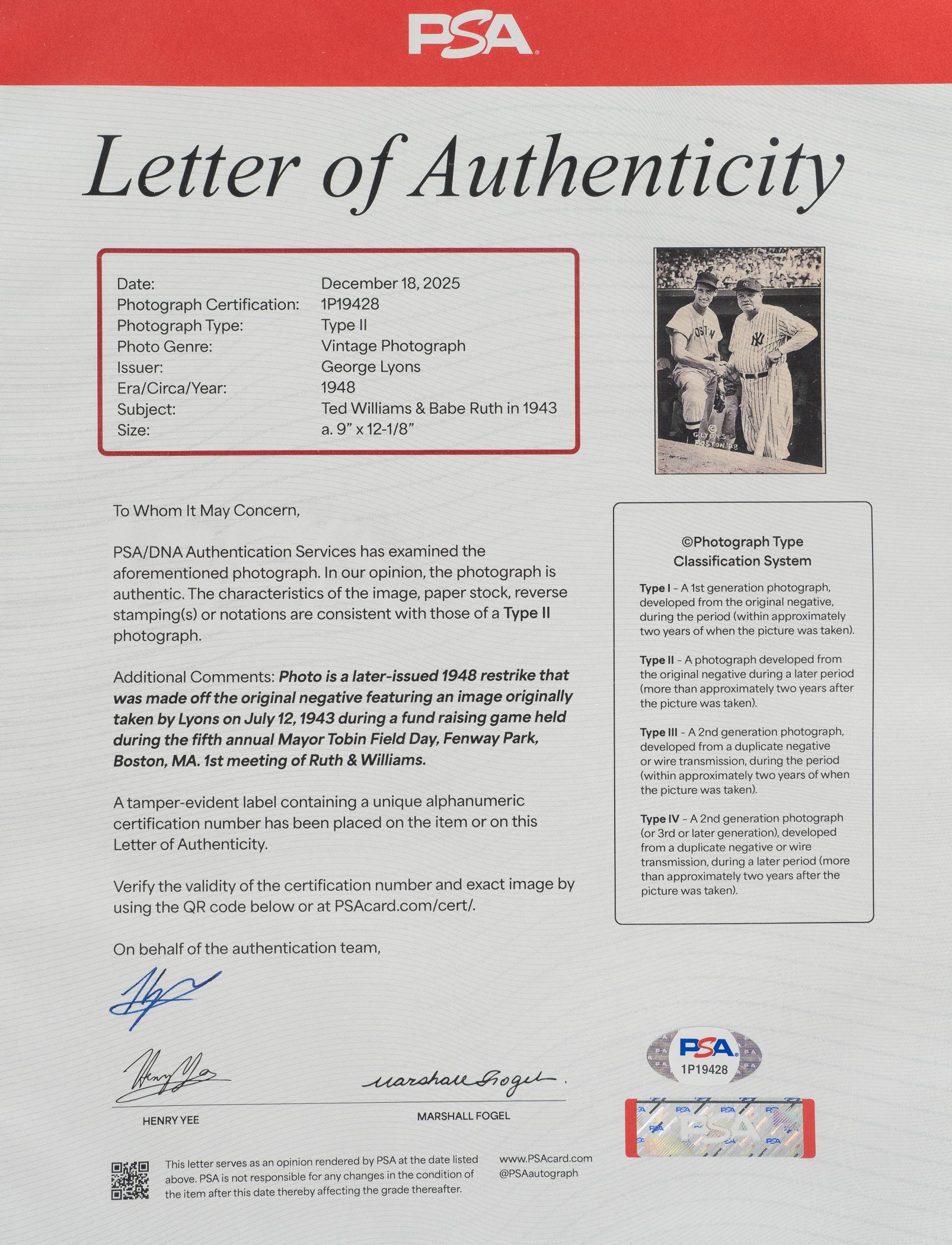 Vintage photo capturing Ted Williams and Babe Ruth posing together in 1943. Certified as original Type II photo by PSA/DNA. Per PSA/DNA, the "photo is a later issued 1948 restrike that was made off the original negative featuring an image originally taken by (George) Lyons on July 12, 1933, during a fundraising game held during the fifth annual Mayor Tobin Field Day, Fenway Park." The photo, which has been trimmed to its current dimensions of 9 x 12-1/8 inches, displays scattered creasing and a pencil mark along Ruth's pant leg. Fair condition overall.