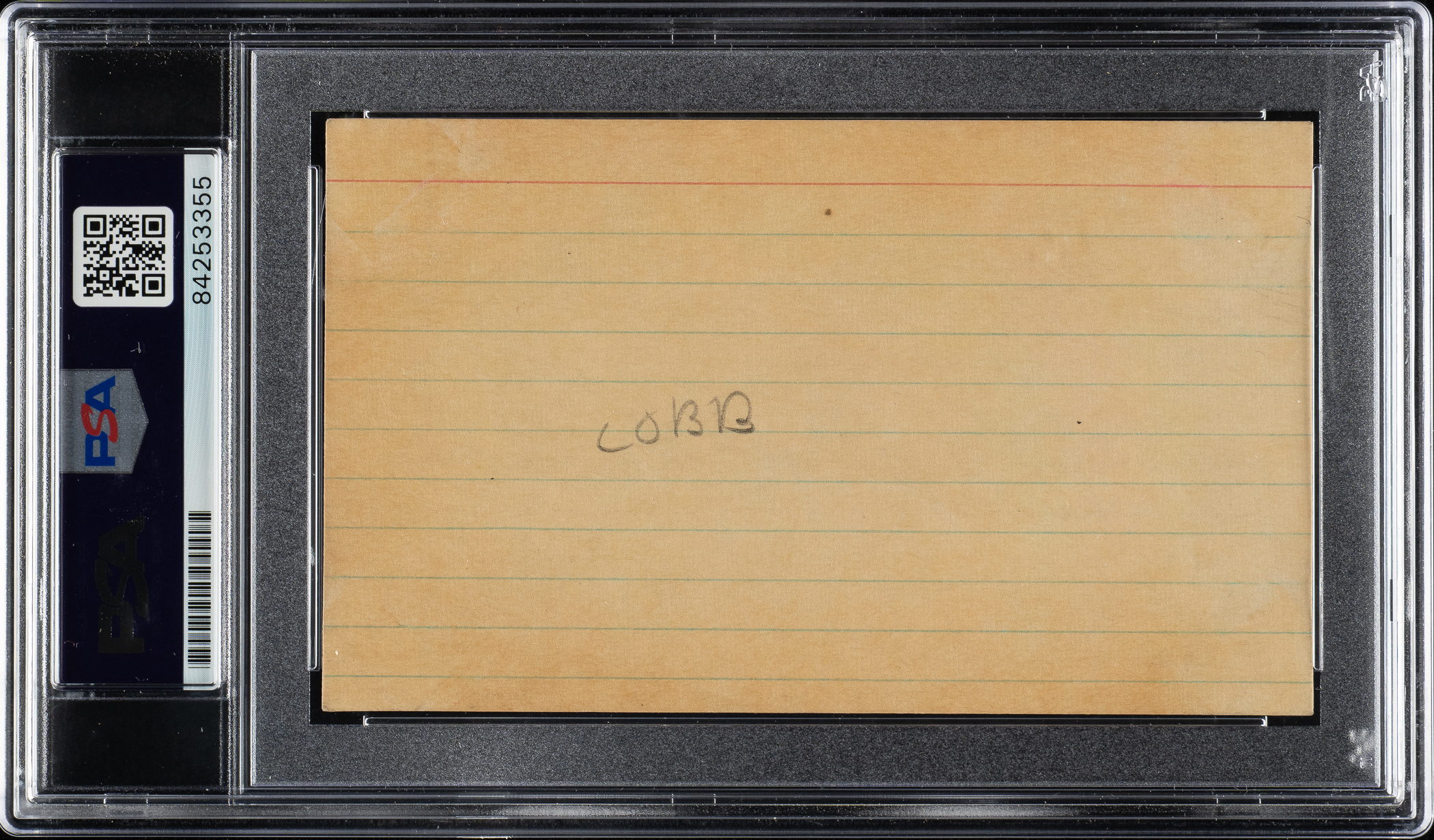 Index card signed by Detroit Tigers Hall of Famer Ty Cobb in his customary green ink. Encapsulated by PSA/DNA, with the signature certified as "Authentic." The card (5 x 3 inches), which has a small image of Cobb affixed to the upper left, remains in Very Good condition overall.