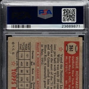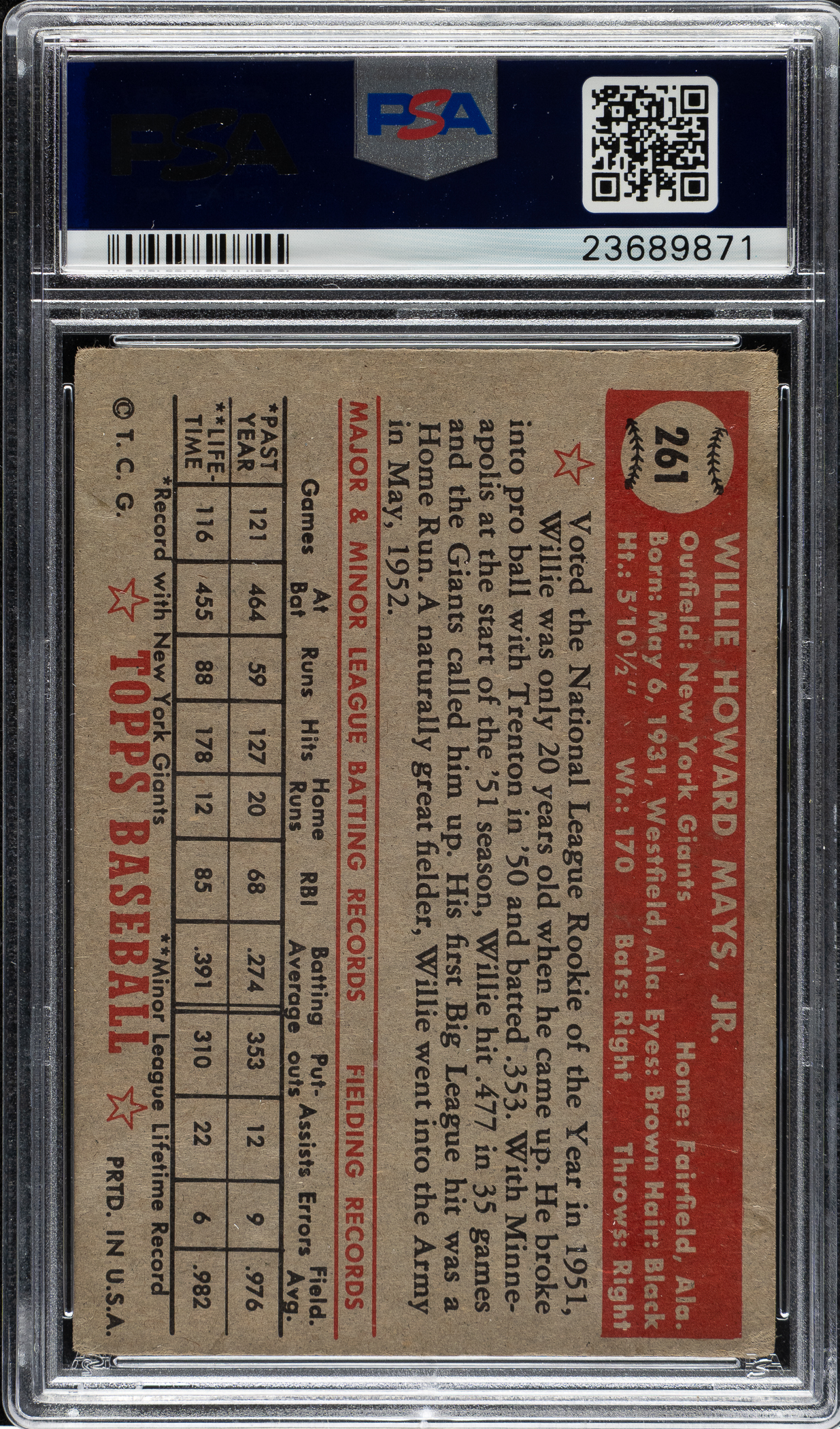 Graded VG-EX 4 by PSA. Attractive mid-grade example of New York Giants Hall of Famer Willie Mays from the 1952 set, one of collecting's most classic cards. The offered card has a bold purple background, a crisp image, and even corner wear. Clean reverse. This is a very attractive example of one of Willie Mays' most important cards.