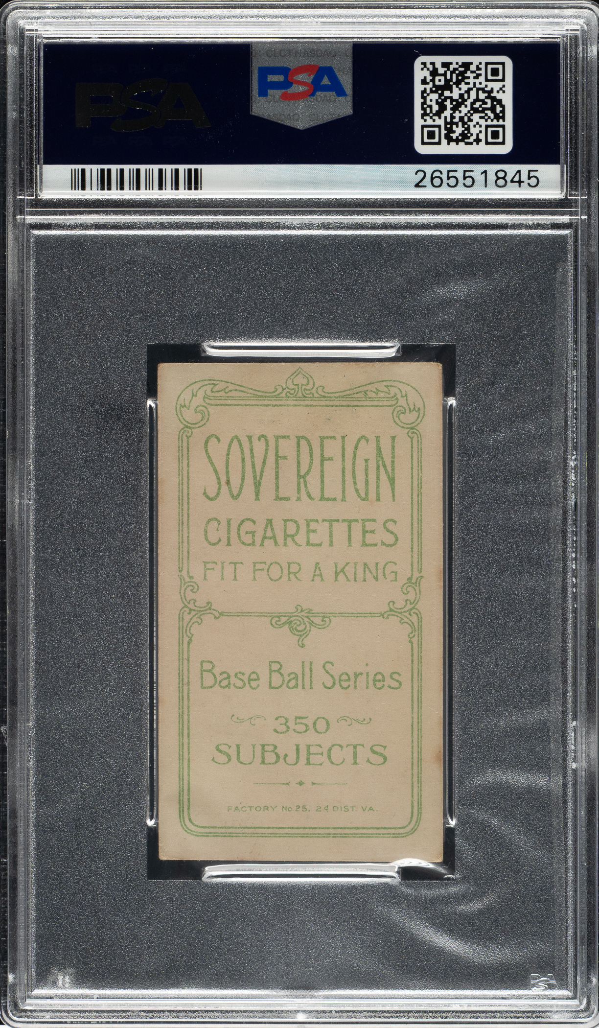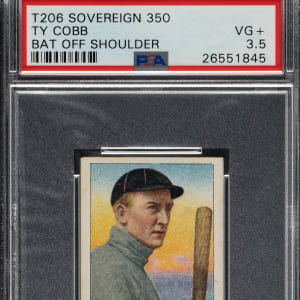 Graded VG+ 3.5 by PSA. Extremely attractive example of this classic tobacco card of Detroit Tigers Hall of Famer Ty Cobb with a Sovereign 350 back. The T206 Ty Cobb bat-off-shoulder pose is one of the key cards in the set. This well-centered card has bright colors, a crisp image, and even corner wear. There is a small wrinkle that extends between the left border and the "C" in "CIGARETTES" on the otherwise boldly printed and clean advertising reverse. This is an outstanding example of the legendary Ty Cobb.