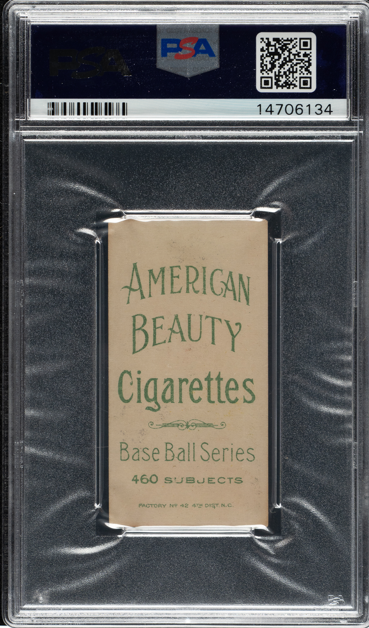 Graded EX-MT 6 by PSA. This is the ONLY example of this front/back combination graded at this level by PSA with none higher! Beautiful example of Bill Bradley (with bat, Cleveland Naps) with a very desirable American Beauty 460 advertising reverse. T206Resource.com ranks American Beauty 460 as the 13th most difficult back to acquire out of 39 total backs available within the T206 White Border set. Bright, crisp, and clean, both front and back, with bold colors and strong corners. Clean reverse with bold green text. An ideal example of this advertising back worthy of the finest T206 collection.