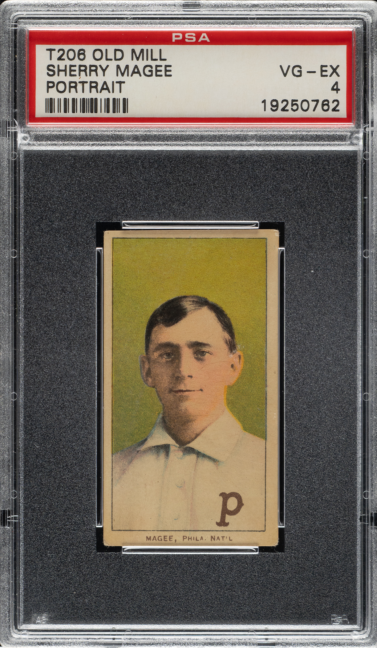Graded VG-EX 4 by PSA. Outstanding Sherry Magee (portrait, Philadelphia Phillies) from the classic T206 White Border set featuring a desirable Old Mill advertising reverse. This particular pose is notably scarce with the Old Mill back, and based on its condition, it is very likely one of the highest graded examples to exist with this back (please note that the population of this front/back combination does not appear on the PSA pop report). The offered card has bright colors, a crisp image, and honest corner wear. The important advertising reverse is boldly printed. A superb example of this advertising back worthy of the finest T206 collection.