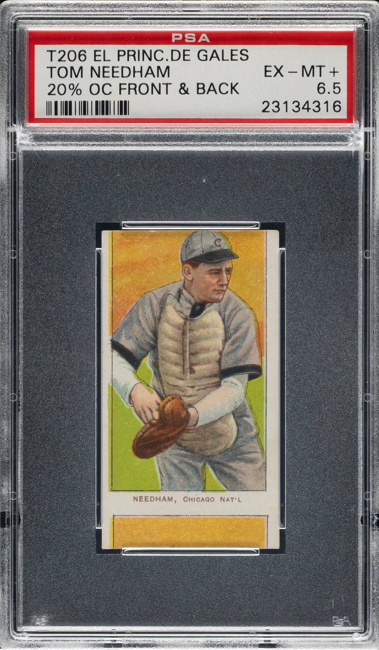 Graded EX-MT+ 6.5 by PSA. Extremely unusual T206 card of Tom Needham (Chicago Cubs) with a factory printing error. The card has a severe factory miscut on the front and back, including a substantial portion of the card below on the sheet. When it comes to the T206 set, which is the most highly collected of all vintage card sets, anything unusual (especially if it might in any way shed light on the mysteries of the T206 set) is of great note. An extremely rare and unusual printing anomaly such as this, that can be appreciated at a glance and that is so rare, is particularly desirable. The offered card has brilliant colors, outstanding registration, and light corner wear. The El Principe De Gales advertising reverse is boldly printed and clean. As collectors have become more sophisticated, there has been a growing appreciation for all great rarities and unusual cards associated with the landmark T206 set. This is a fascinating and striking printing error from the T206 set. Because of its uniqueness, there is no consensus on the value of this card. We are confident the auction process will provide clarity.