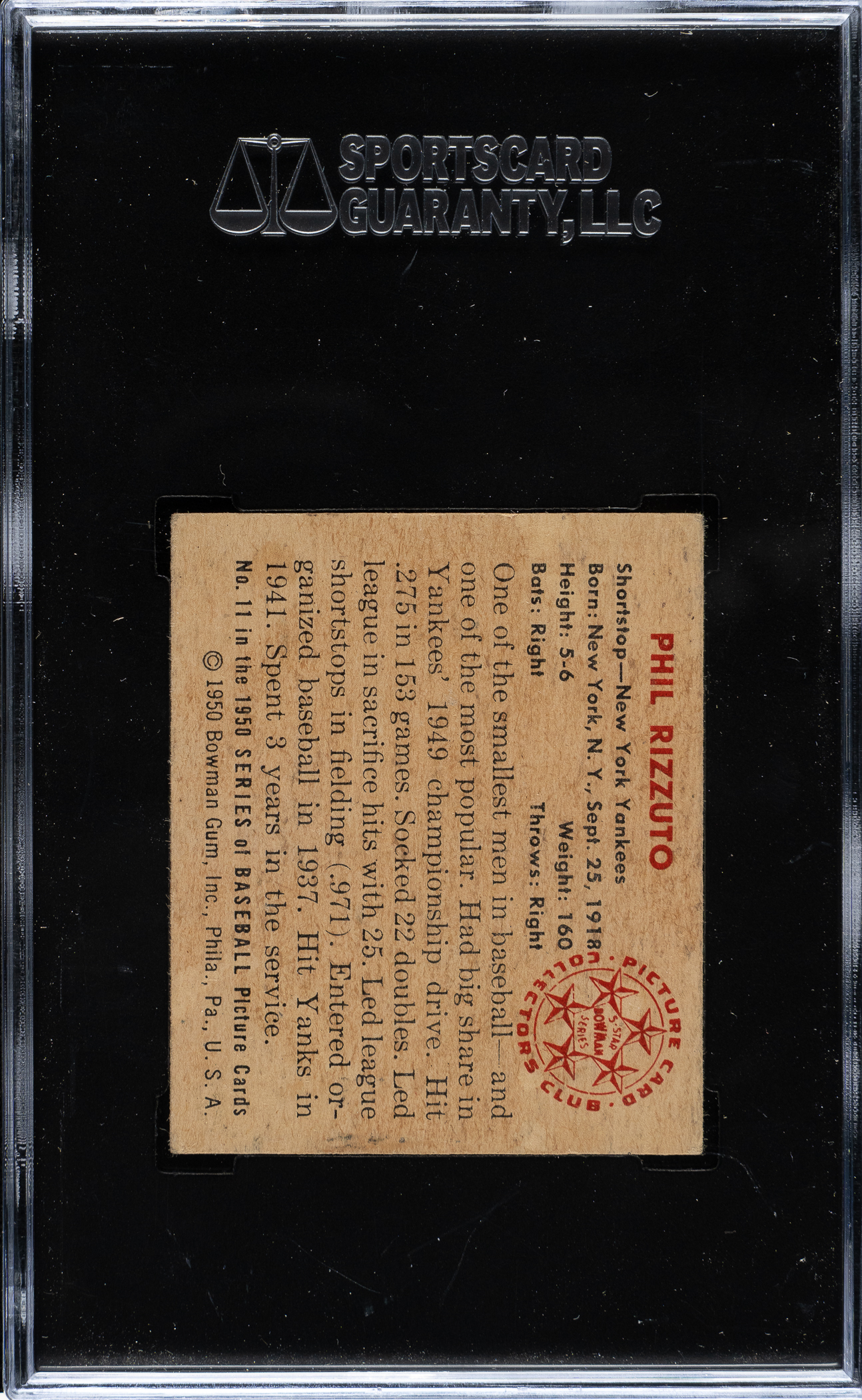 Lot # 1753: 1950 Bowman #11 Phil Rizzuto SGC VG/EX 50