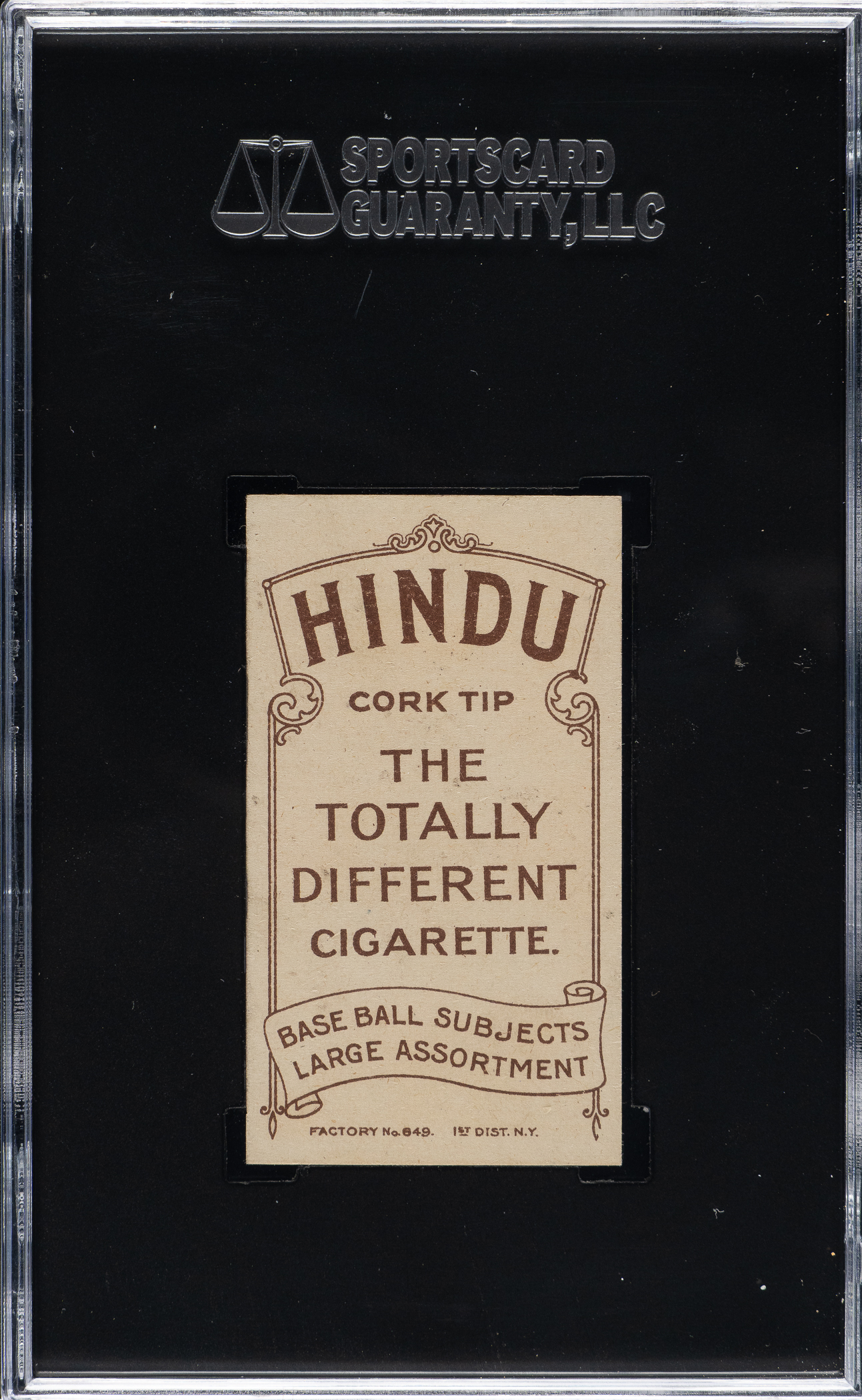 Graded EX/NM+ 6.5 by SGC. This is the ONLY example of this front/back combination graded at this level by SGC with none higher! Spectacular high-grade example of New York Giants Hall of Famer Christy Mathewson (portrait) from the T206 series featuring a desirable Brown Hindu advertising reverse. This is a particularly rare and noteworthy combination! Rare-back T206s are always popular, but are naturally all the more special when the card happens to feature one of the keys in the set. That is certainly the case here, as Mathewson's portrait card is one of the most desirable of all vintage Hall of Famer cards, one of the most popular of all T206 designs, and one of the highest regarded of all his cards. The offered example boasts beautiful colors, excellent registration, outstanding centering, and strong corners. The brown Hindu print on the reverse is flawless and bold. This is an exceptional high-grade, rare-back example of one of the most popular cards in the entire T206 set.