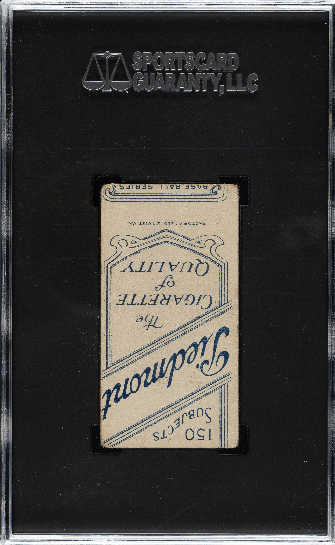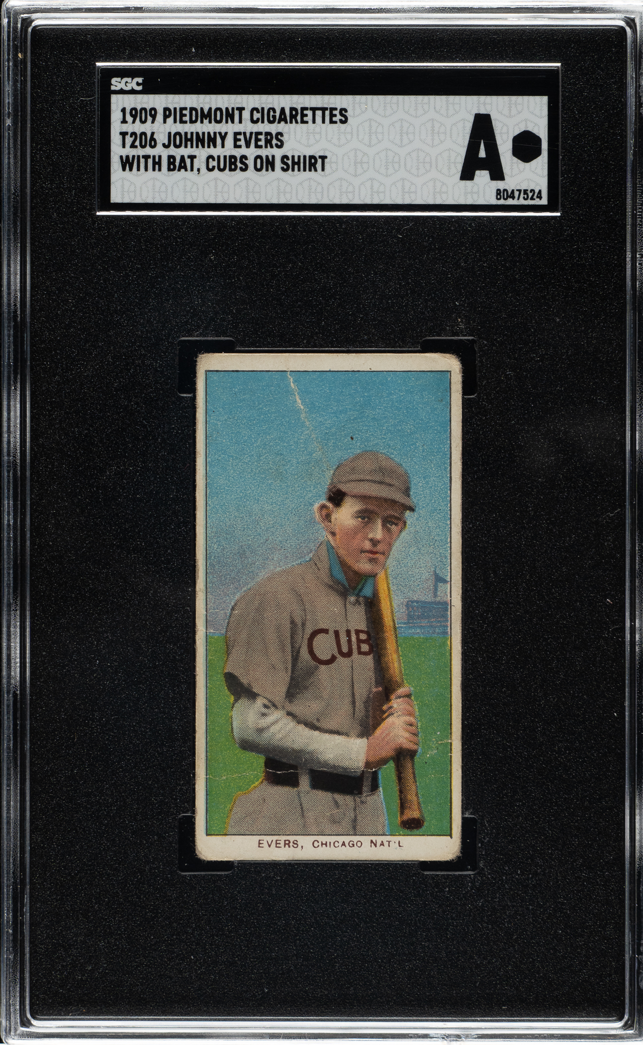 Extremely unusual T206 card of Chicago Cubs Hall of Famer Johnny Evers (with bat, Cubs shirt), with a very significant factory printing error: Despite appearing perfectly normal on the front, the card has a severe factory miscut and misprinted back in which the Piedmont advertisement is printed upside down. The top part of another Piedmont back also appears at the top of the card. Most of the known upside-down back examples display a portion of another advertisement. When it comes to the T206 set, which is the most highly collected of all vintage card sets, anything unusual (especially if it might in any way shed light on the mysteries of how the T206 set was printed) is of great note. This is an extremely rare and unusual printing anomaly. Encapsulated as Authentic by SGC due to being hand-cut. The card presents with bold colors and excellent centering, but it is in modest overall condition due to moderate creasing and rounding of the corners. The back is boldly printed. As collectors have become more sophisticated, they have become increasingly appreciative of all great rarities and unusual cards associated with the landmark T206 set. This is a fascinating printing error. Value is always subjective, but in this case, because of its relative uniqueness, there is no consensus on value for this card. We are confident the auction process will provide clarity.
