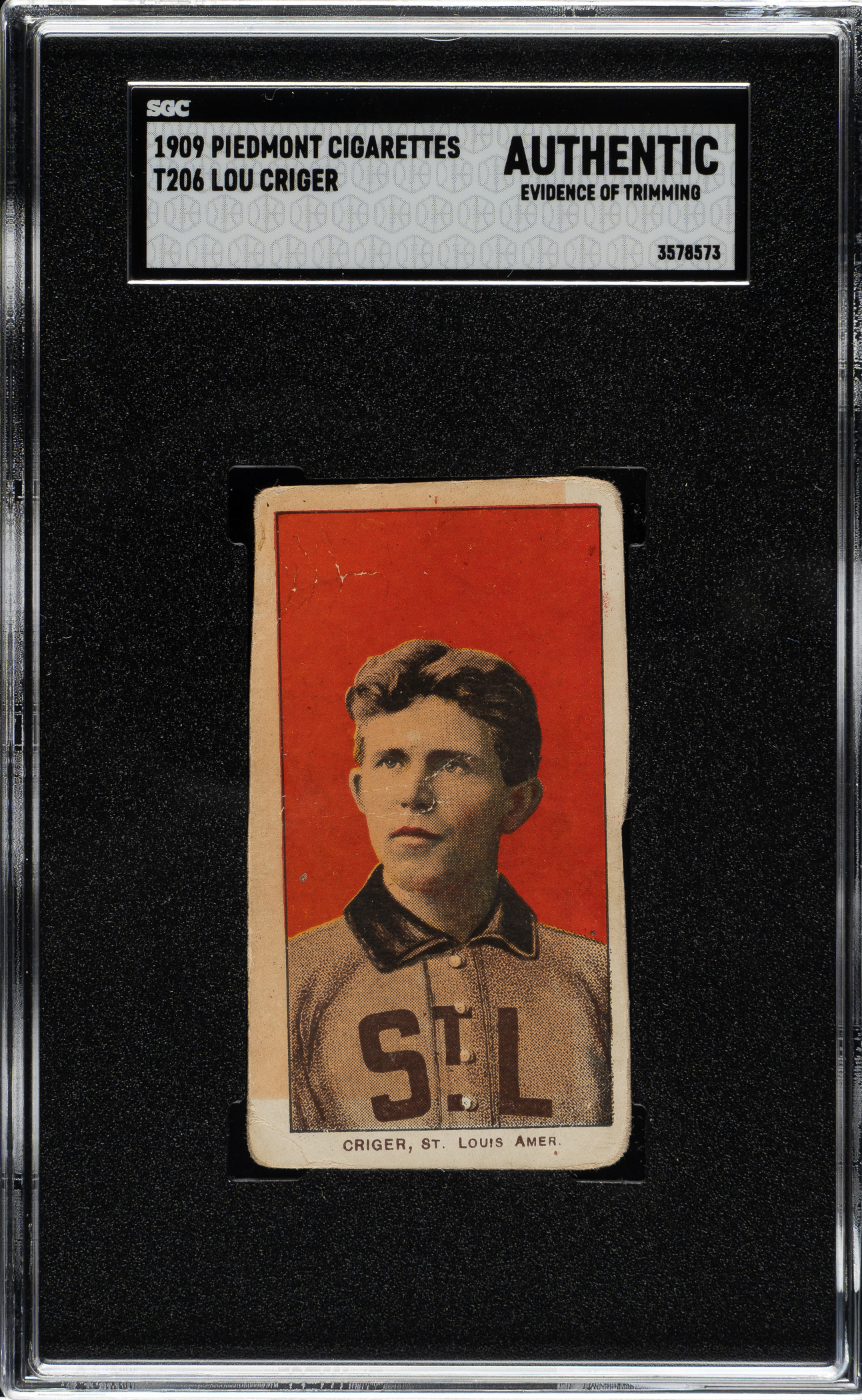 Graded Authentic by SGC. Lou Criger of the St. Louis Browns. The card, which features an interesting printing irregularity and unnatural edge, suggests this card is a desirable printer’s scrap.
