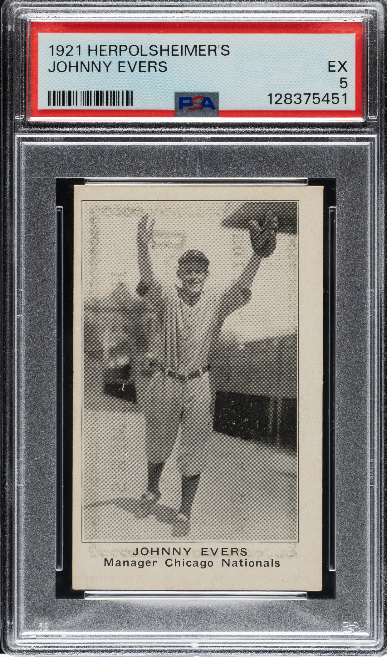 Graded EX 5 by PSA. This is the only example graded at this level by PSA, with none higher, and one of only two examples they've evaluated to date. Superb example of Chicago Cubs Hall of Famer Johnny Evers from the extremely rare 1921 Herpolsheimer's Clothing set. The Herpolsheimer's set is very similar in design to E121 American Caramel and related issues. This example exhibits outstanding clarity and strong corners with light touches of wear at the tips. Clean reverse with bold black text. This is a fantastic sample card of Johnny Evers from this extremely rare series.