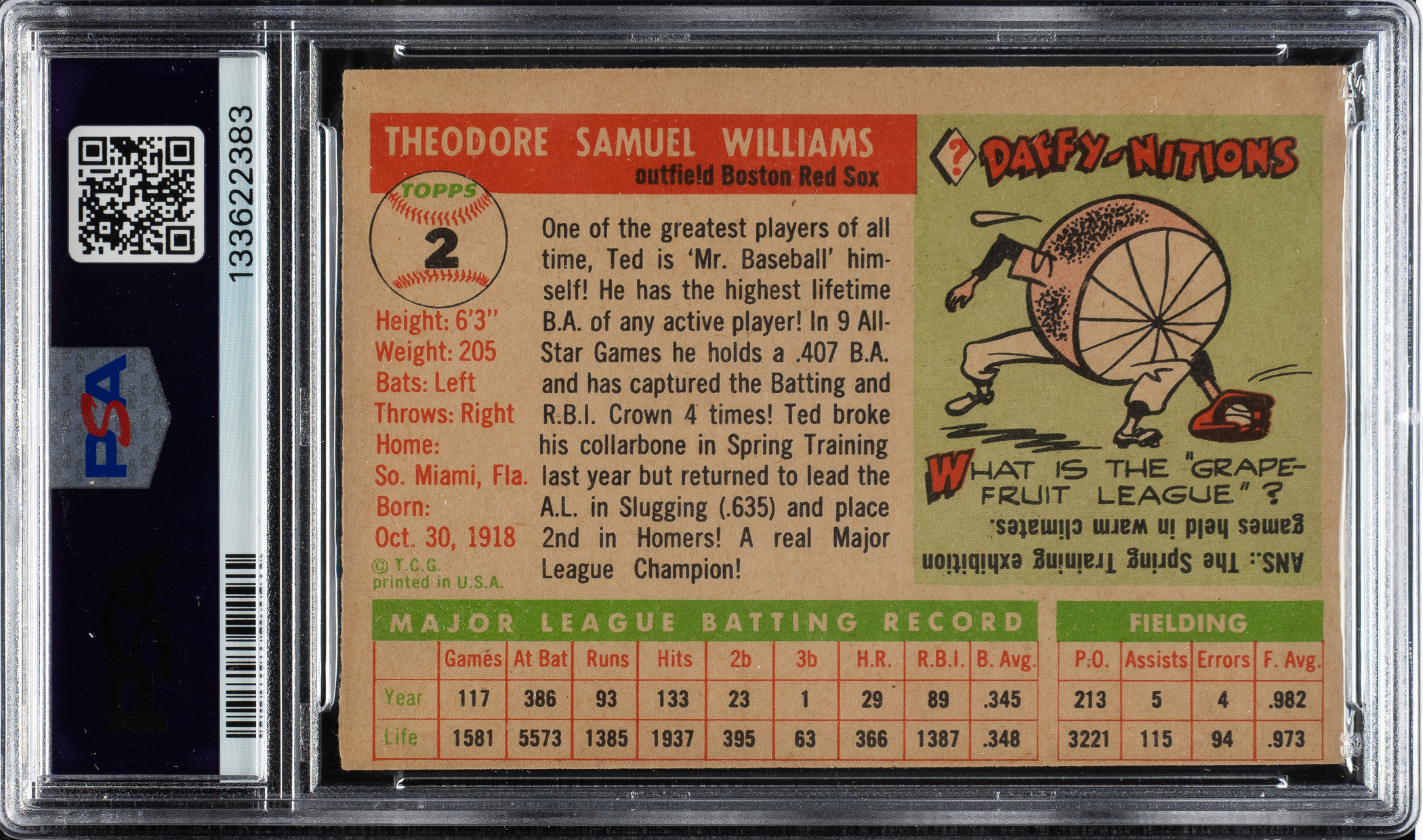 Graded NM 7 (OC) by PSA. Boston Red Sox Hall of Famer Ted Williams.