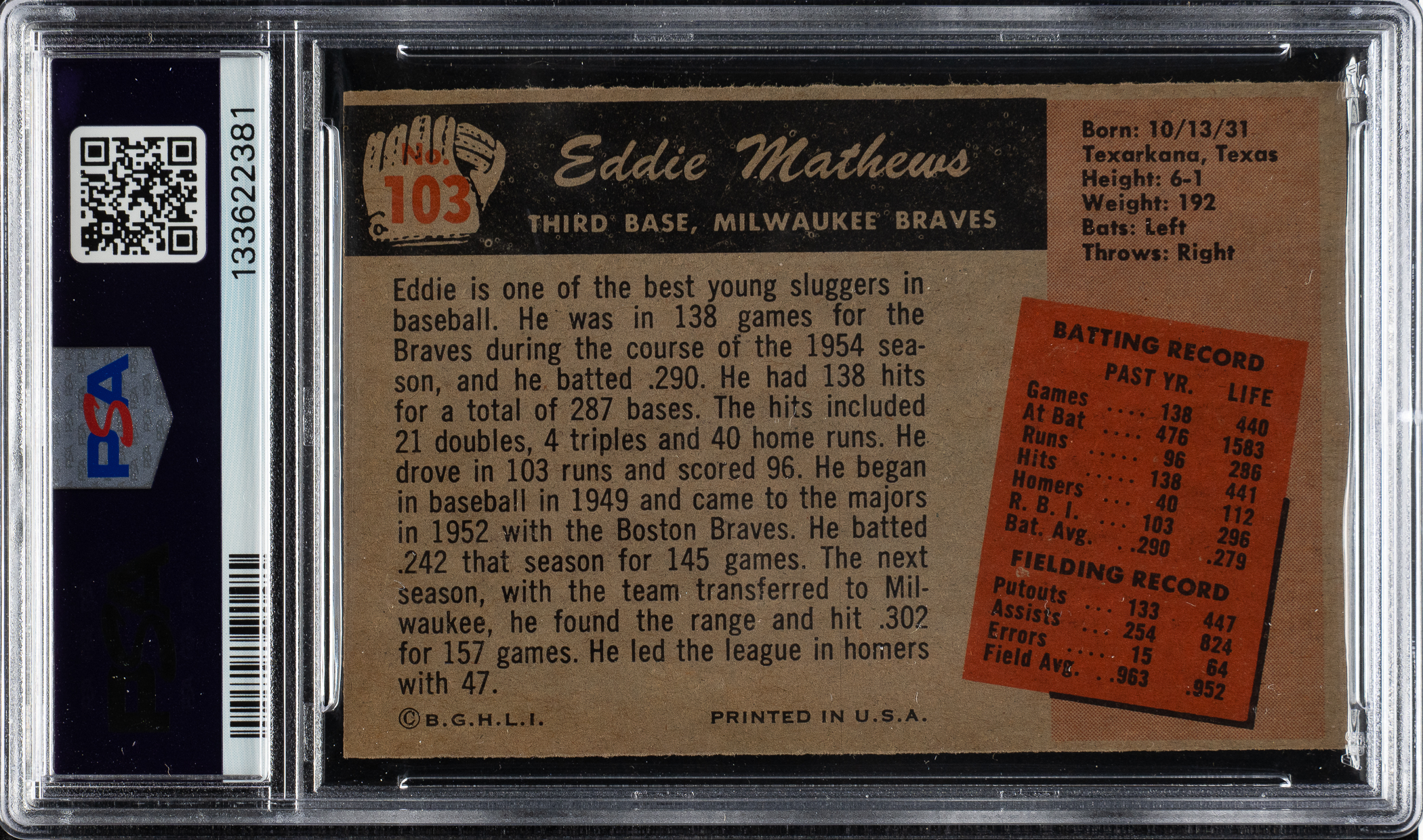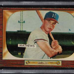 Graded NM 7 by PSA. Milwaukee Braves Hall of Famer Eddie Mathews.