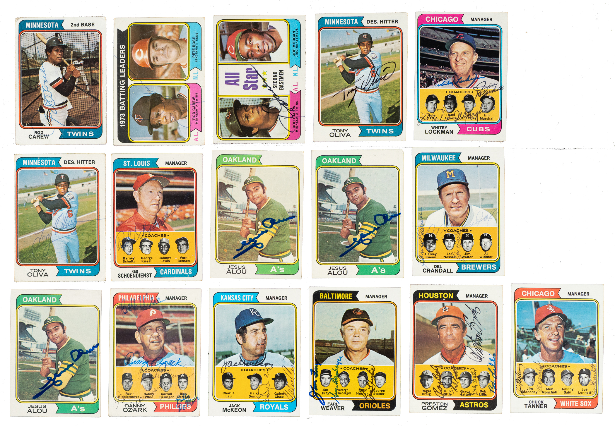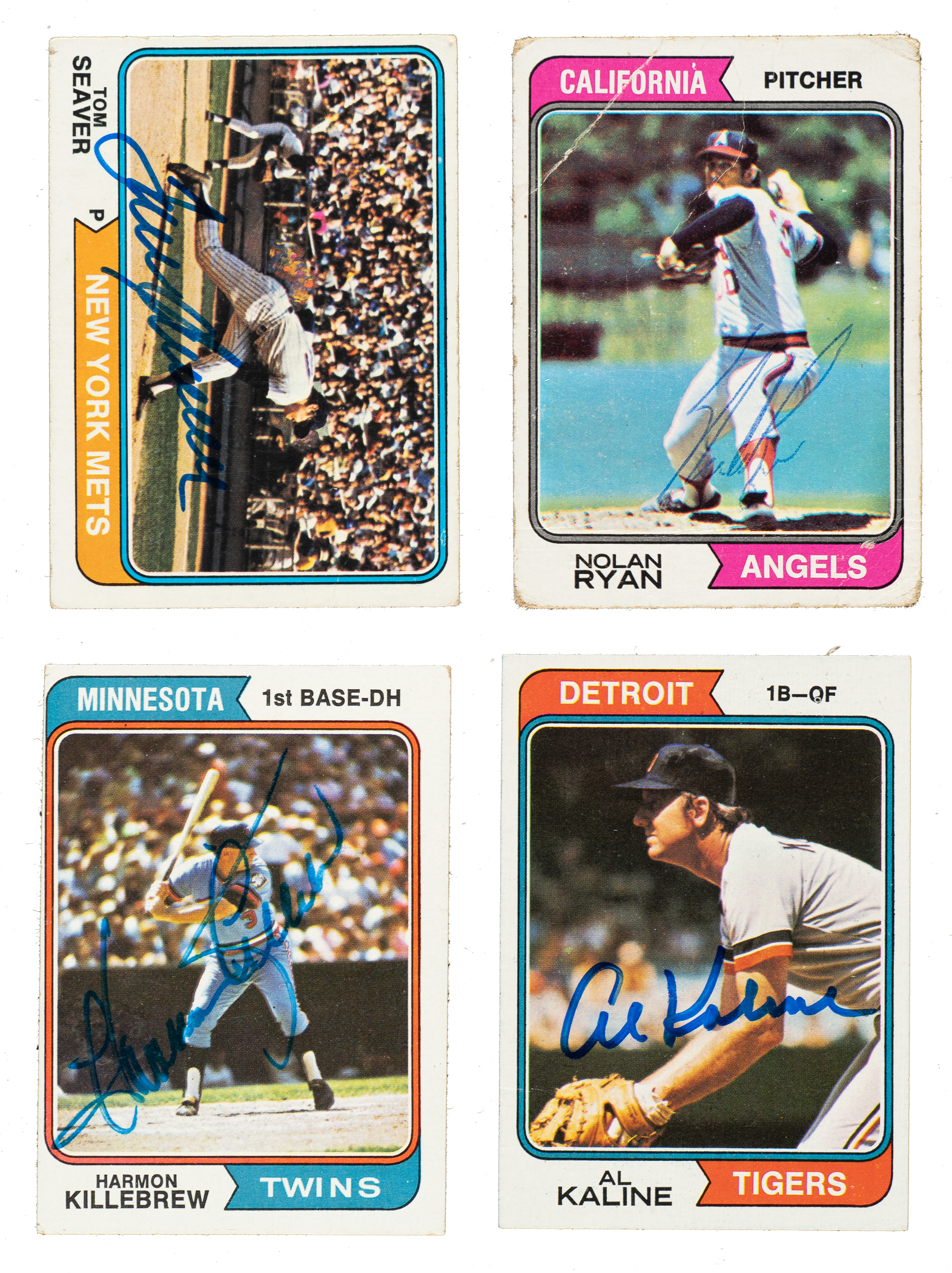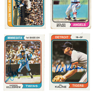 Collection of 326 signed cards from the 1974 Topps baseball set, including ten Hall of Famers and many stars. All the signatures, scripted in a variety of inks, appear on the front. Condition is 25% Ex to Ex-Mt (including some Nr/Mt), 65% Vg to Vg-Ex, and 10% lesser. This collection consists of the following: Two #13, 18, 20 Ryan (Pr-Fr), 21, fourteen 22, two 25, 31 (signed by Gomez, Craig, Kittle, Hatton, and Lillis, Vg-Ex+), 31 (signed by Kittle), 33, 34, 41, 42, 49, 50 Carew, 58, 64, 65, 77, two 79, 80 Seaver (Gd+), 82, 88, 99 (signed by Crandall, Kuenn, and Nossek), two 101, two 108, 113, 116, two 118, 119 (signed by Ozark, Ripplemeyer, Wine, Beringer, and DeMars, Gd+), 119 (signed Ozark), 123, 124, 128, 133, 151, 153, two 157, two 158, four 159, two 161, 163, 164, 166 (signed by McKeon, Dunlop, and Cisco), 166 (signed by McKeon), 169, 170, 171, three 172, 183, 186, 187, two 190 Oliva, two 191, 192, 196, thirteen 197, 200, 201 Carew/Rose Batting Ldrs (signed by Carew), 210, 215 Kaline, 216, four 217, 221 (signed by Tanner), three 221 (signed by Mahoney, Monchak, and Lonnett), two 225, 227, two 234, 236 (signed by Schoendienst), 236 (signed by Lewis), 237, 241, 243 (personalized), 247, 256, 261, two 266, 268, 269, two 276 (signed by Winkles), 292, 294, 296, 298, 301, 306 (signed by Frey, Bamberger, and Hunter), 307, two 308, 315, 322, two 324, two 327, 328, 333 Carew/Morgan AS (signed by Carew), 336 Murcer/Rose AS (signed by Murcer), 342, 347, 352, 353, 354 (signed by Lockman, Martin, Spangler, and Marshall), three 357, 359, two 365, 373, 391, 397, 400 Killebrew, 402, two 403 (signed by Johnson), 407, 412, 413, two 418, two 423, twelve 430 M. Alou, 434, 439, 441, 442, 443, 445, 449, two 465, 466, four 467, two 468, 472 (signed by Knowles), 474 (signed by Campaneris), 478 (signed by Campaneris), two 481, 485, 493, 497, 503, 507, two 509, two 511, 514, fifteen 516, 520, 524, two 526, 531 (signed by Mauch and McLish), 536, 541 (signed by Aspromonte), 545, two 547, two 556, 558, 570, 571, 572, two 573, 577, two 578 Houk, two 580, two 583, two 587, 588, two 590, 595, 597 (signed by Mackanin and Trillo), 600 (signed by Madlock), sixteen 603 (signed by Robles), 603 (signed by Moore), 603 (signed by Robles and Moore), 603 (signed by Foote, Lundstedt, and Moore), 605 (signed by Albury and Tanana), 605 (signed by Tanana), three 605 (signed by Albury), 611, 617, 618, 621, 622, 624, 626, 631, 636, 642, 645, 648, two 653, three 654a J. Alou/no position on front, 657, 660, 23T, 42T, 51T, 123T, three 151T, 186T, 348T, three 428T, six 516T, and two 543T. Total: 326 signed cards. Auction LOA from James Spence/JSA.